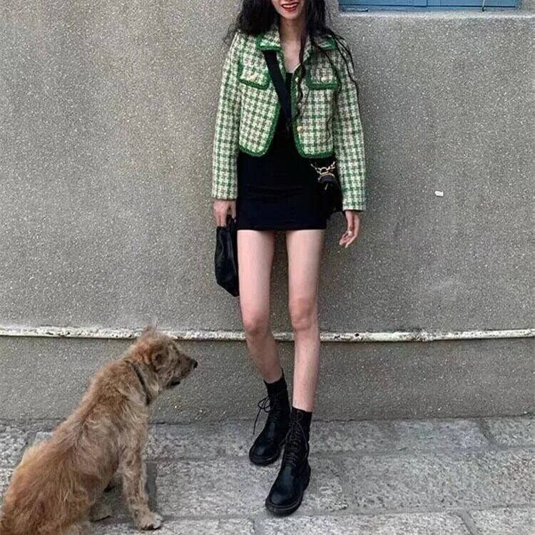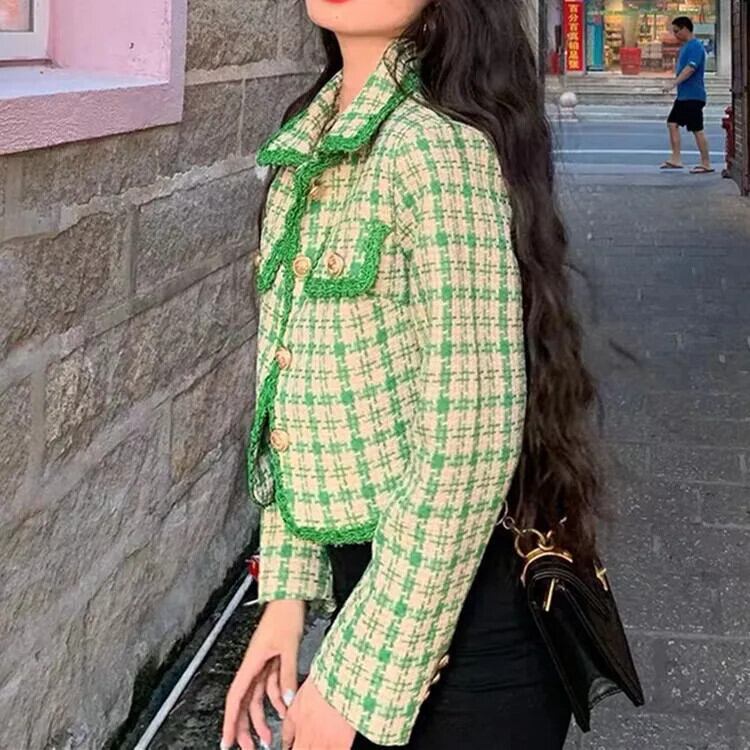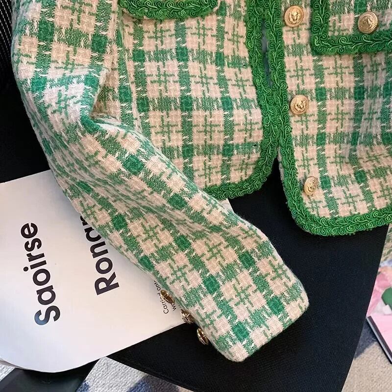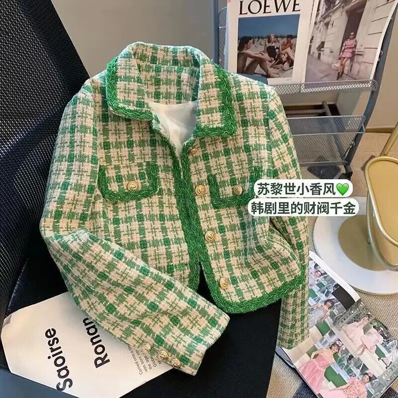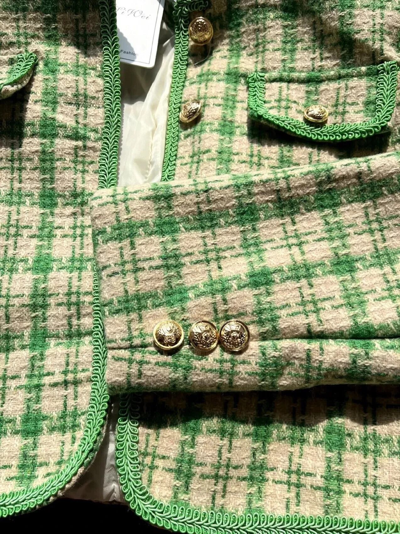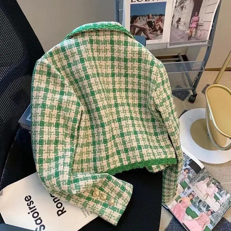 フレグランスグリーンチェック柄フレンチスーツコートレディースショート春秋ブレザー スプリング 春物 オータム 秋物