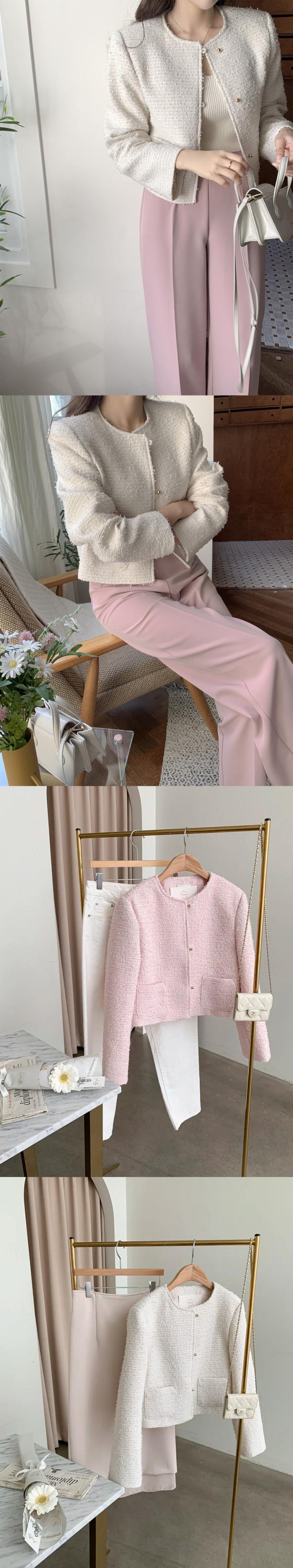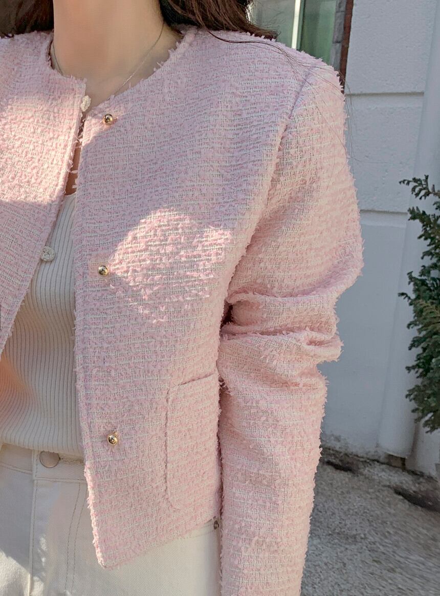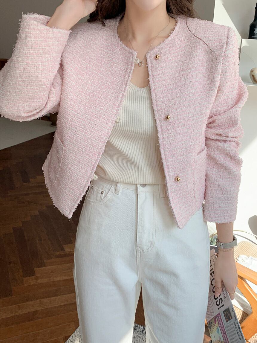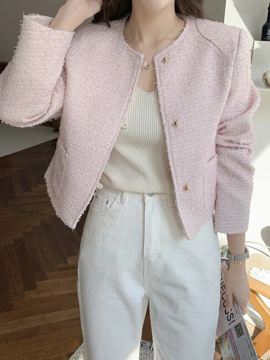 春ラウンドネックメタルバックル気質香りよい混合色粗いコートショートジャケット スプリング 春物 Oネック