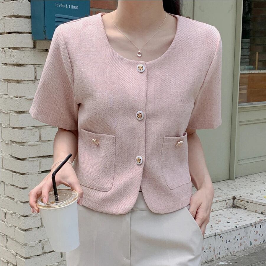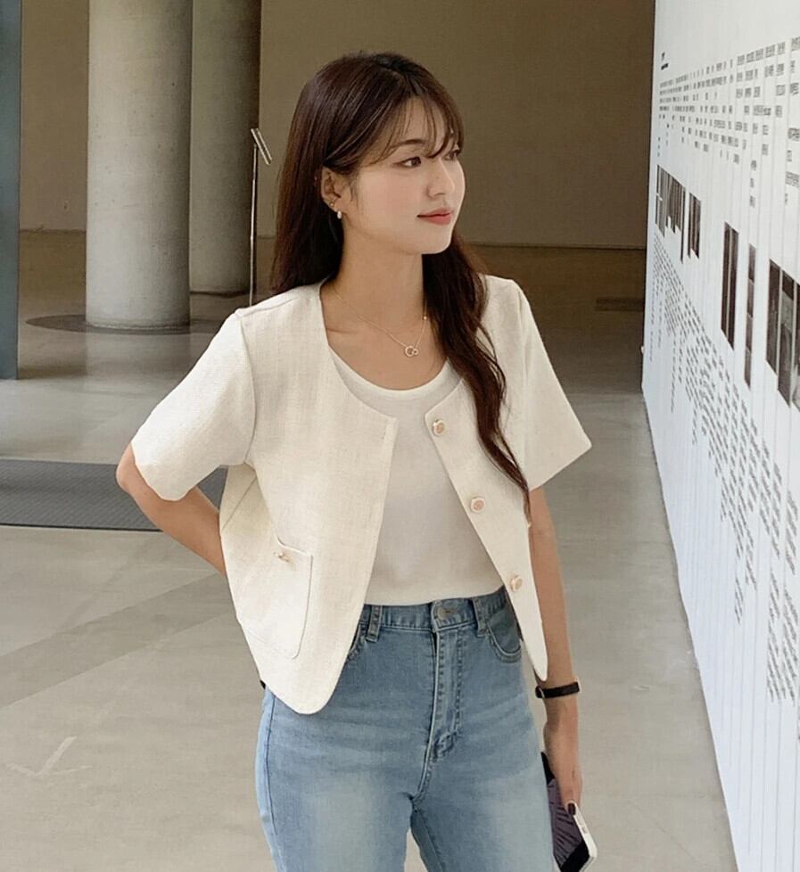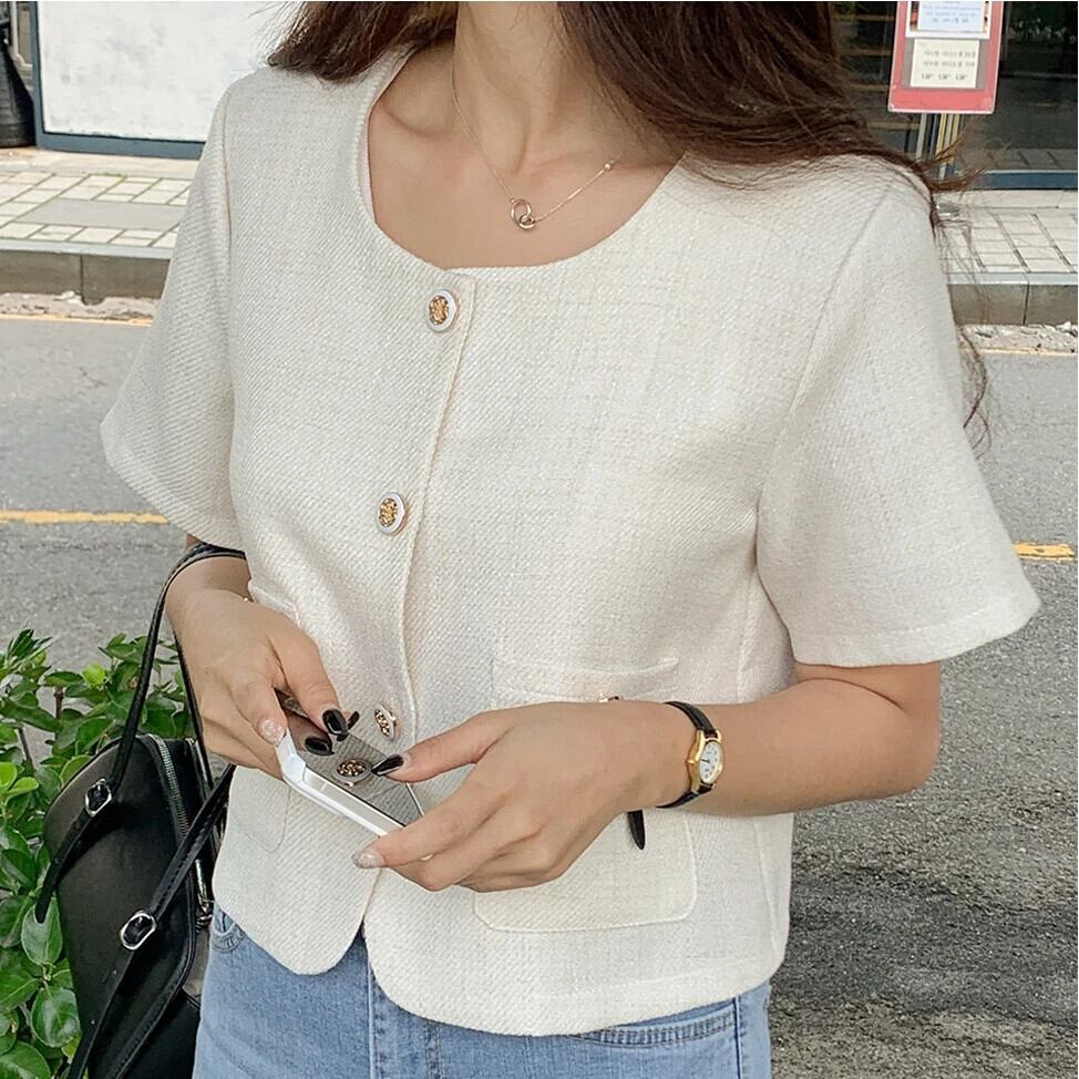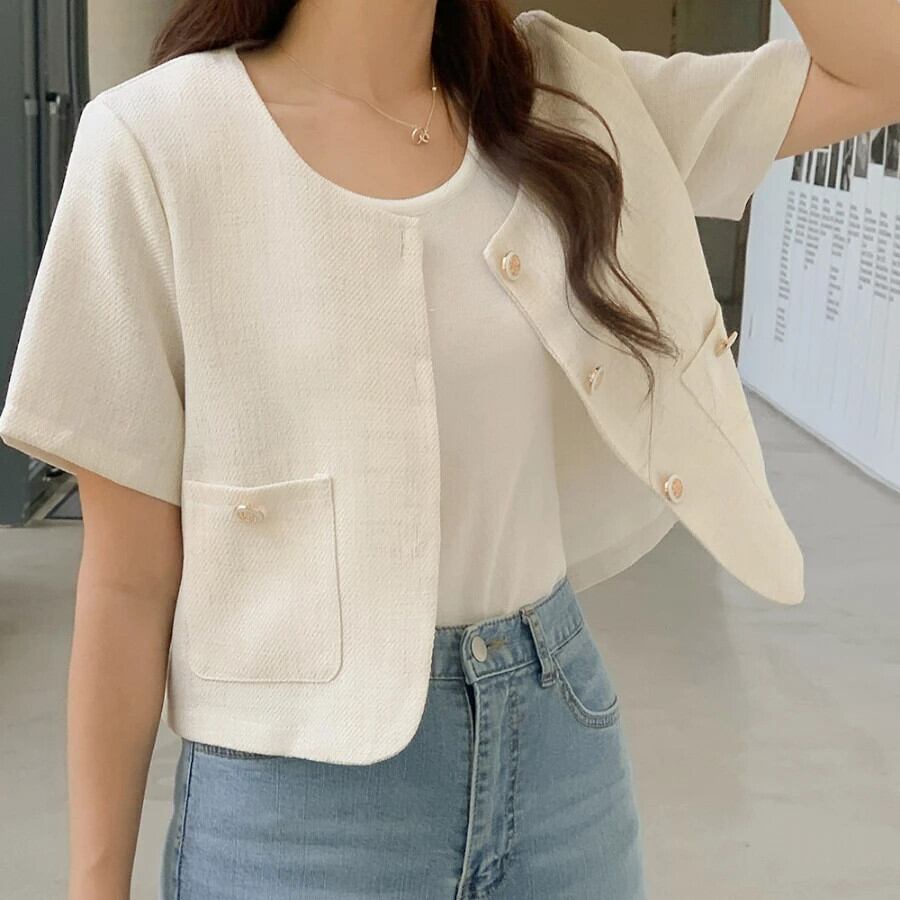 サマースタイルジャケットボタン挿入ポケット半袖香りノーカラー万能ショートコート ハーフスリーブ 夏物