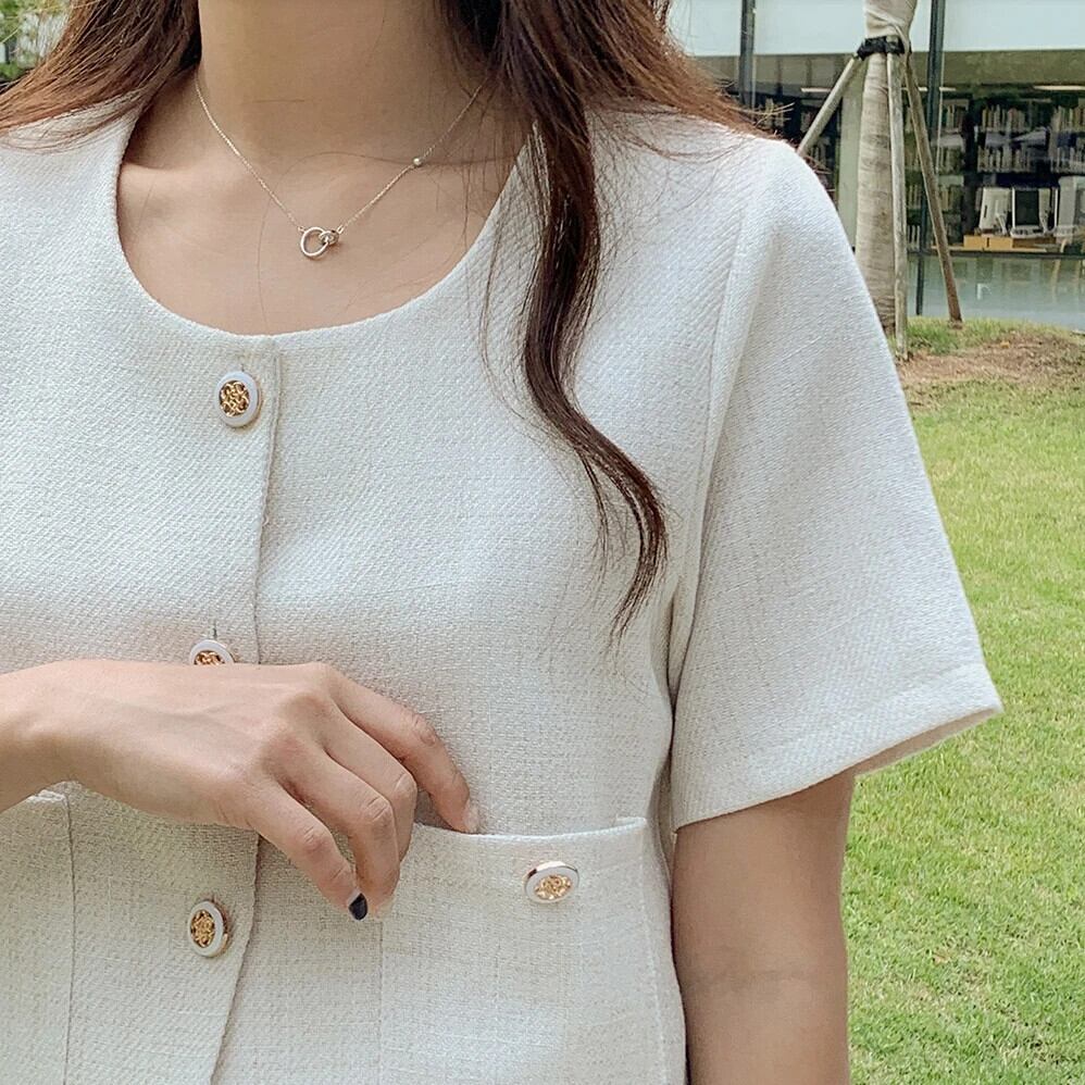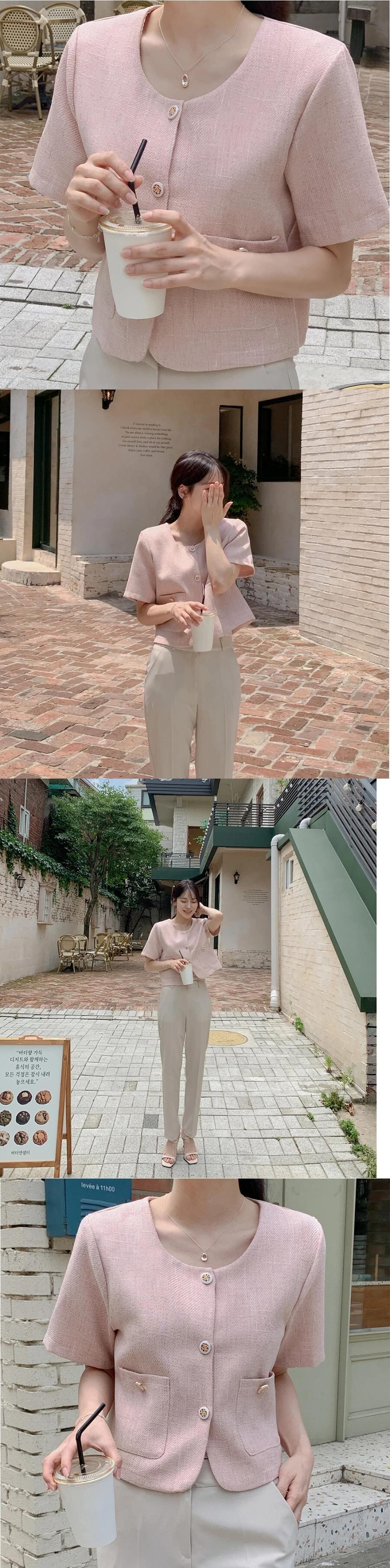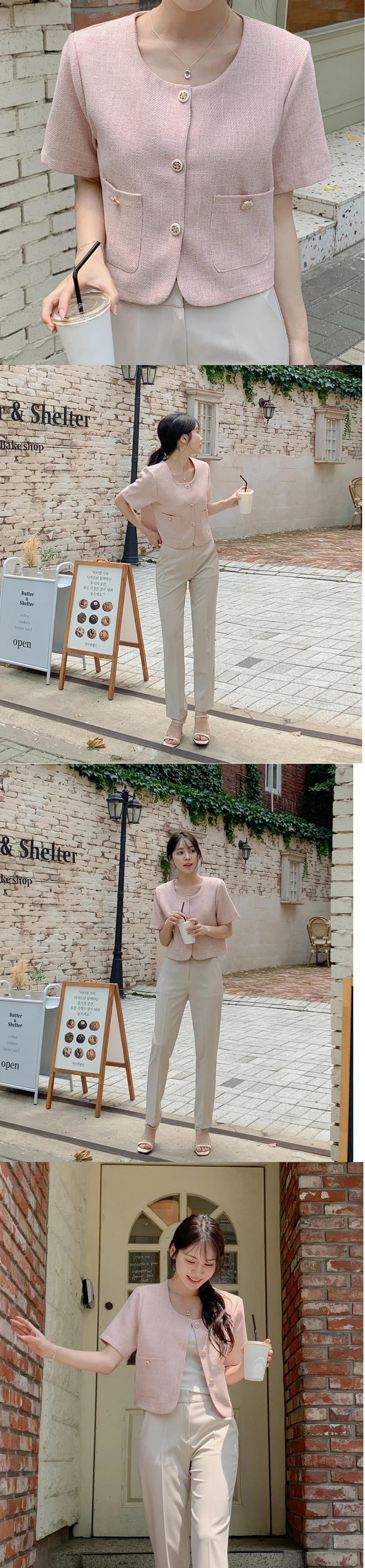 サマースタイルジャケットボタン挿入ポケット半袖香りノーカラー万能ショートコート ハーフスリーブ 夏物