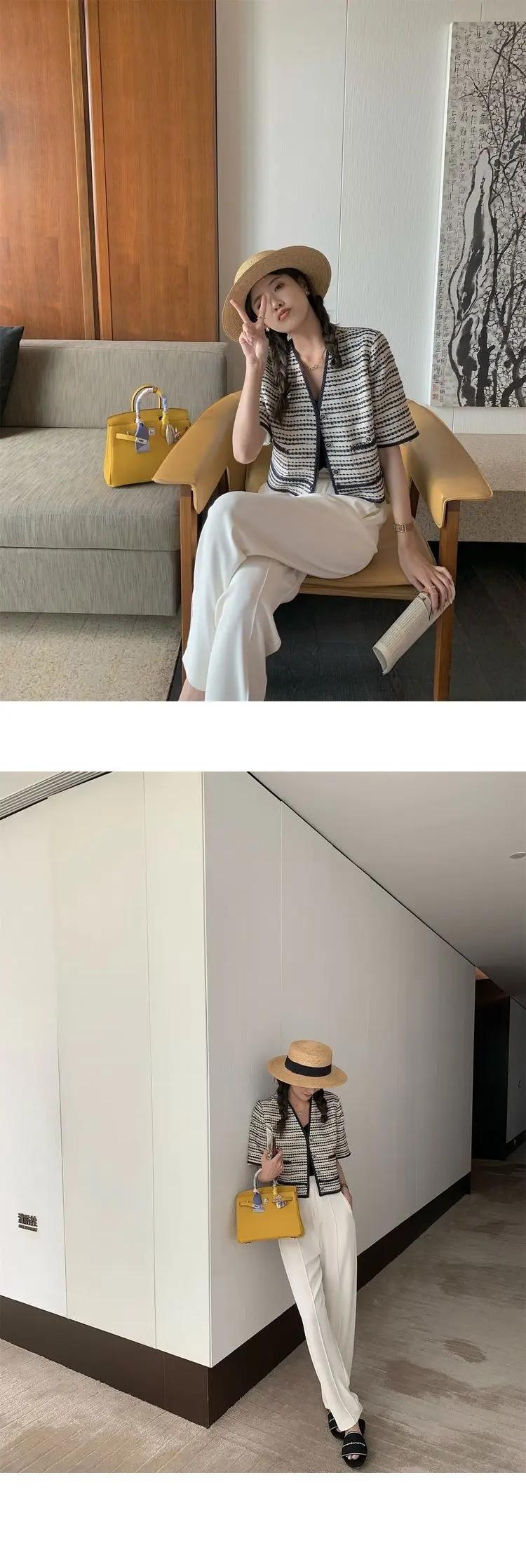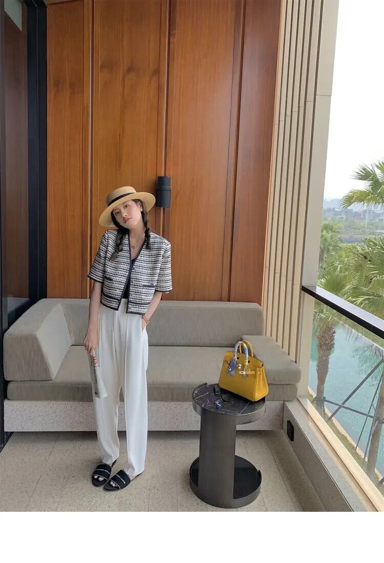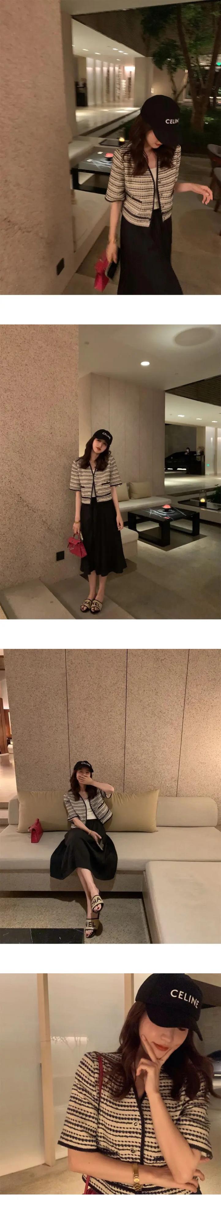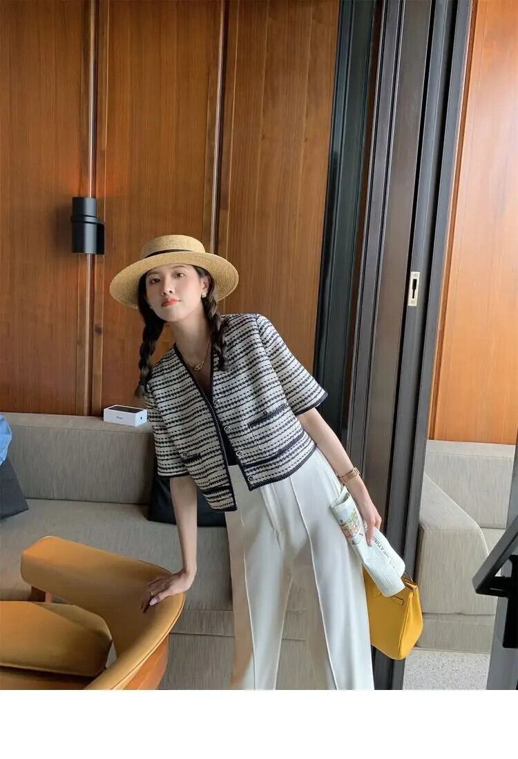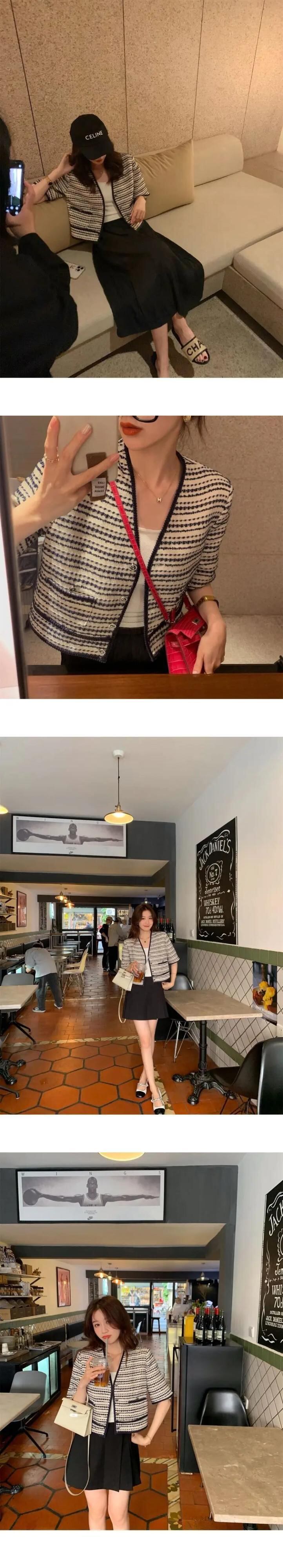 ストライプ薄い香り良いチェック柄半袖コート夏フレンチ V ネック Laides ジャケット ショート ハーフスリーブ サマー 夏物 Vネック