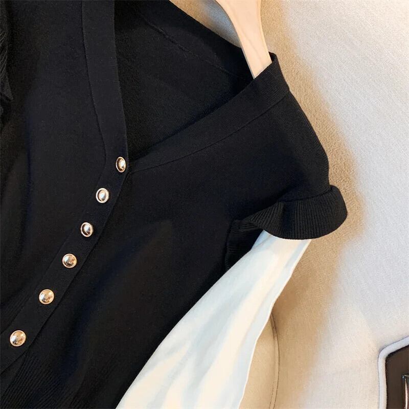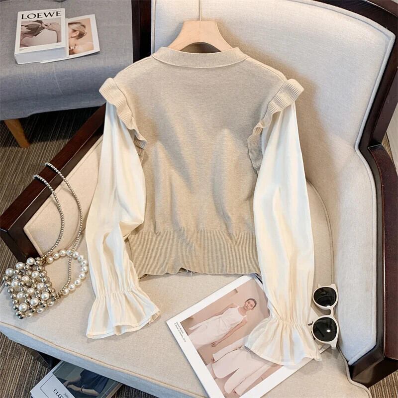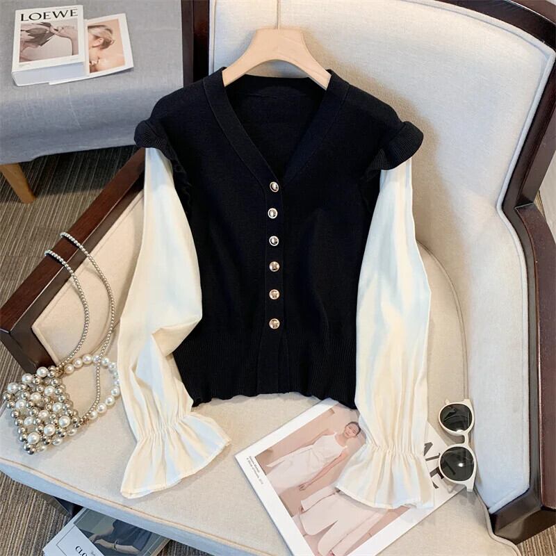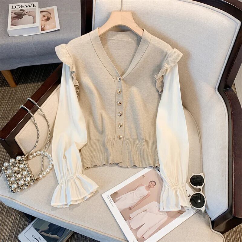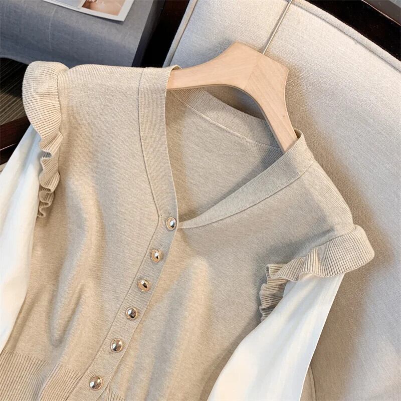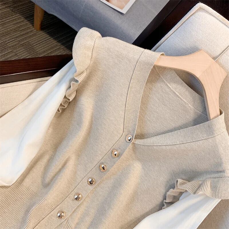 秋フリル V ネックニットカーディガンメタルシングルブレストパッチワークフェイクツーピース長袖セーター ロング オータム 秋物 Vネック