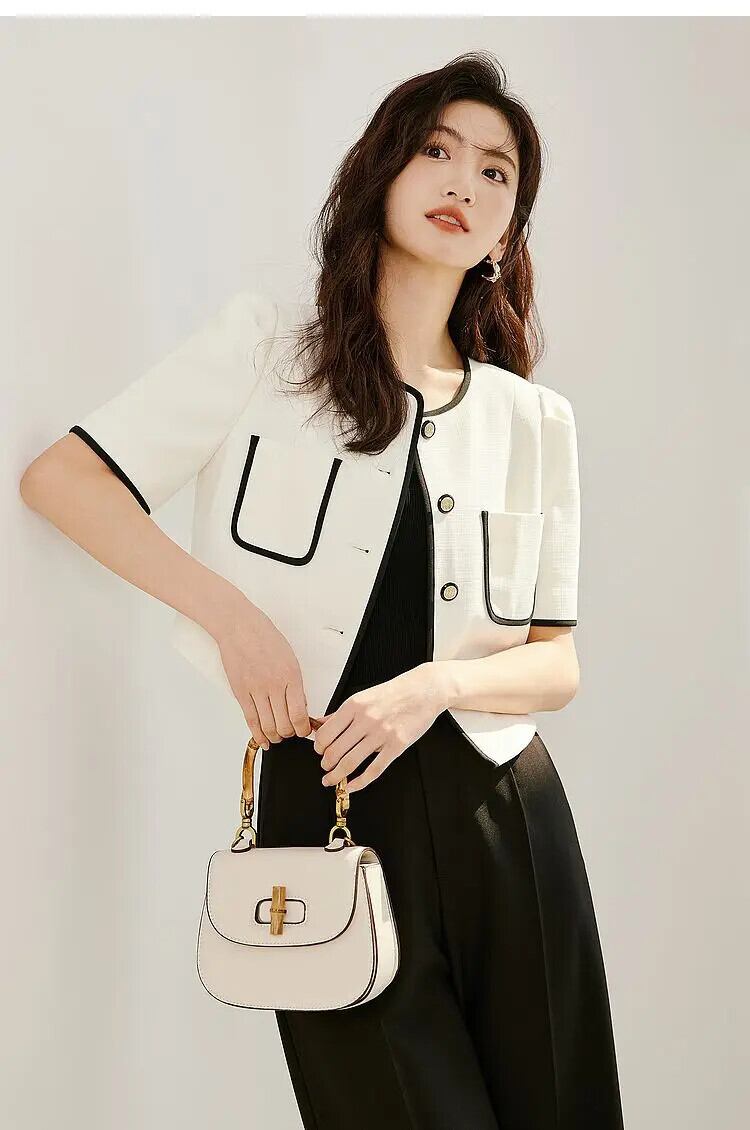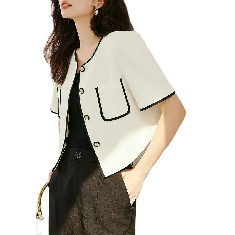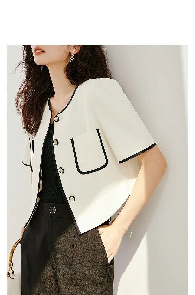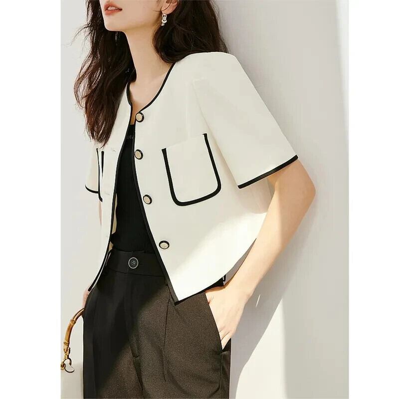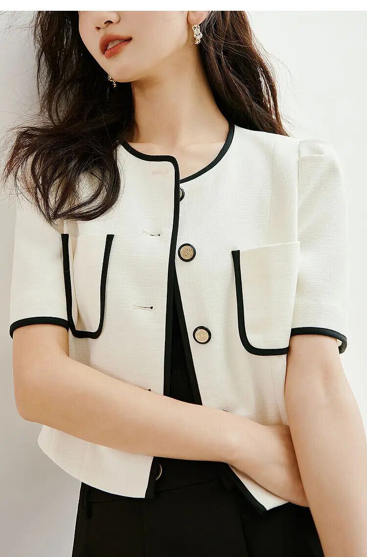 夏コントラストエッジラウンドネックフレグランスショート白衣シングルブレストジャケット ホワイト サマー 夏物 Oネック