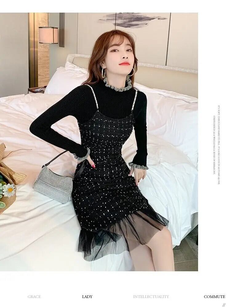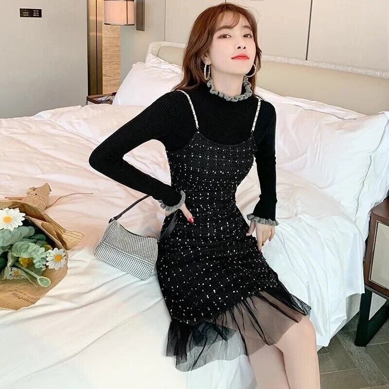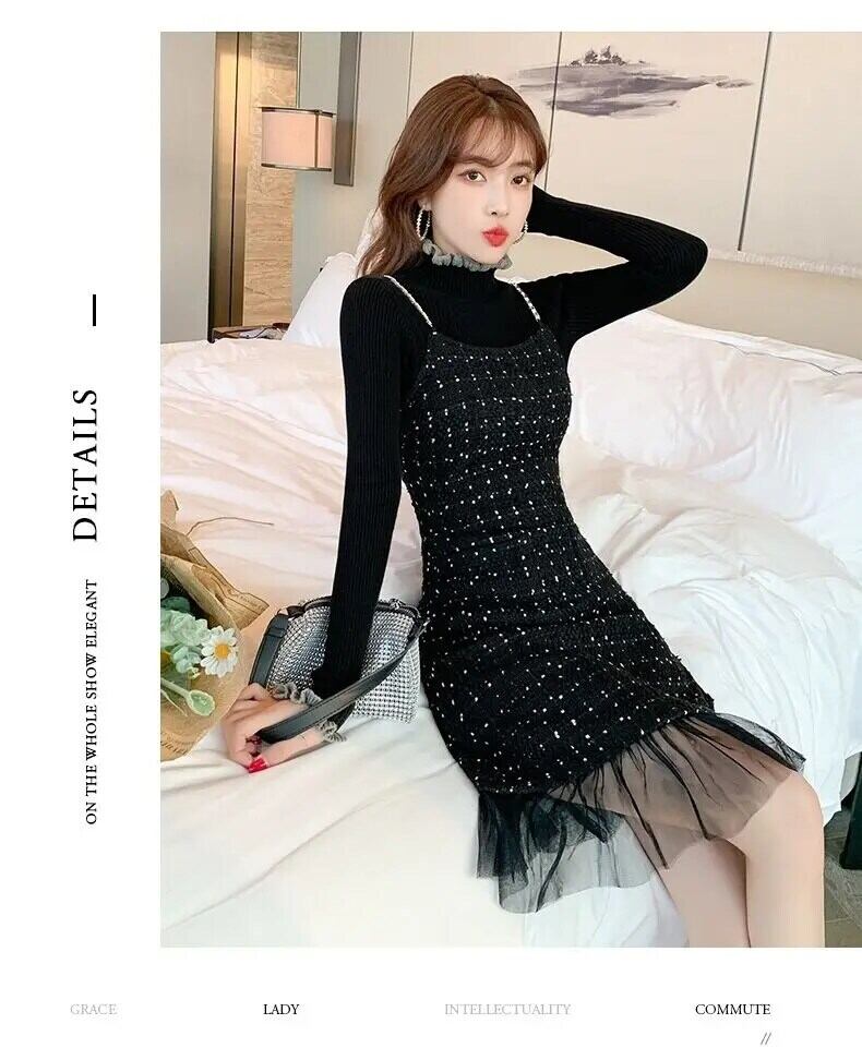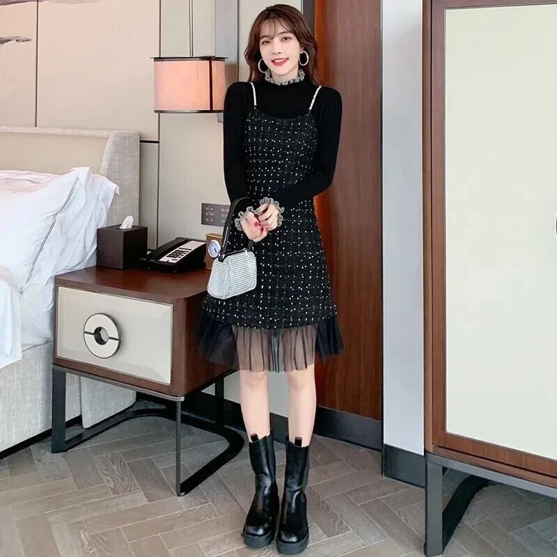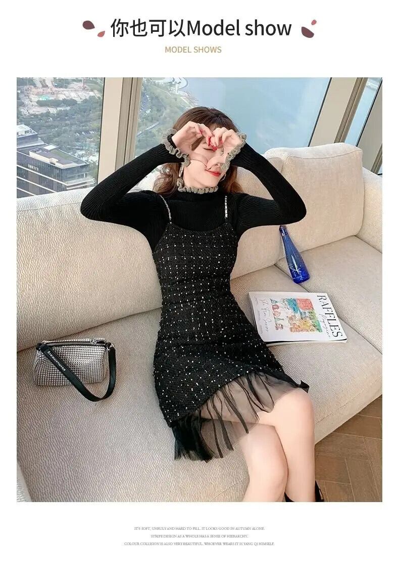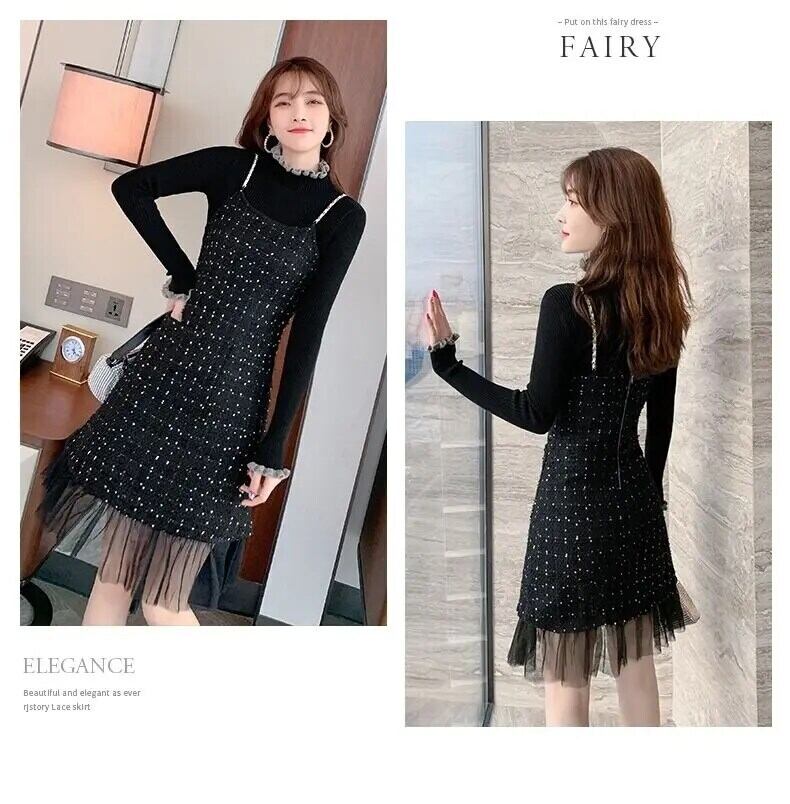 春秋木製耳エッジセーター黒 + ストラップ粗いウールドレス 2 点セット/スーツ ブラック スプリング 春物 オータム 秋物