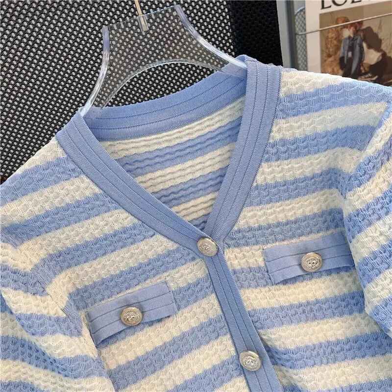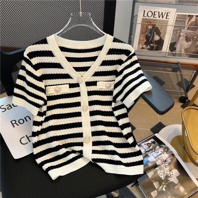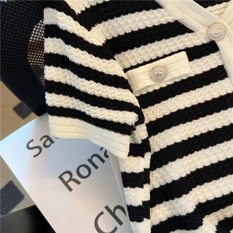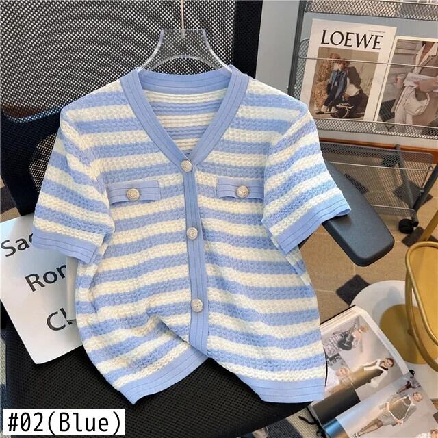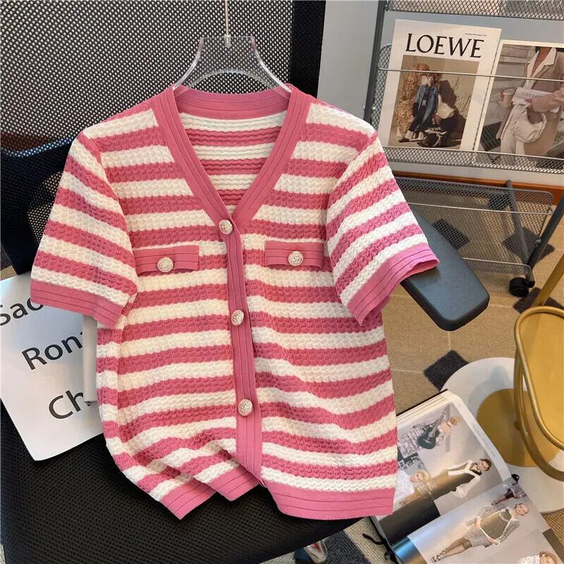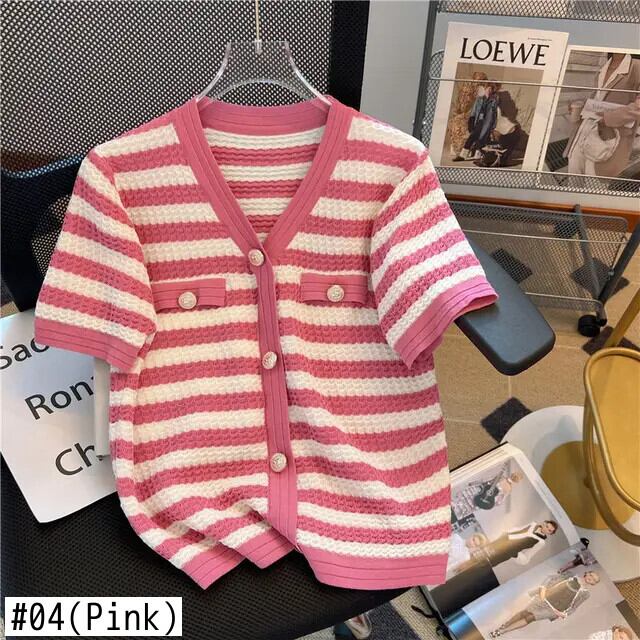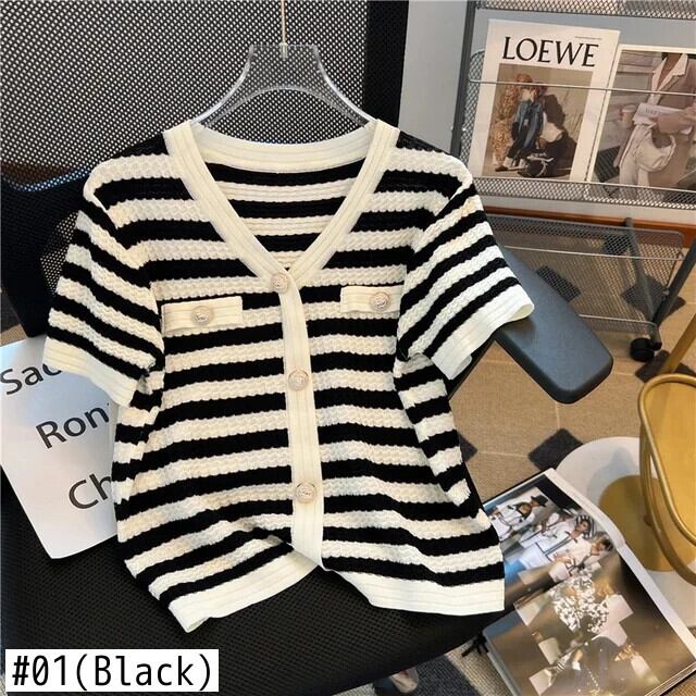 レディースサマーフレグラントストライプアイスニットトップ半袖Tシャツ ショート ハーフスリーブ 夏物 シルク