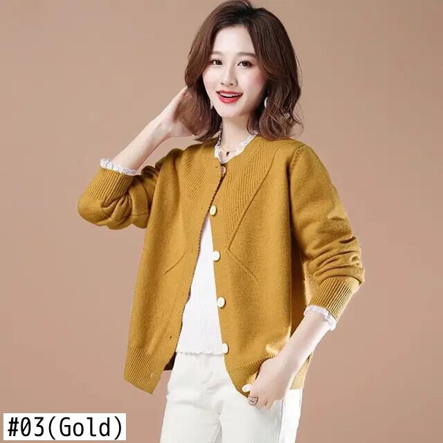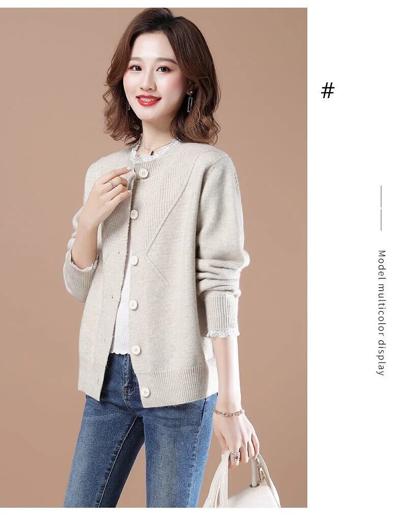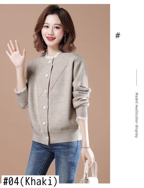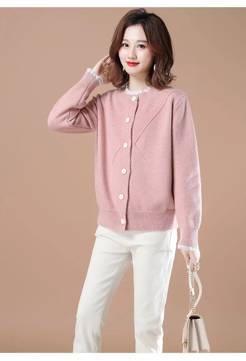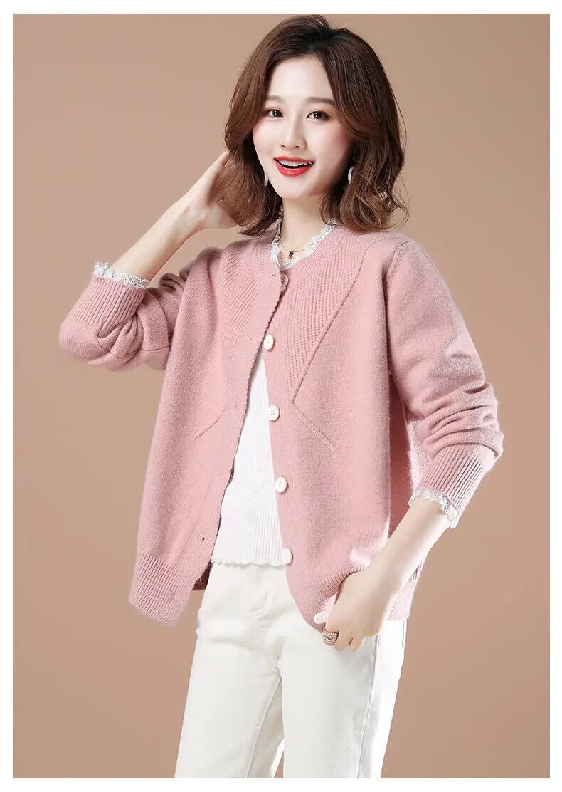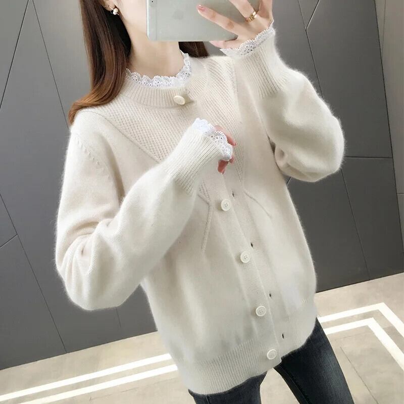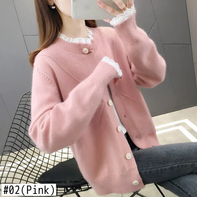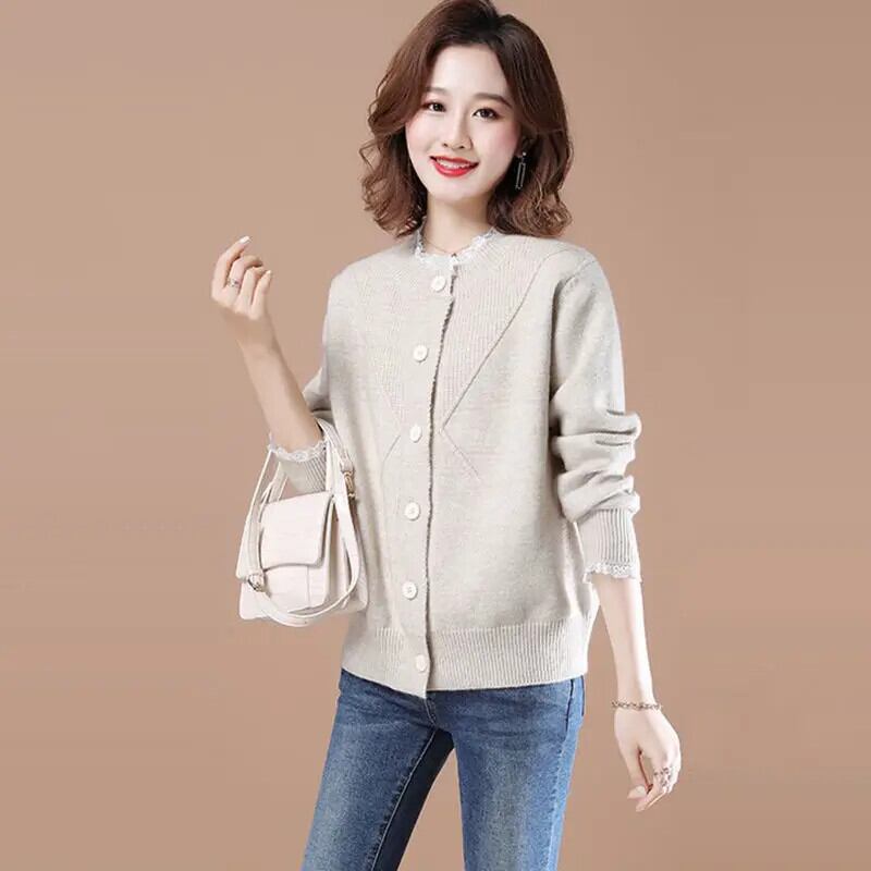 春レースニットカーディガンソリッドカラーラウンドネックルーズセーターレジャーシック スプリング 春物 Oネック