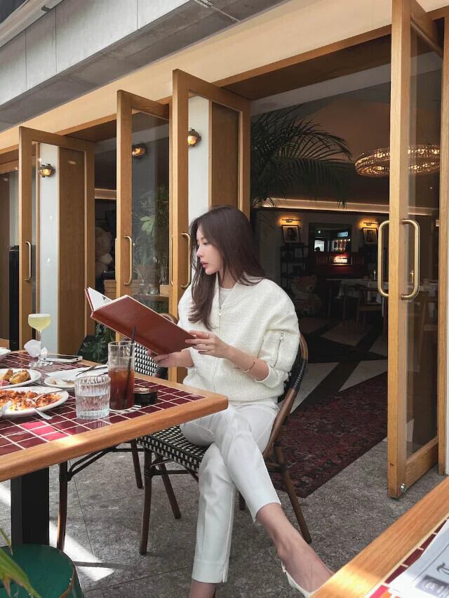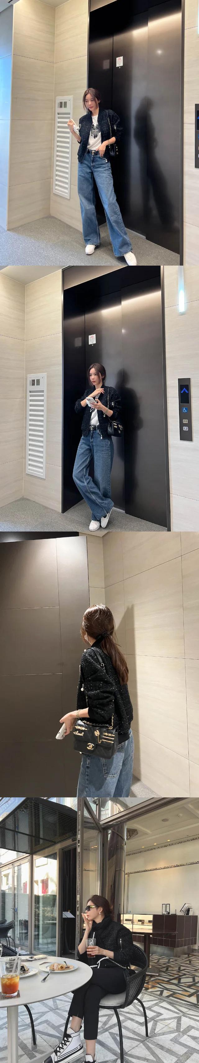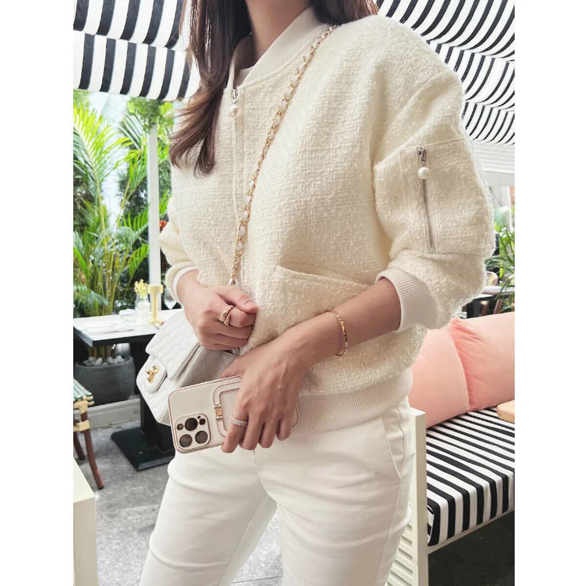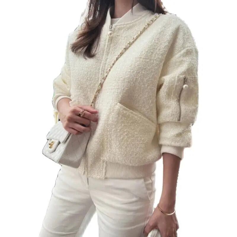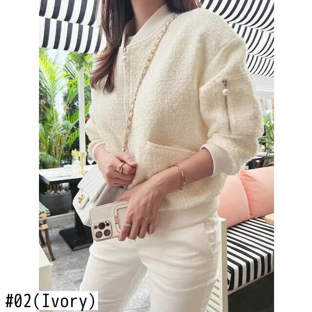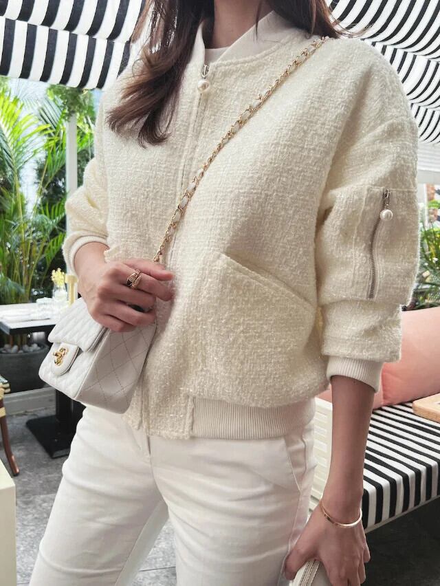 ポケット O ネックジッパーツイードウールジャケット長袖ブレンドコート春秋 ロング スプリング 春物 オータム 秋物 Oネック