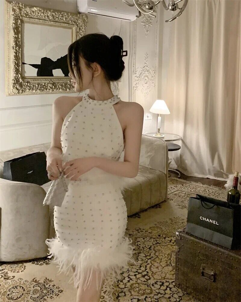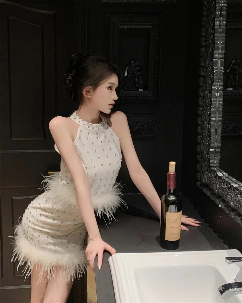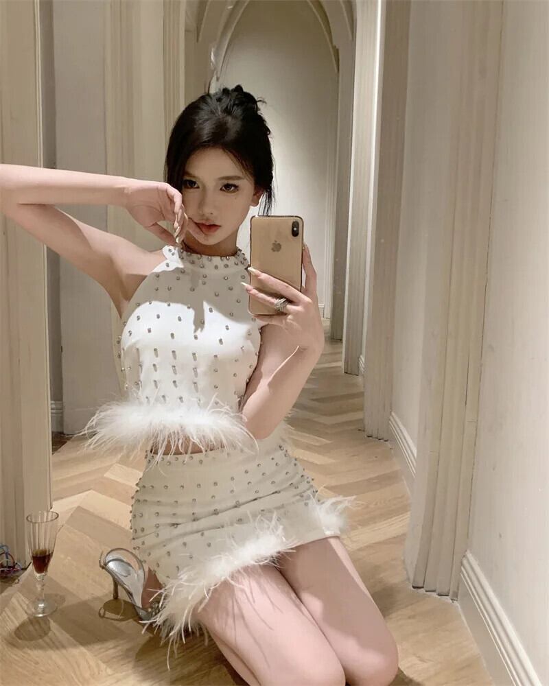 レディース夏重工業ダイヤモンドハンギングネックフェザートップ+Aラインスカートセット/スーツ サマー 夏物