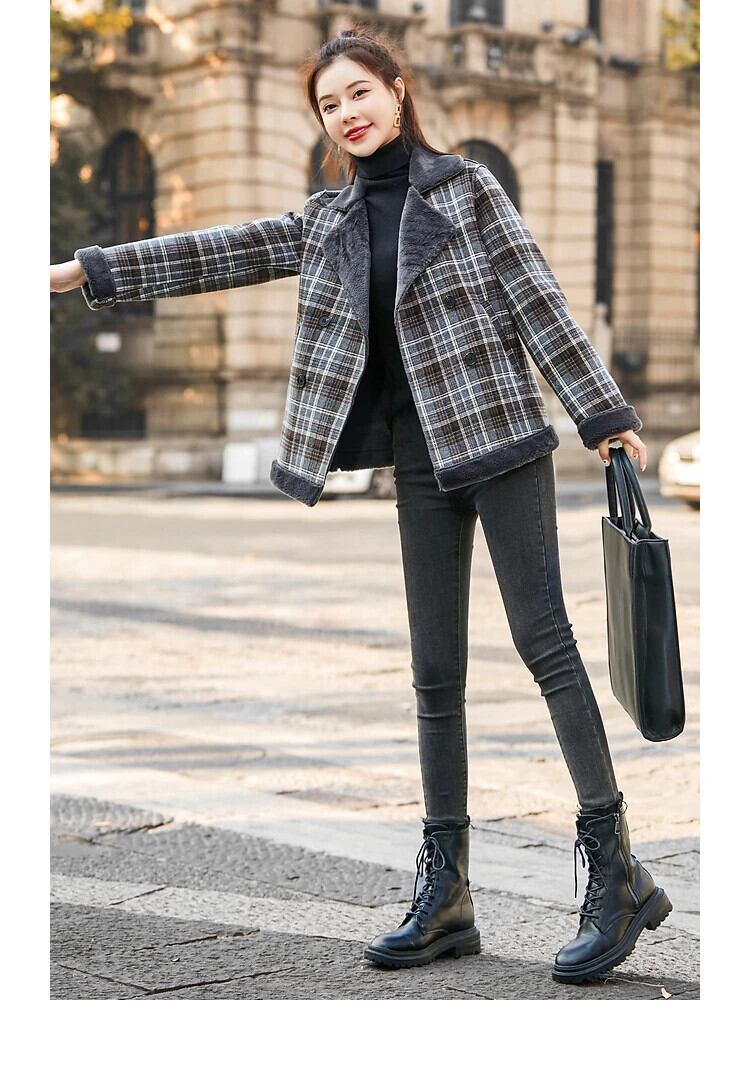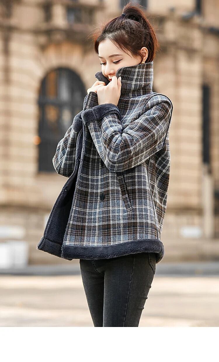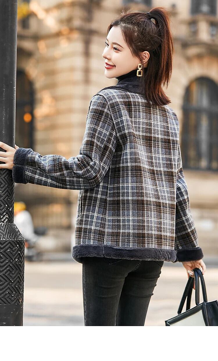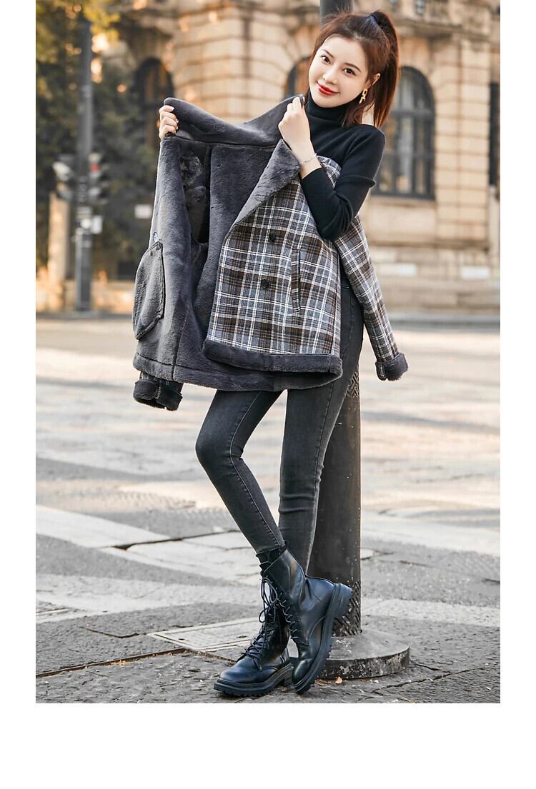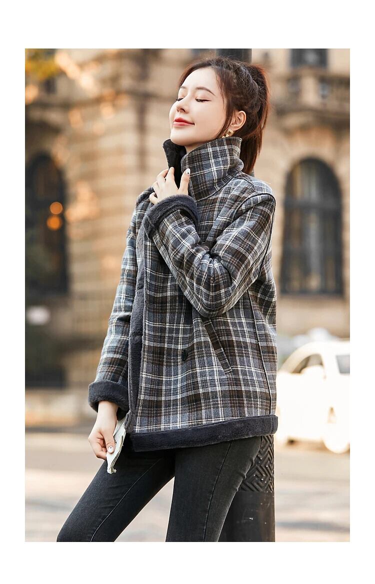 冬レトロチェック柄ダブルブレスト暖かいイミテーションファーコートルーズジャケット ウィンター 冬物