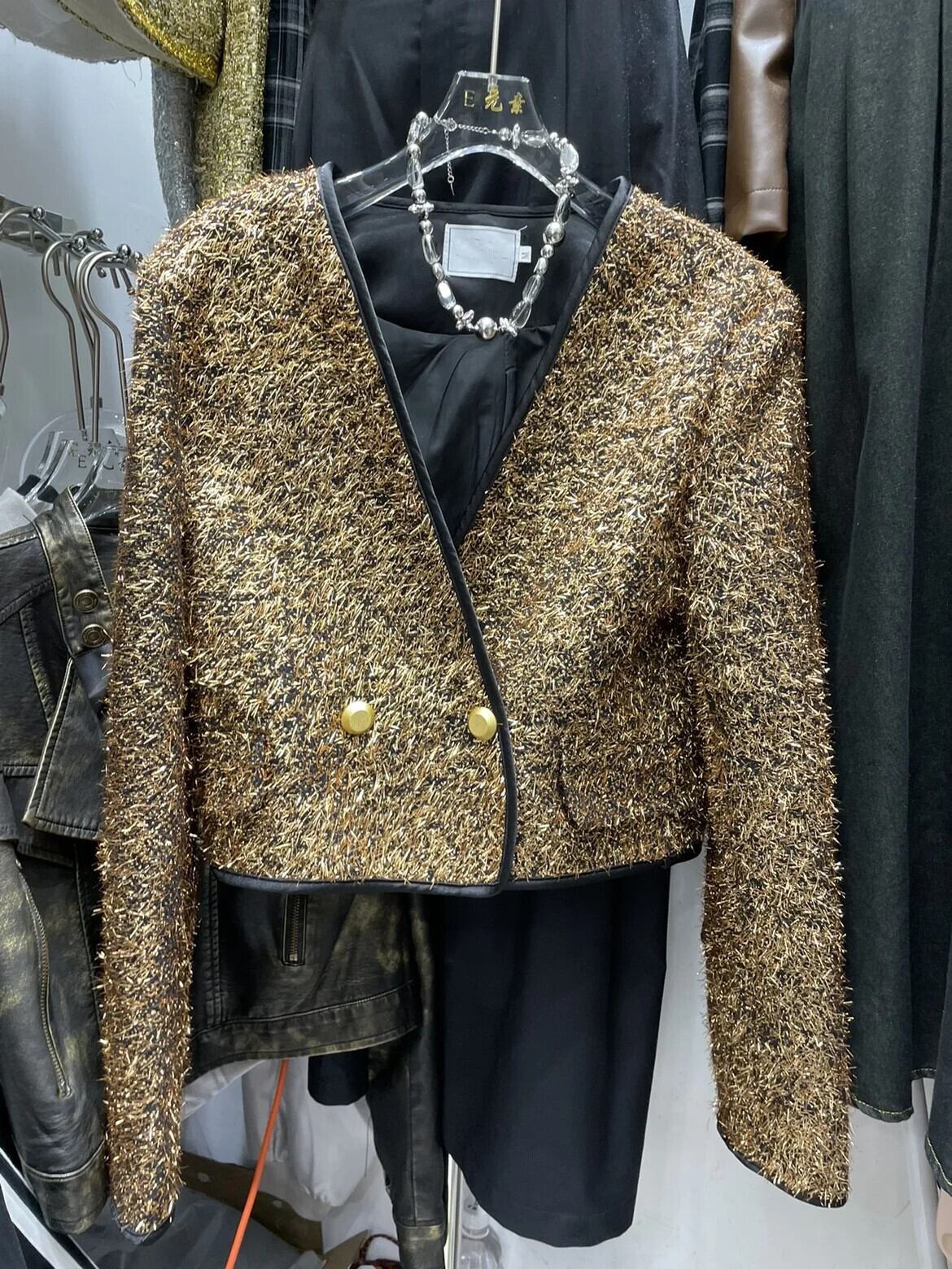 秋気質香りコート V ネック ゴールド ブラック ジャケット オータム 秋物 Vネック