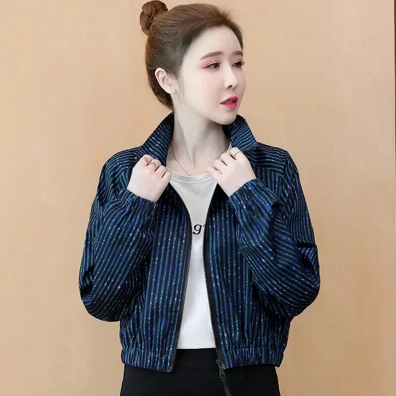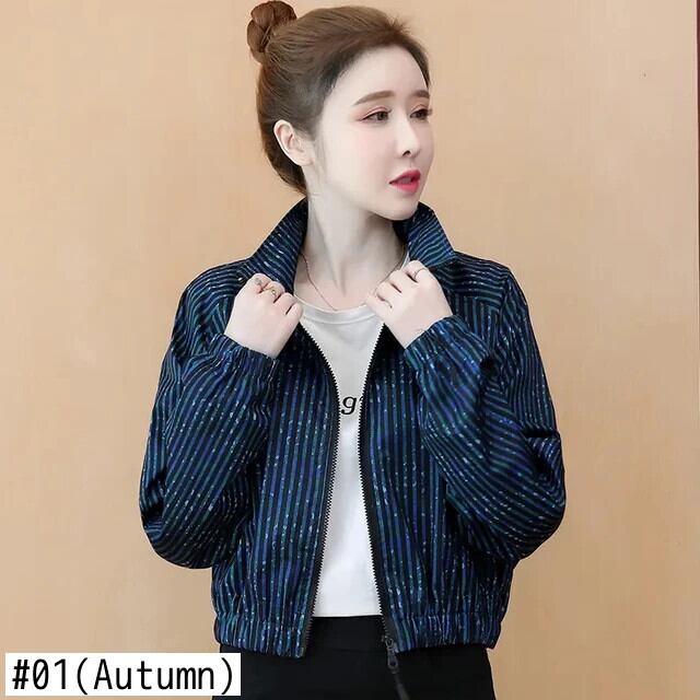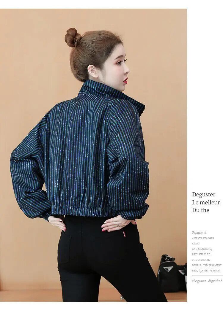 ショートコート レディース 冬 秋 ブルー プリント ストライプ ジャケット 野球 オータム 秋物 ウィンター 冬物