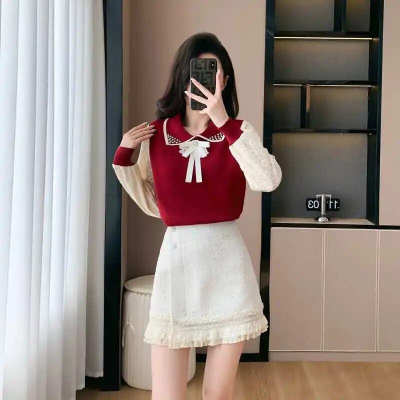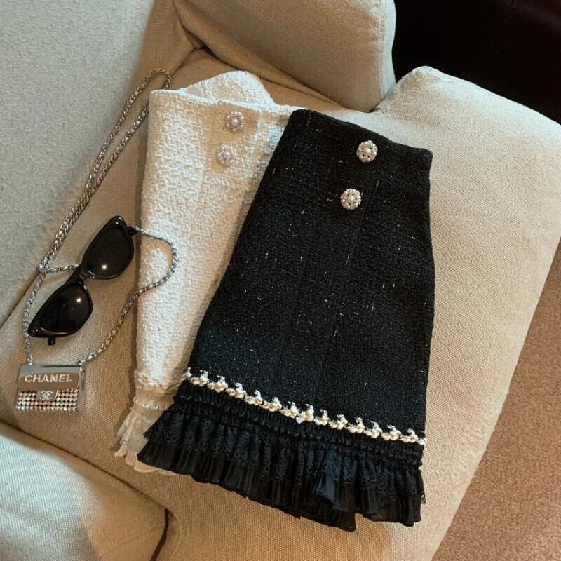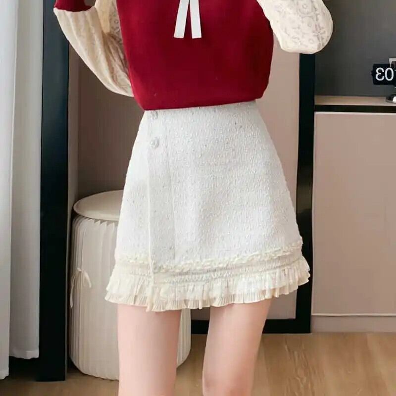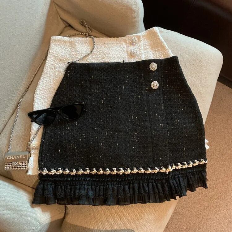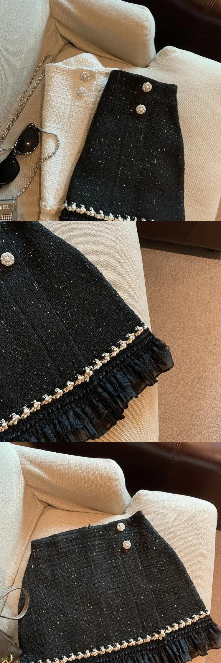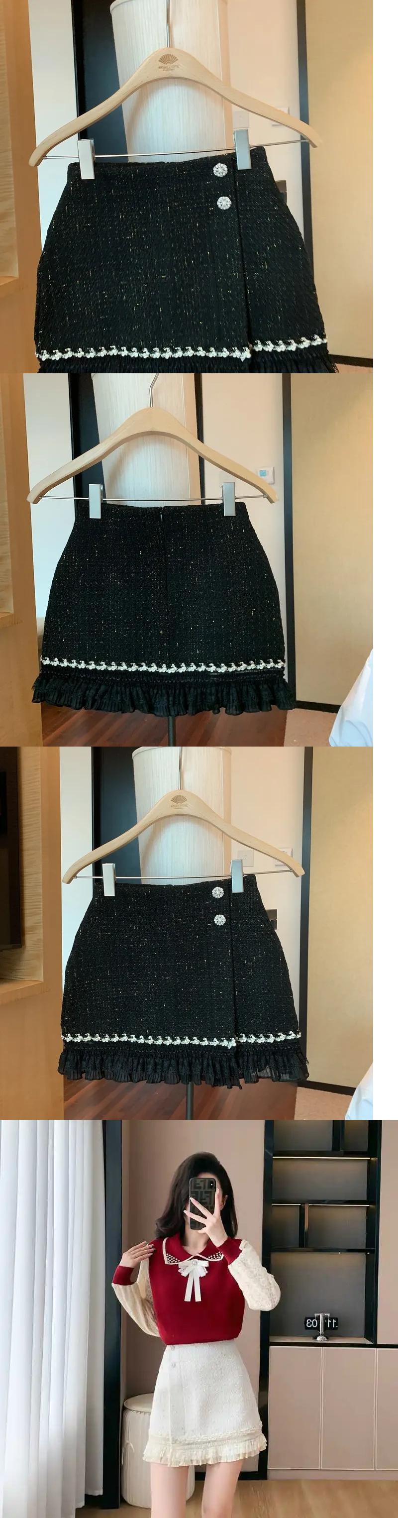 秋冬テルスタッズダイヤモンドフレグランスブラックレーススプライシングスカート オータム 秋物 ウィンター 冬物