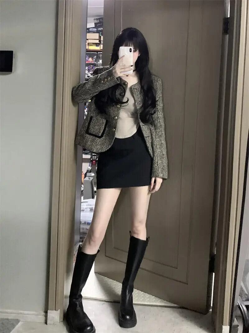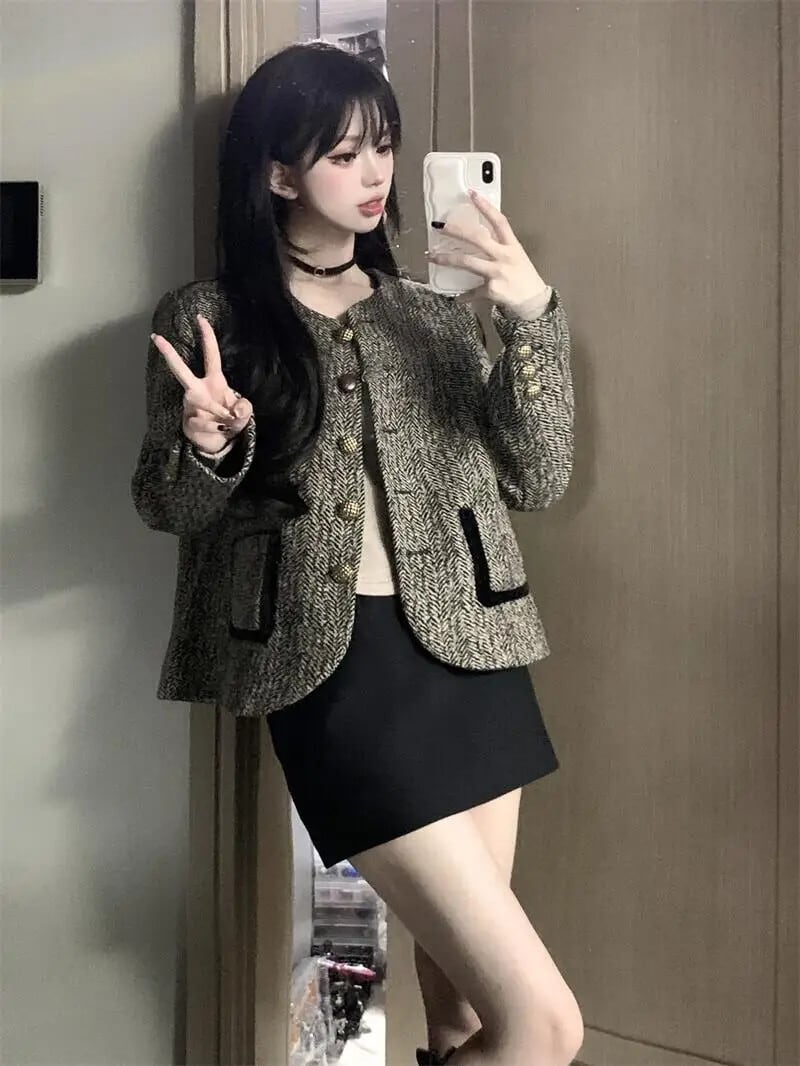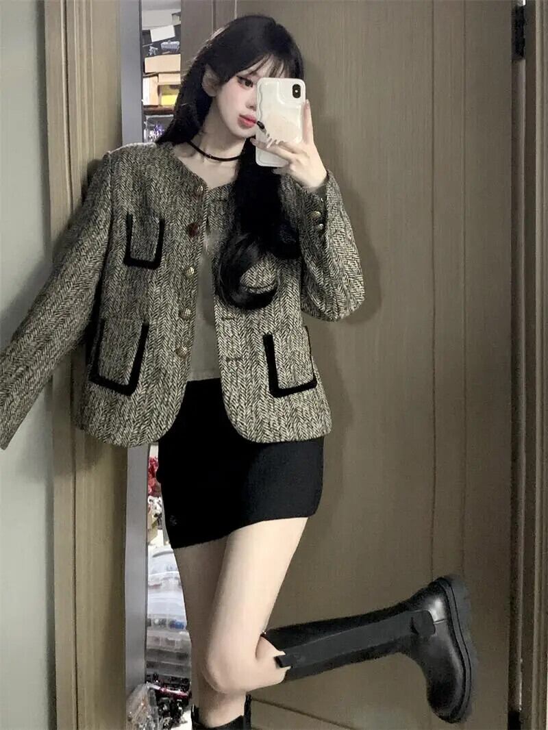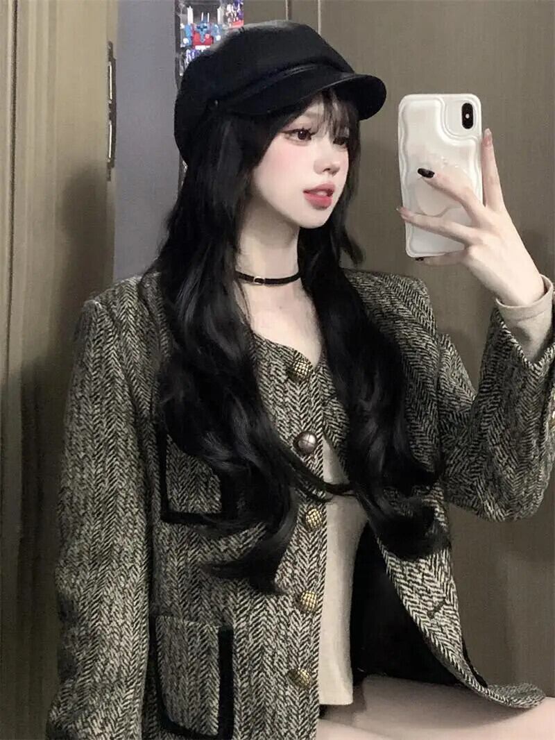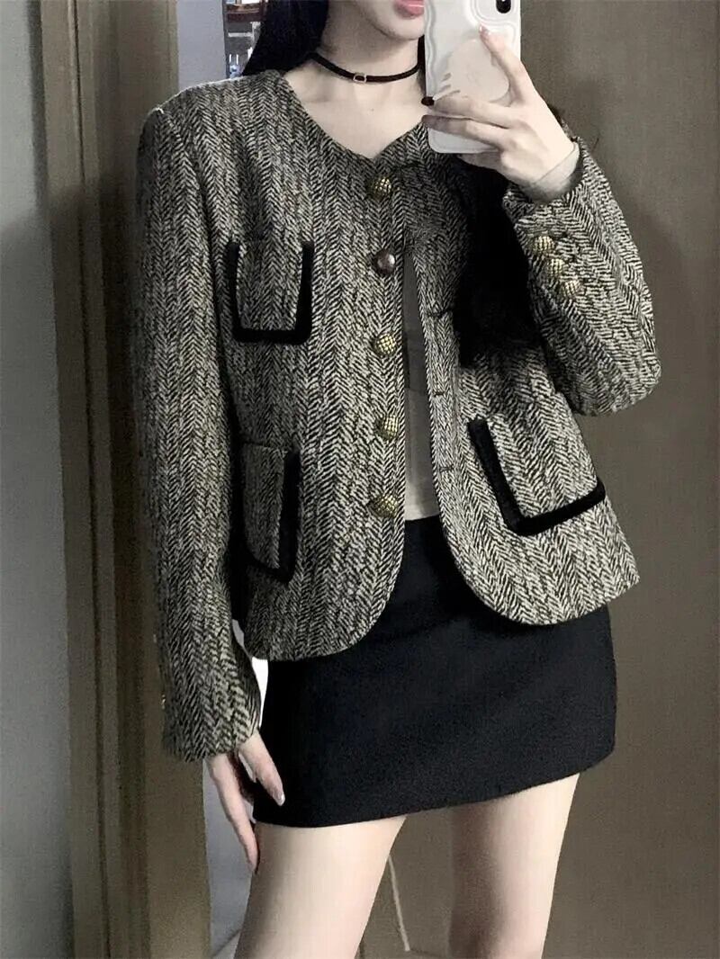 秋冬長袖フレグランスショートウールコートダークグレーウールジャケット ロング オータム 秋物 ウィンター 冬物