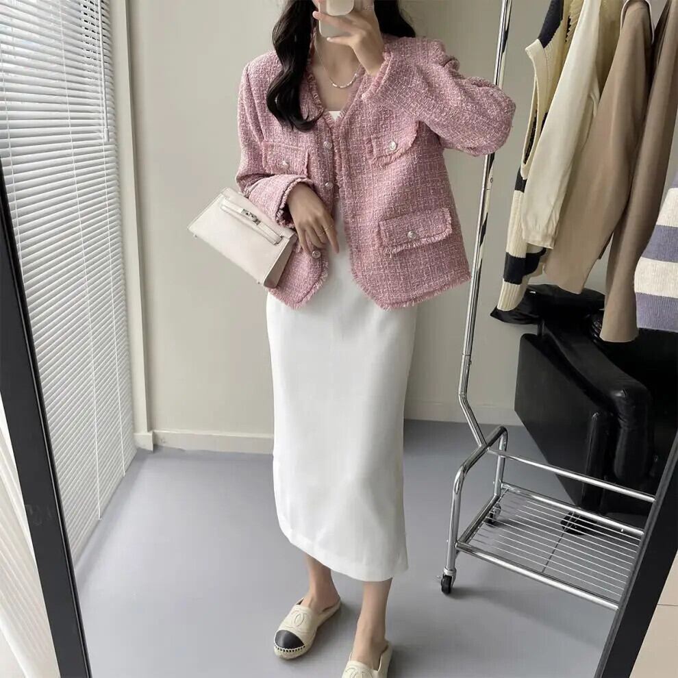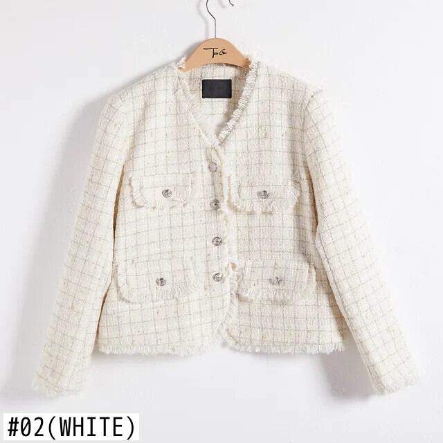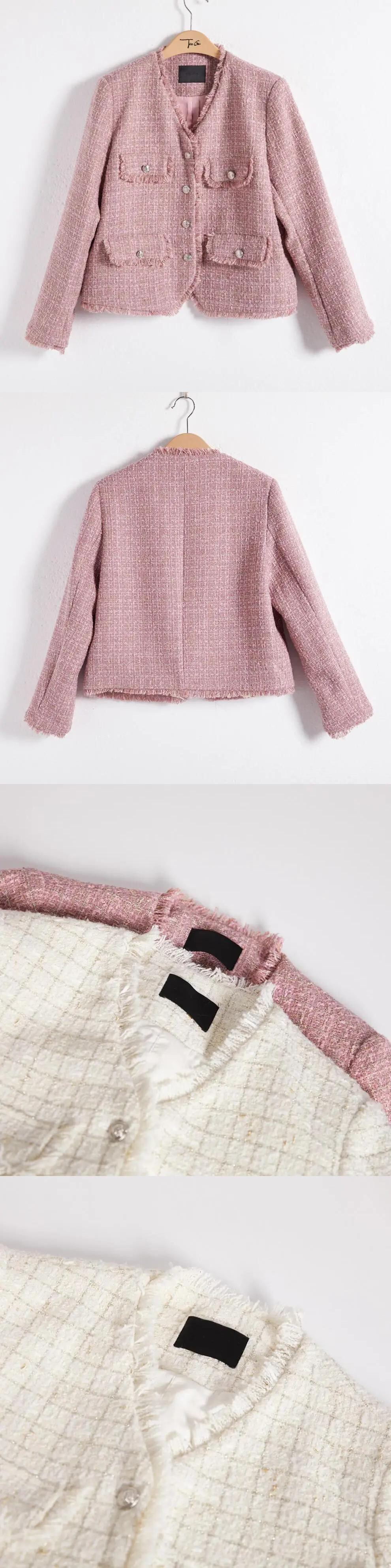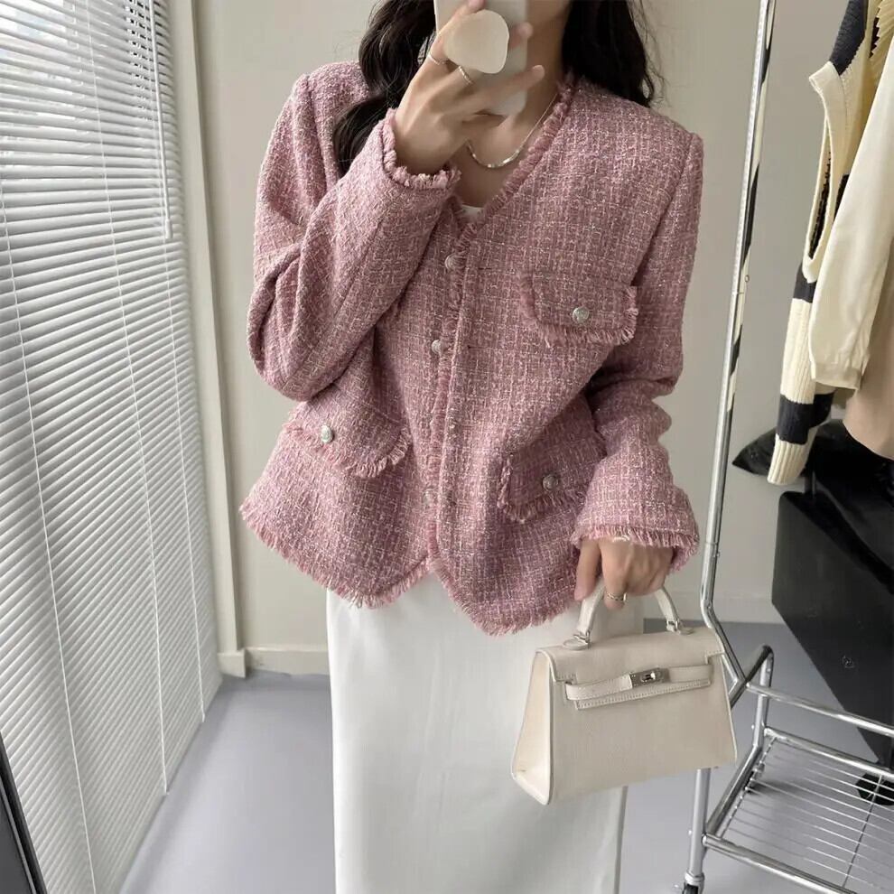 ホワイトピンク気質優しいVネックテルコート秋ゴールドチェック柄ジャケット オータム 秋物