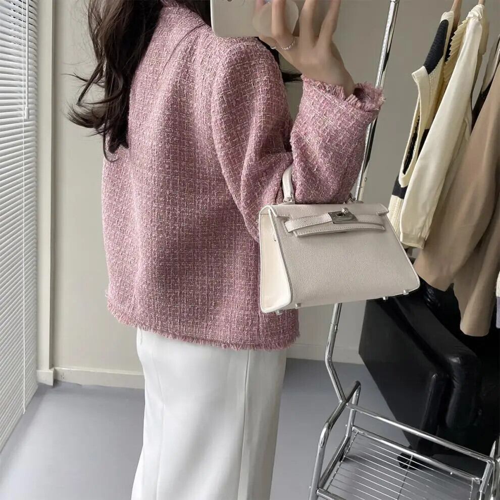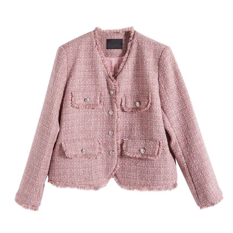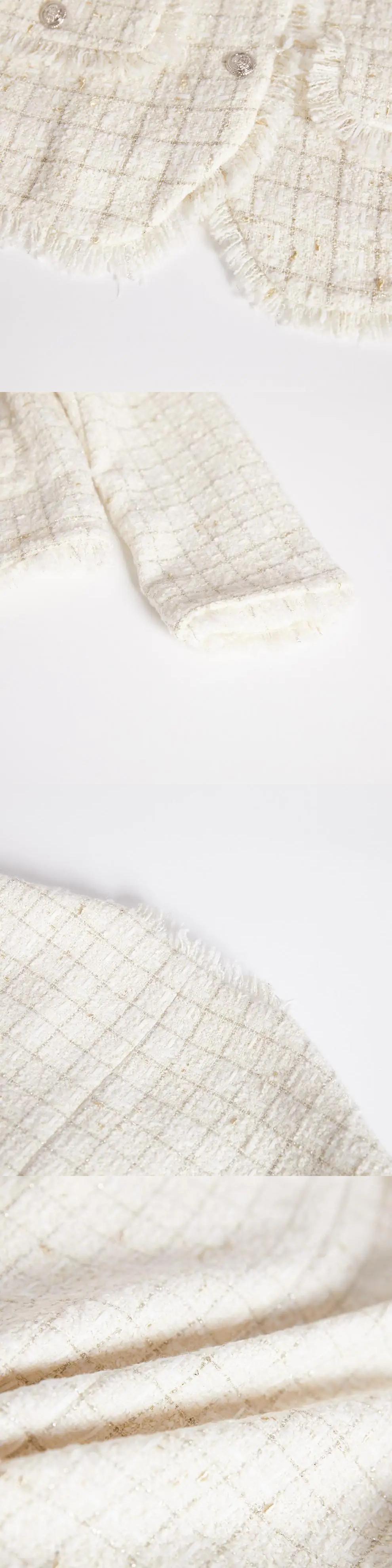 ホワイトピンク気質優しいVネックテルコート秋ゴールドチェック柄ジャケット オータム 秋物