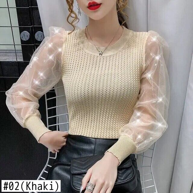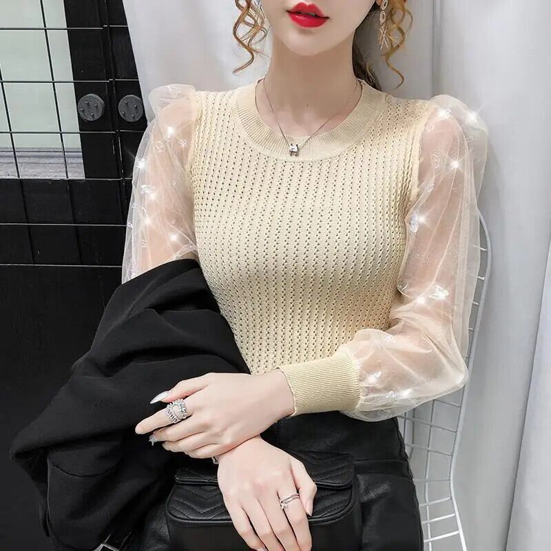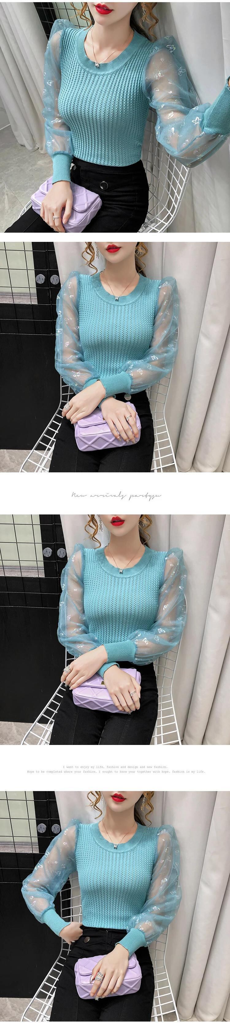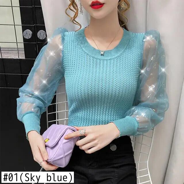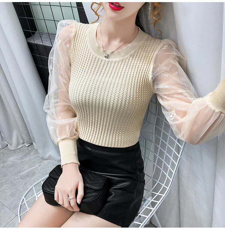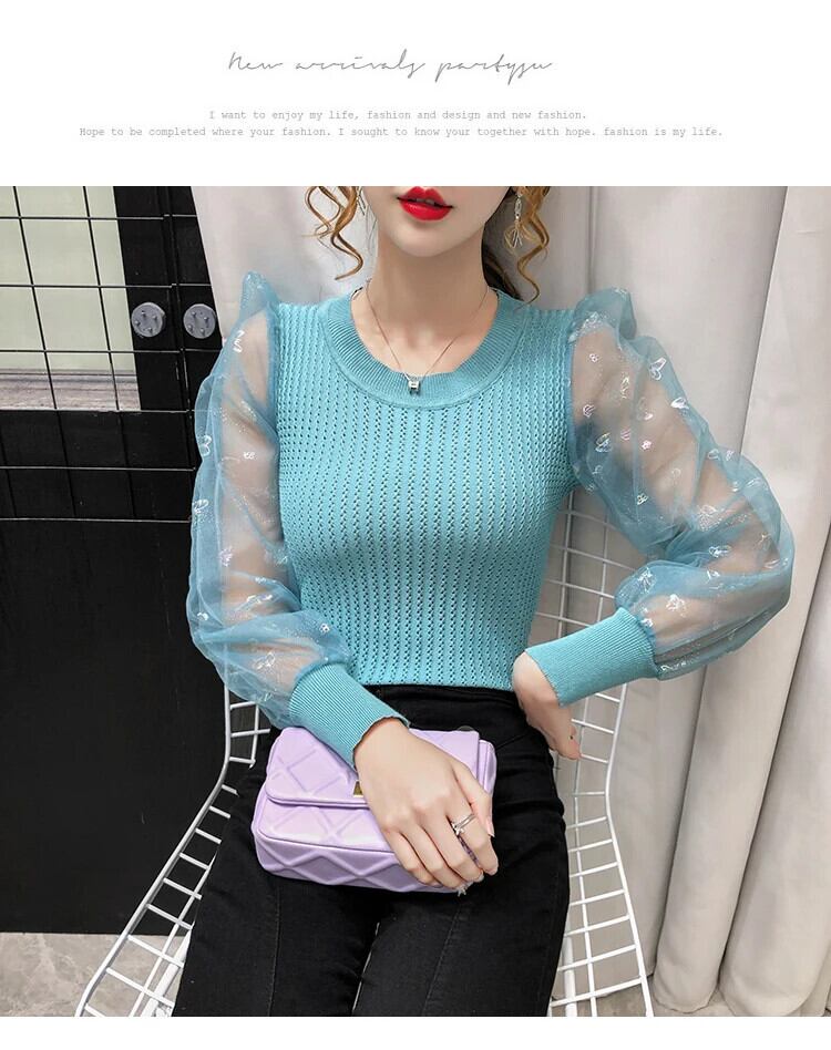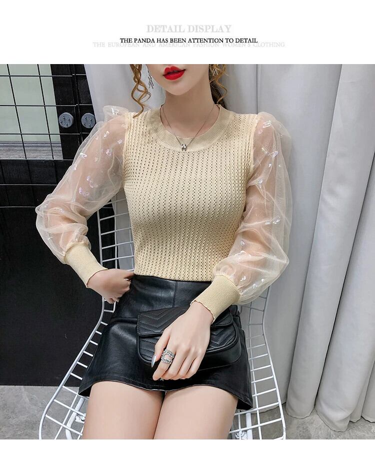 春秋ネット糸パフスリーブステッチ蝶セーターニット スプリング 春物 オータム 秋物