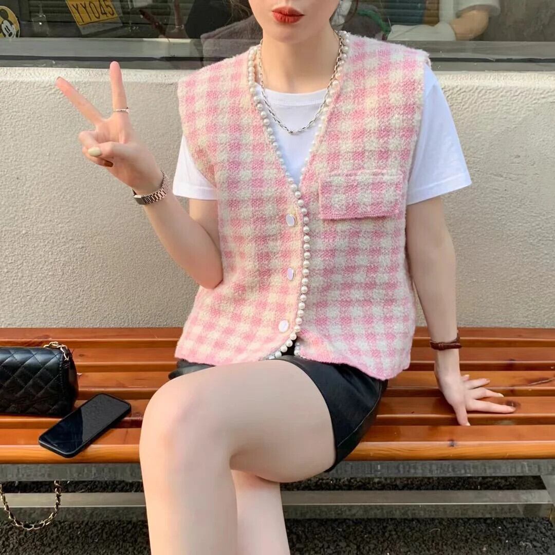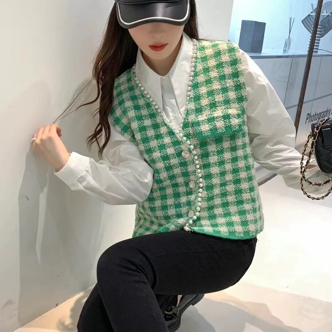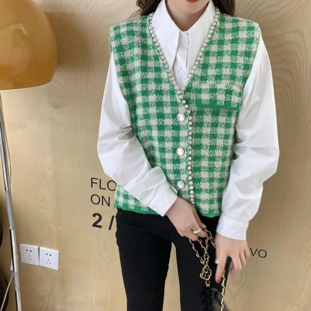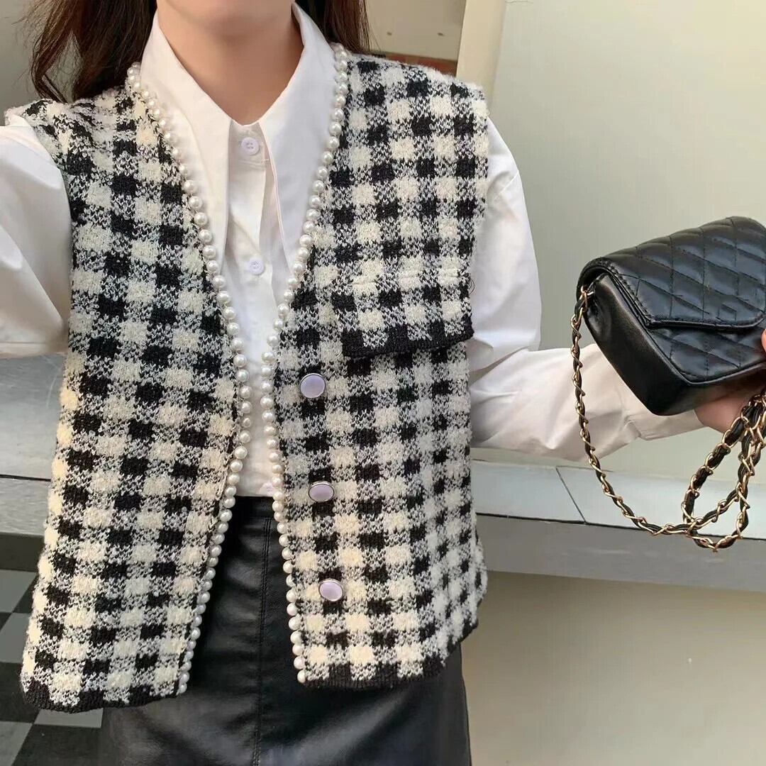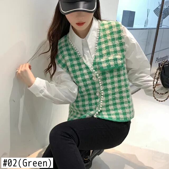 チェック柄厚みあるベストコートルーズ V ネックカーディガンチョッキ秋冬 オータム 秋物 ウィンター 冬物 Vネック