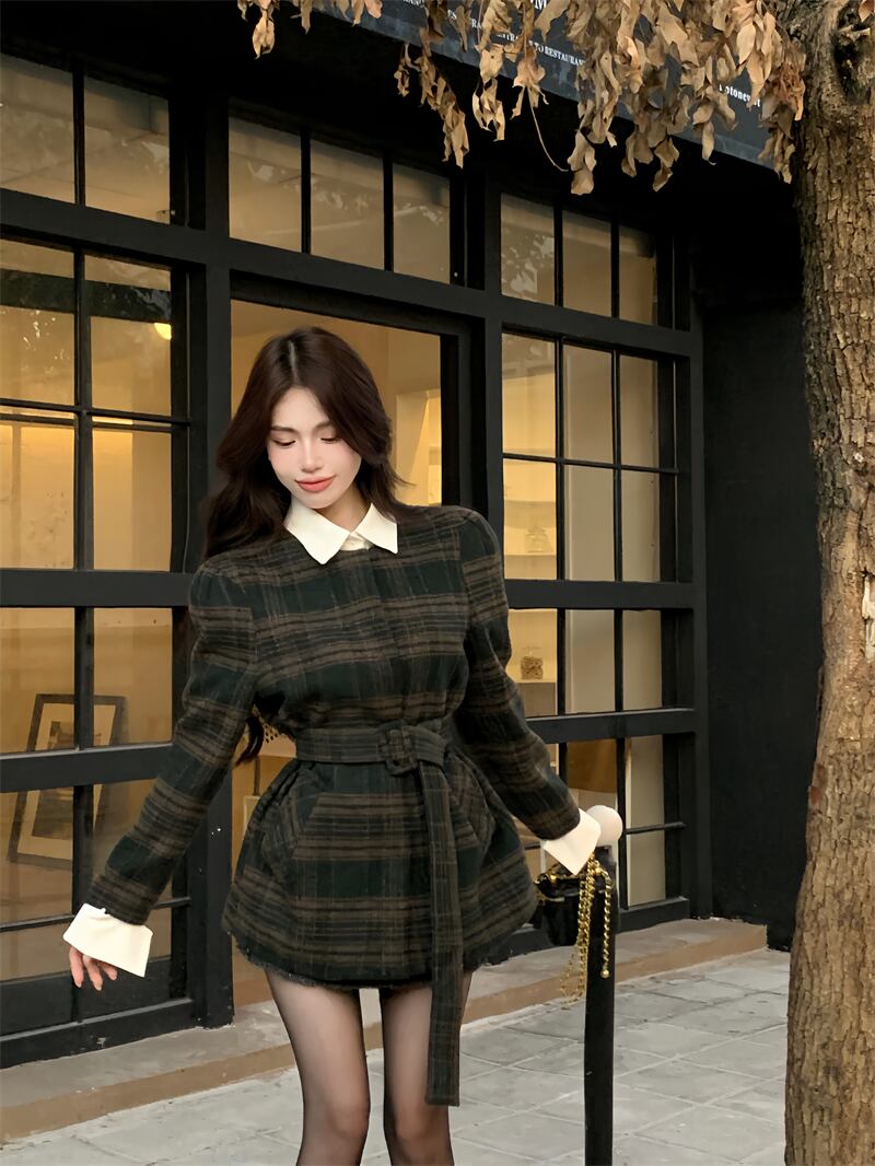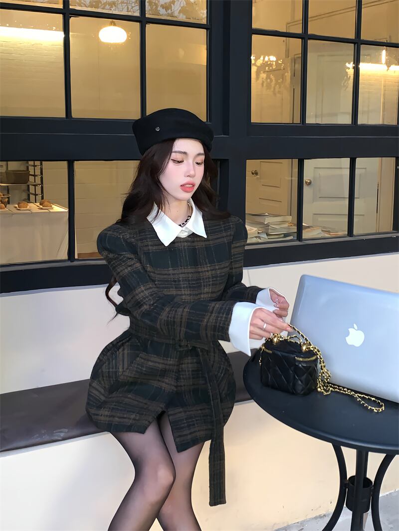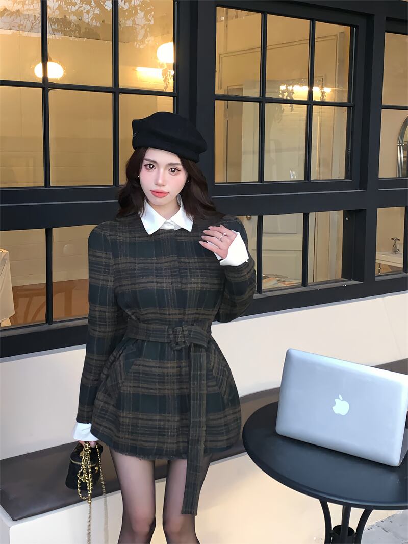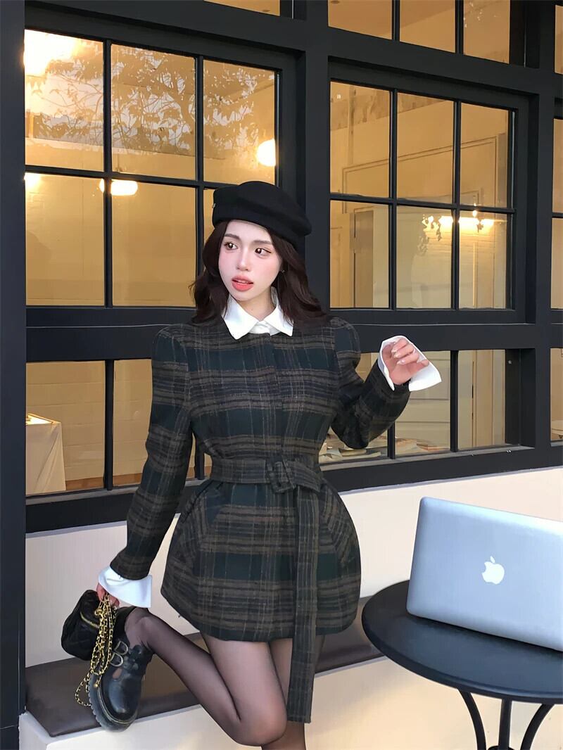ミッドレングス秋冬ウールジャケットフェイクツーピースチェック柄ウールコート オータム 秋物 ウィンター 冬物