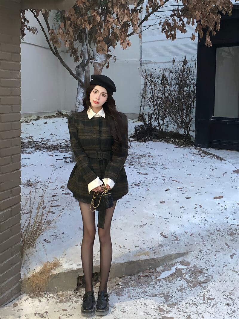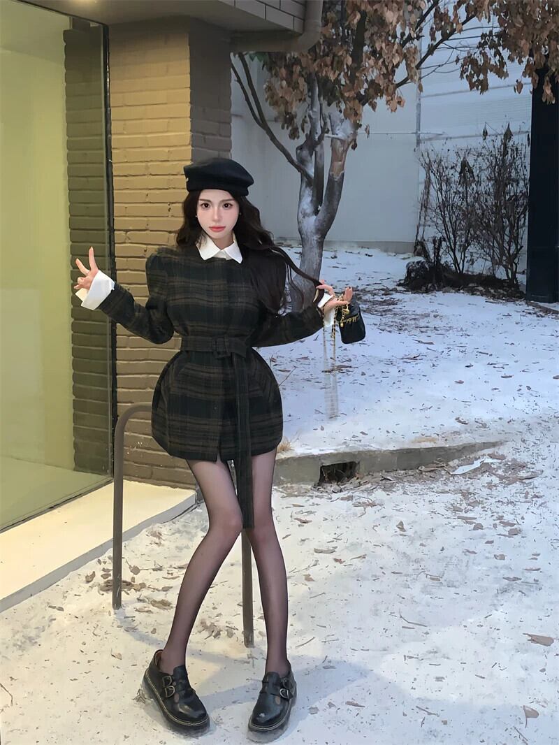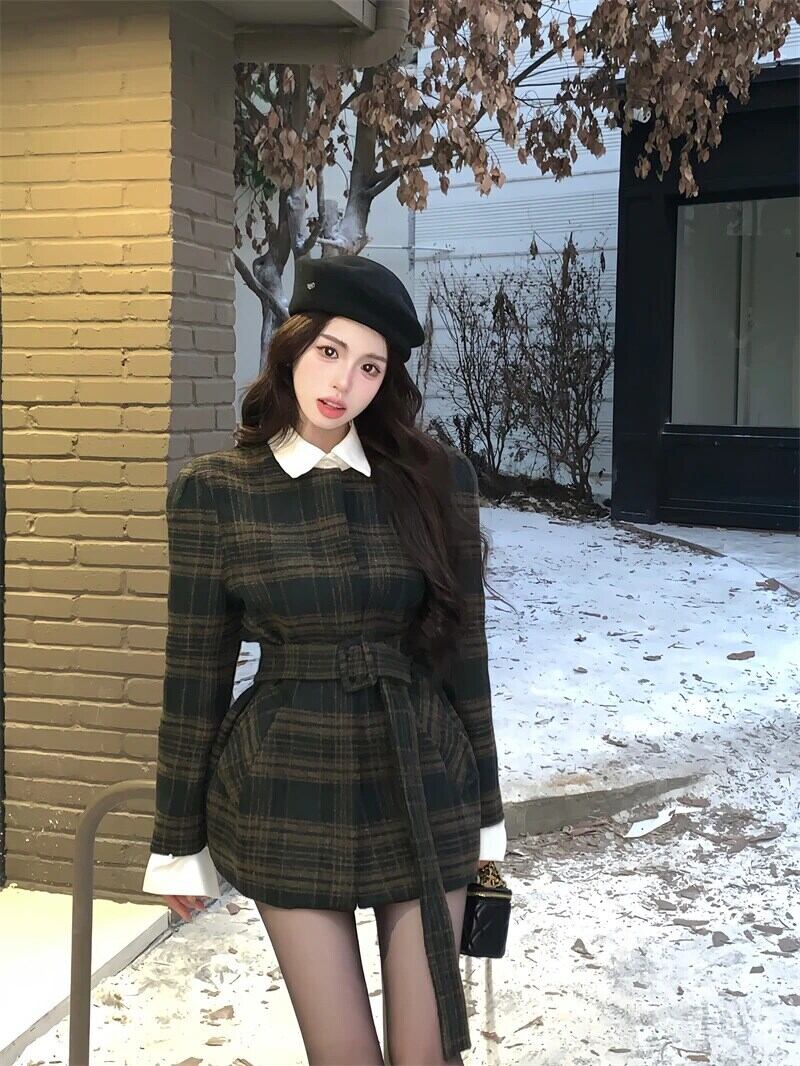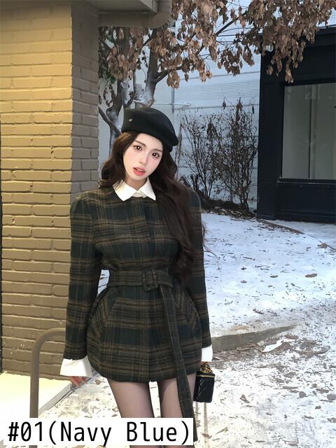 ミッドレングス秋冬ウールジャケットフェイクツーピースチェック柄ウールコート オータム 秋物 ウィンター 冬物