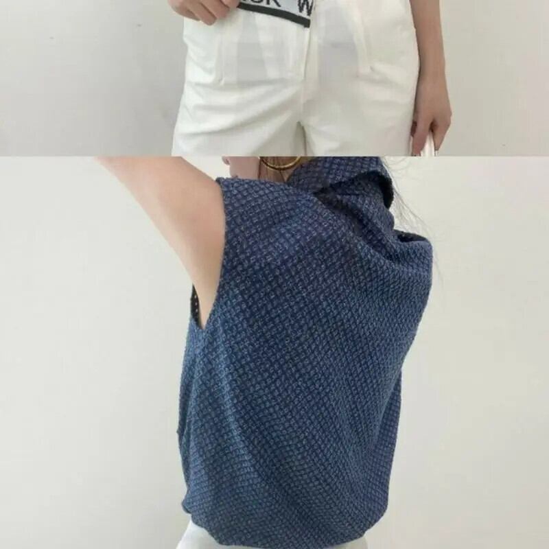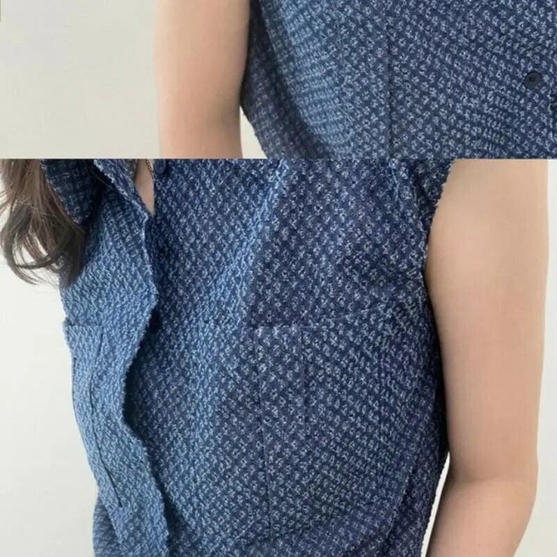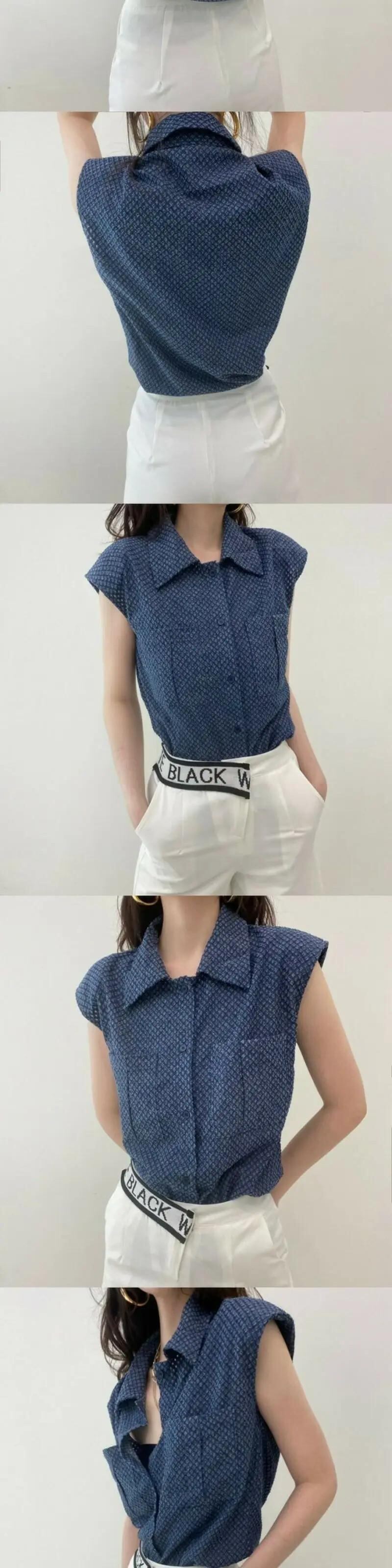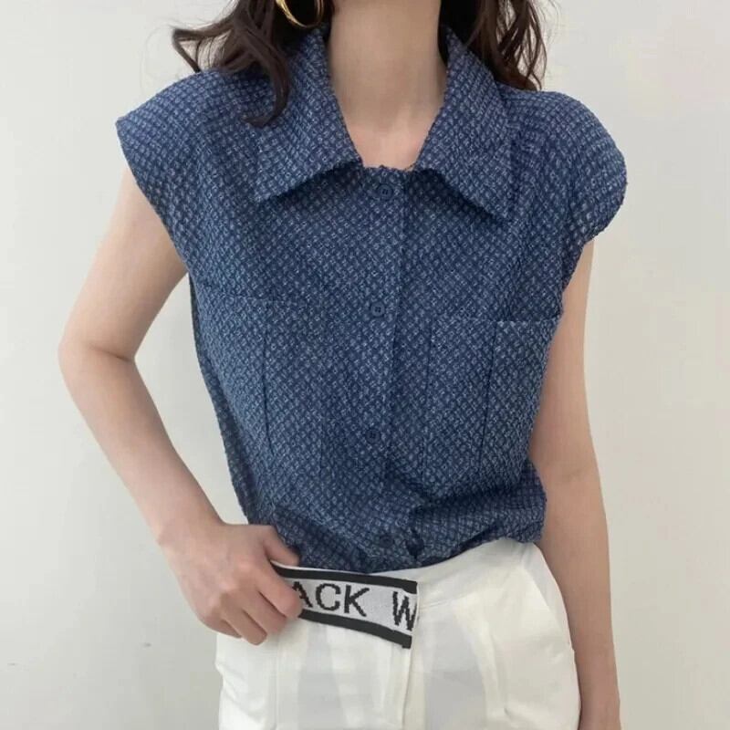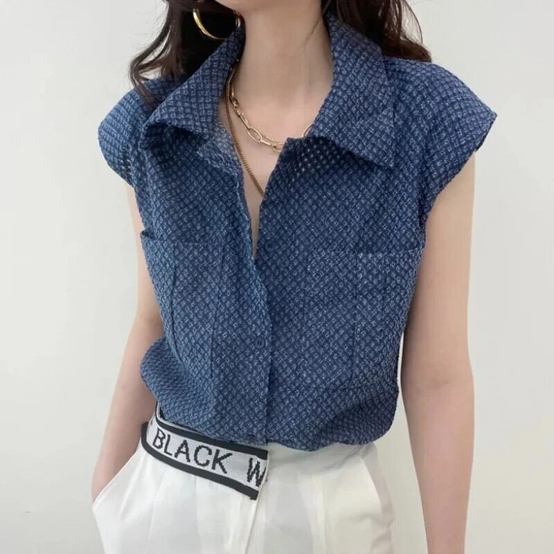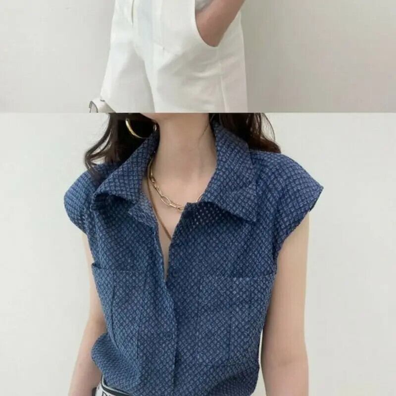 夏レトロラペルシングルブレストルーズダブルポケットノースリーブデニムシャツブラウス サマー 夏物