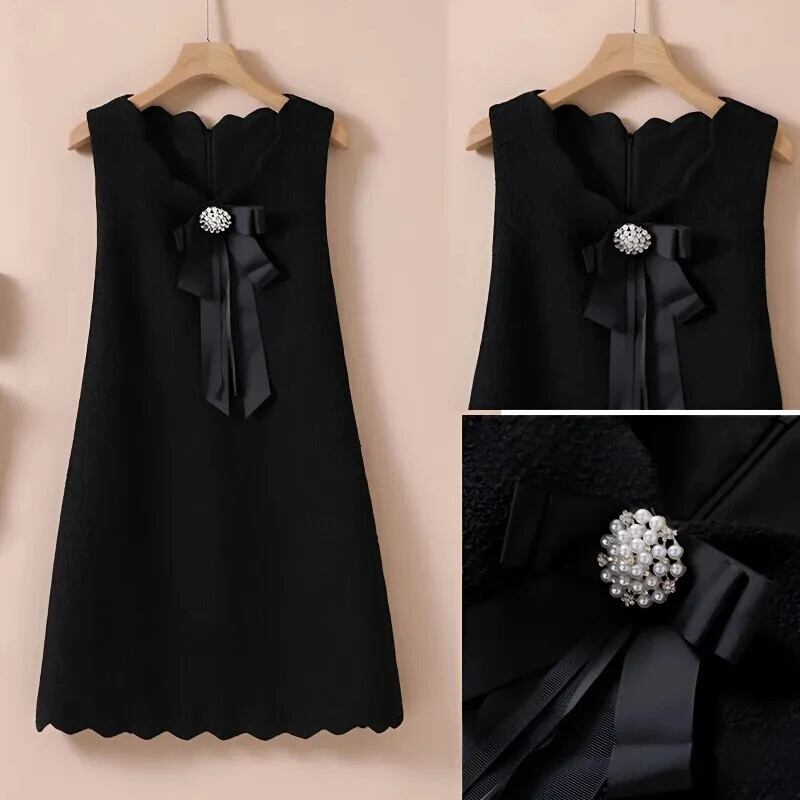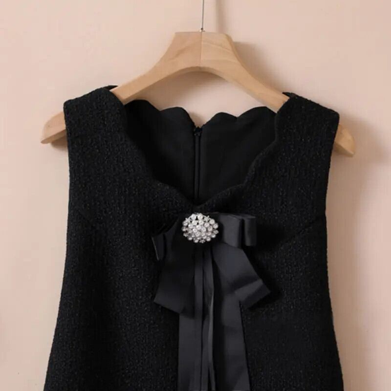 春秋ブラック ダイヤモンド リボン ツイード タンク トップ ウール ドレス V ネック 3XL スプリング 春物 オータム 秋物 Vネック