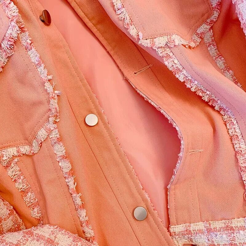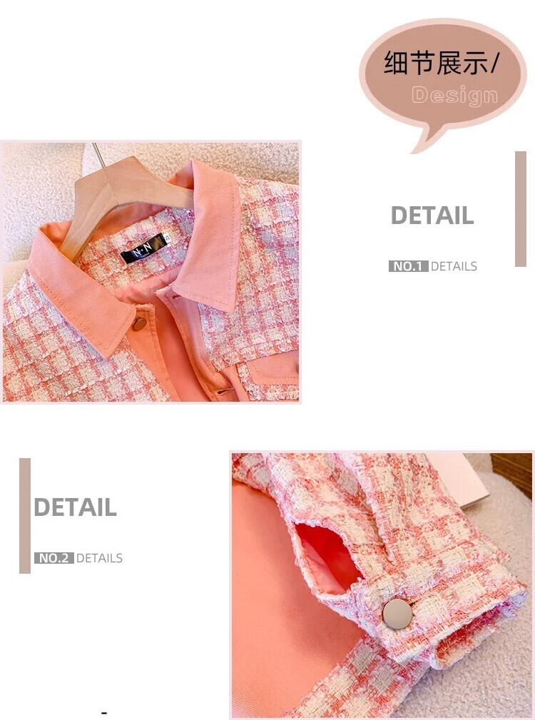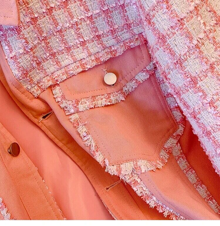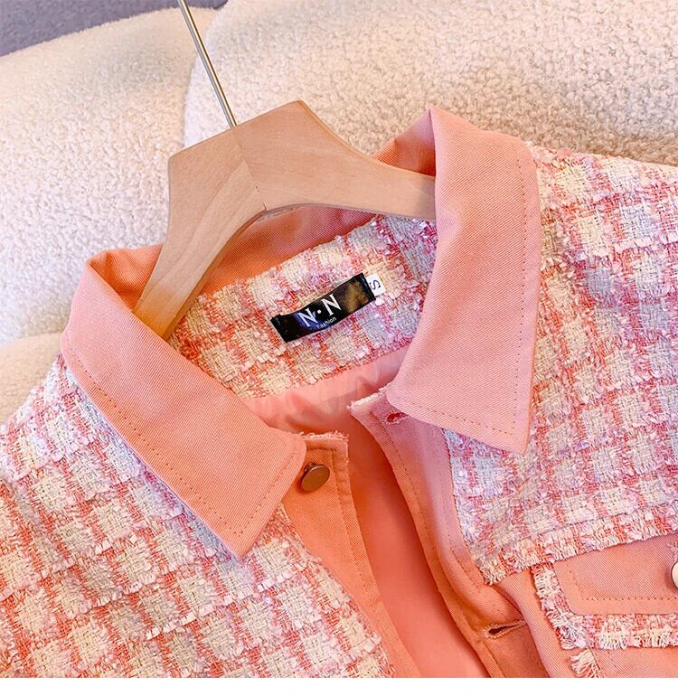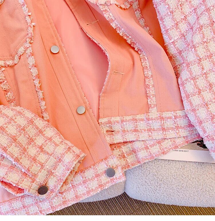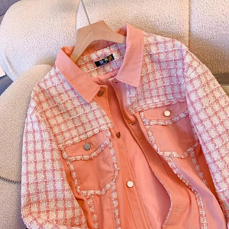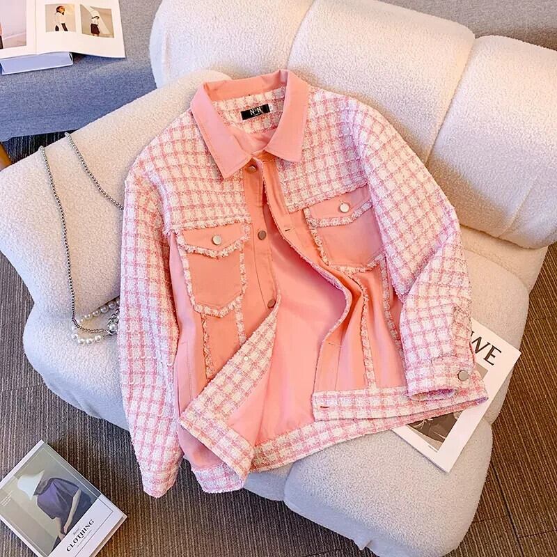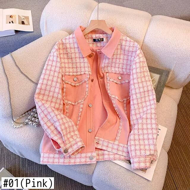 ピンク香りチェック柄スプライシングコート春秋ルーズミッドレングスジャケット スプリング 春物 オータム 秋物