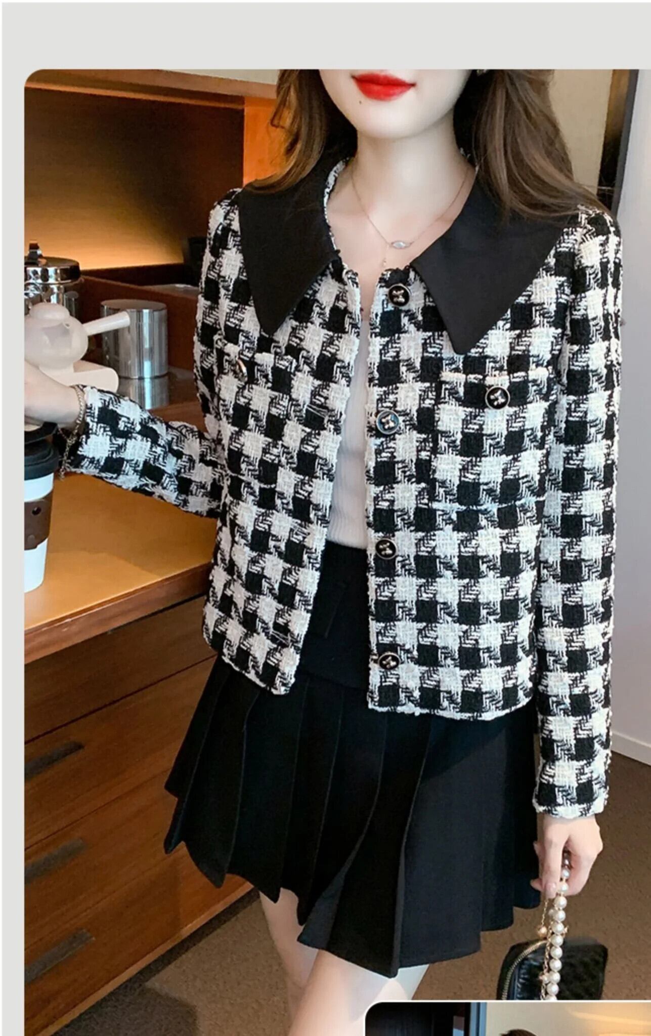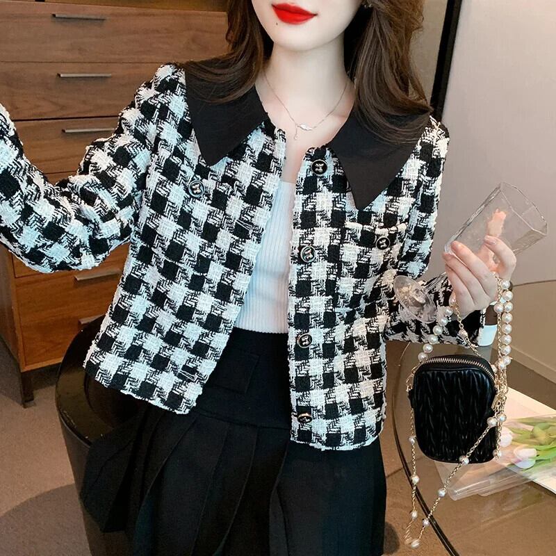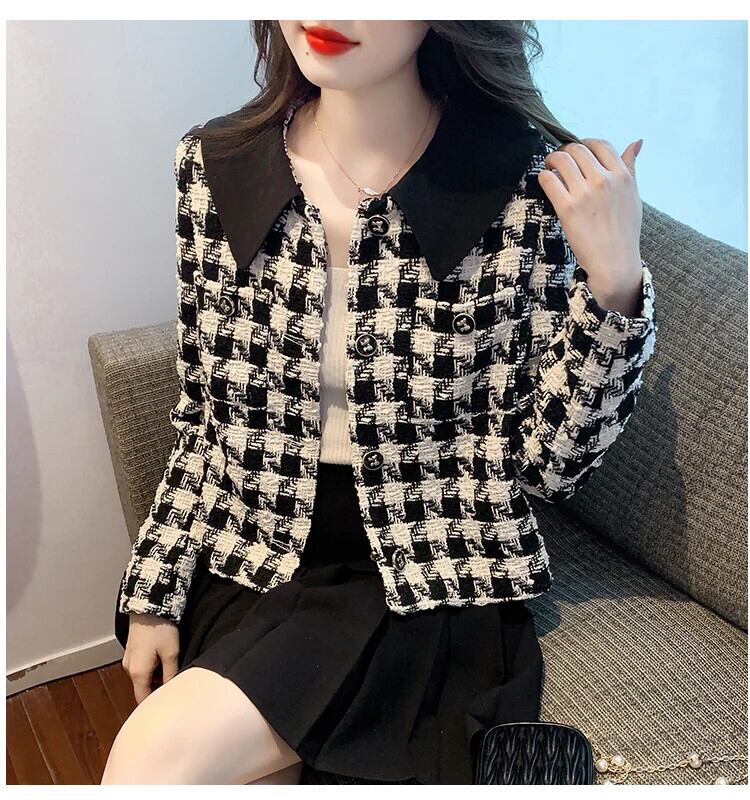 高級ウールブレンドコートブラックターンカラーチェック柄ワイドジャケット