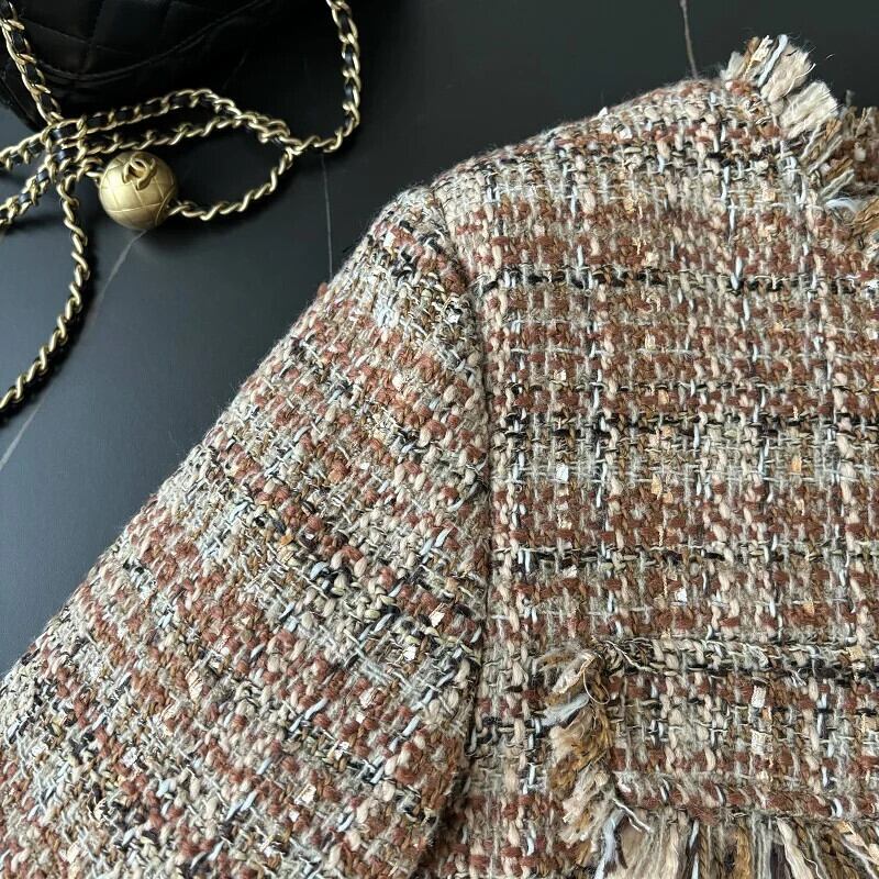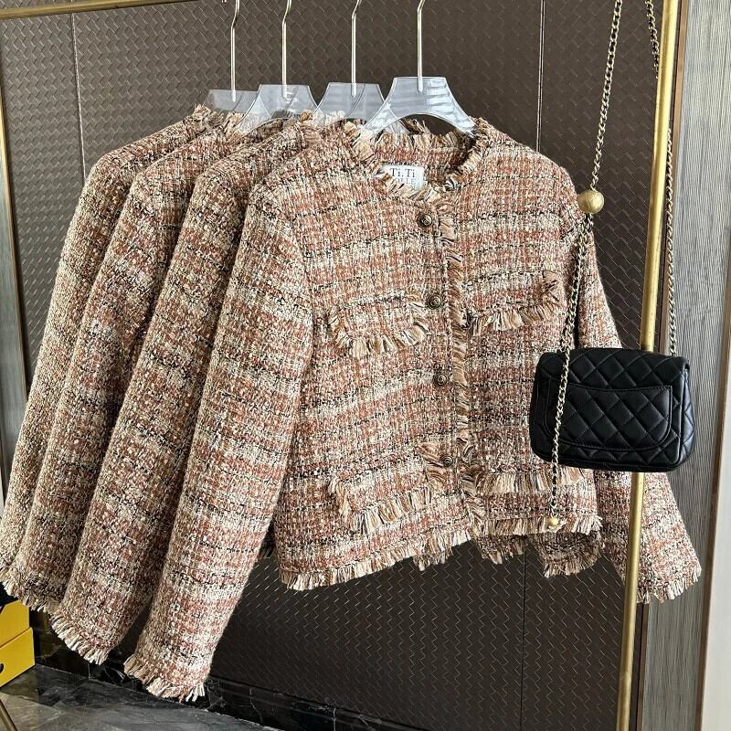 冬長袖フリンジエッジルーズショート香りホワイトダックダウンツイードジャケットコート ロング ウィンター 冬物