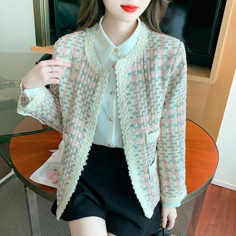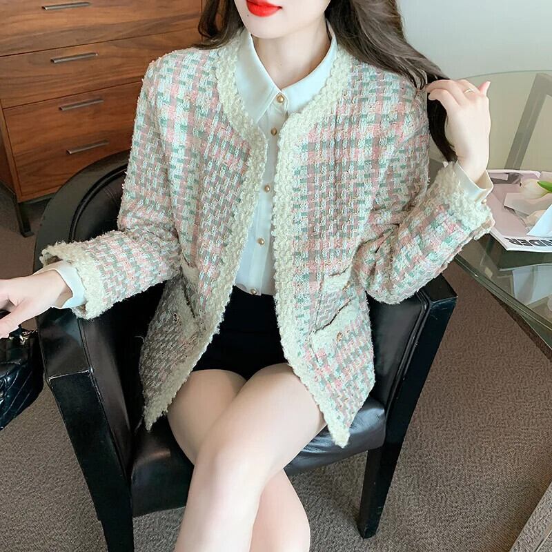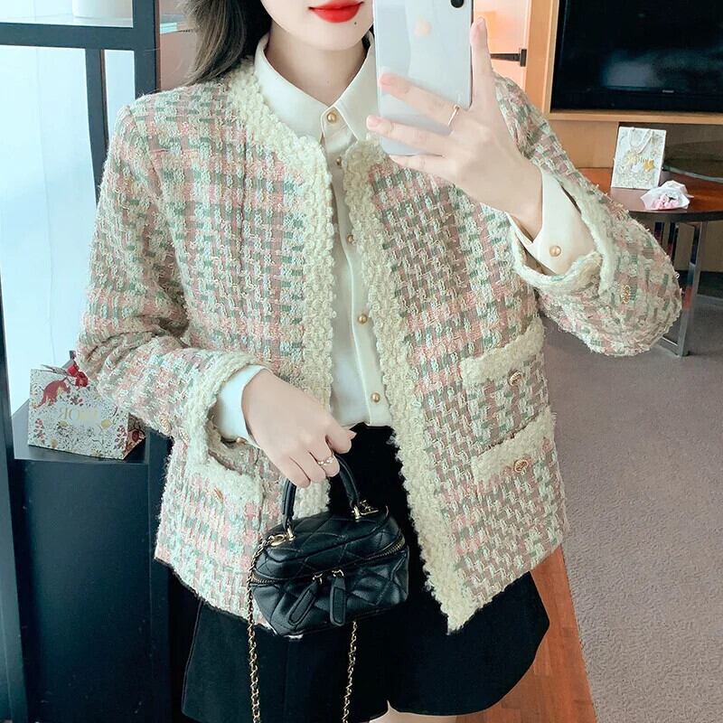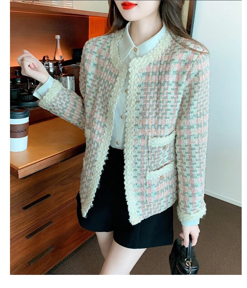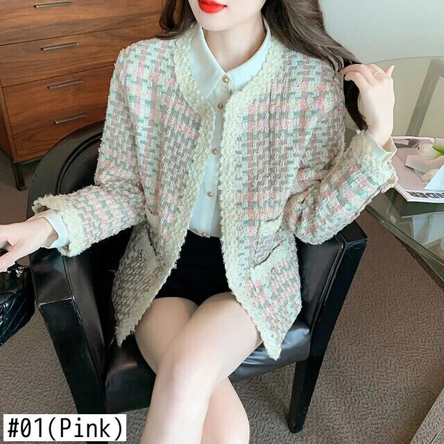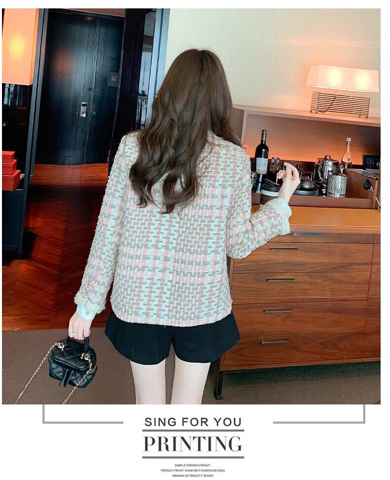 秋ピンクチェック柄ツイードジャケットコートショート Casaco Chaquetas Para es Jaqueta Abrigo オータム 秋物