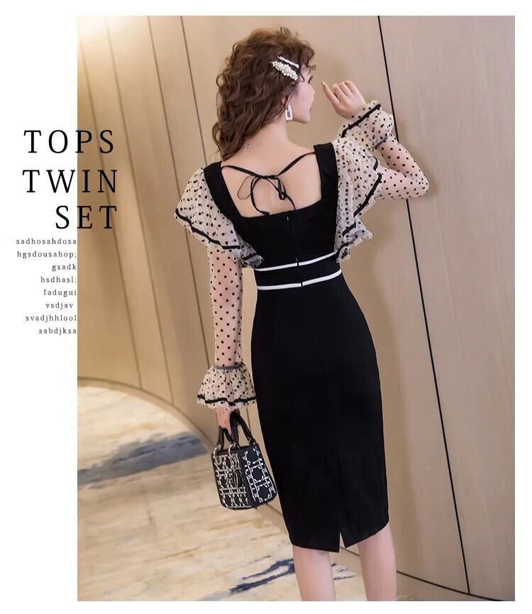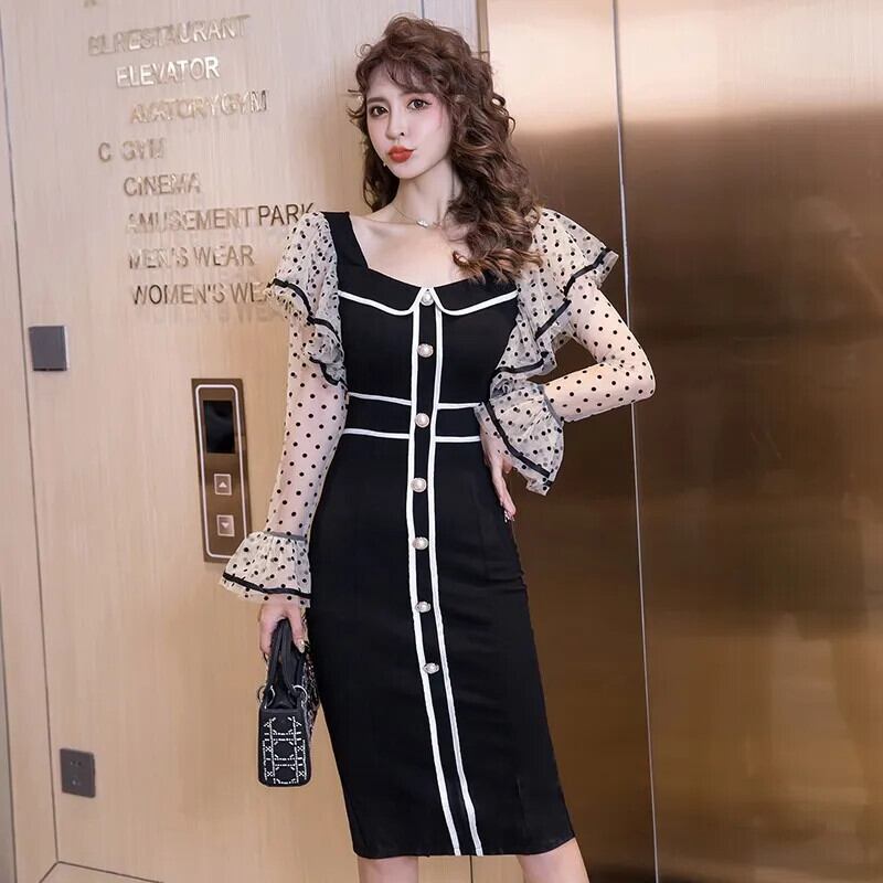 春夏シングルブレスト蓮葉袖ウェーブドットメッシュドレス スプリング 春物 サマー 夏物