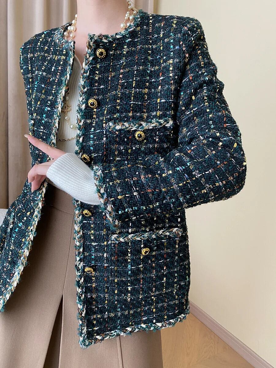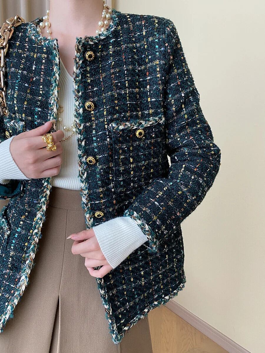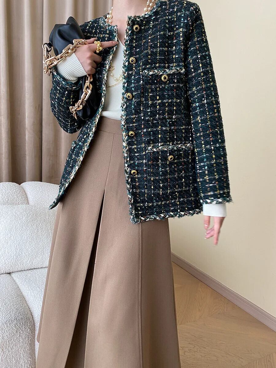 秋/冬ミッドレングスルーズフィットグリーンツイードフレグランスコートウールジャケットアウターチャケータ オータム 秋物 ウィンター 冬物