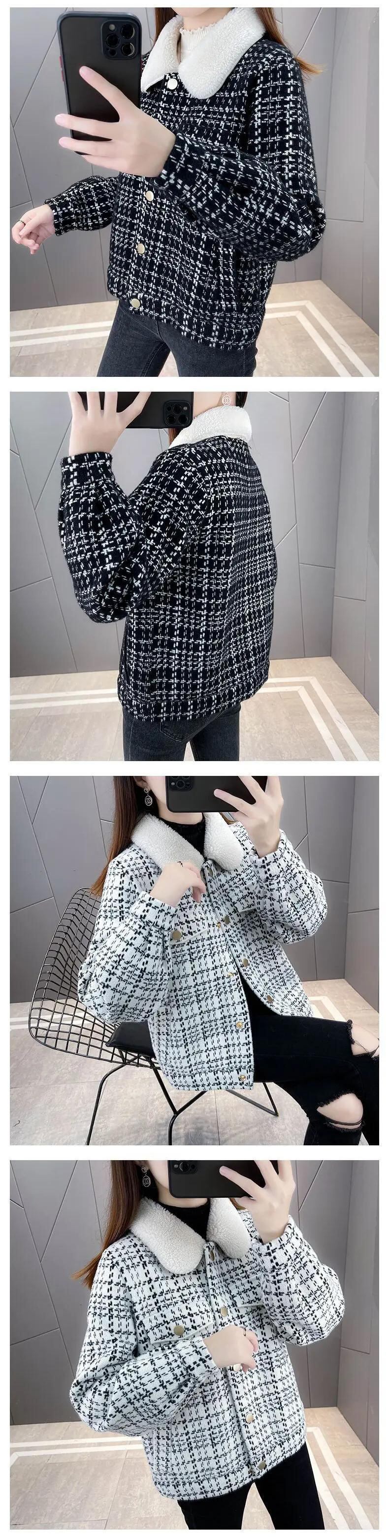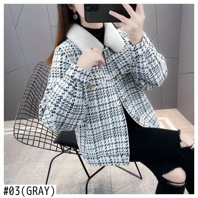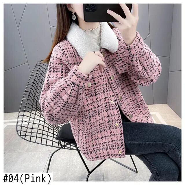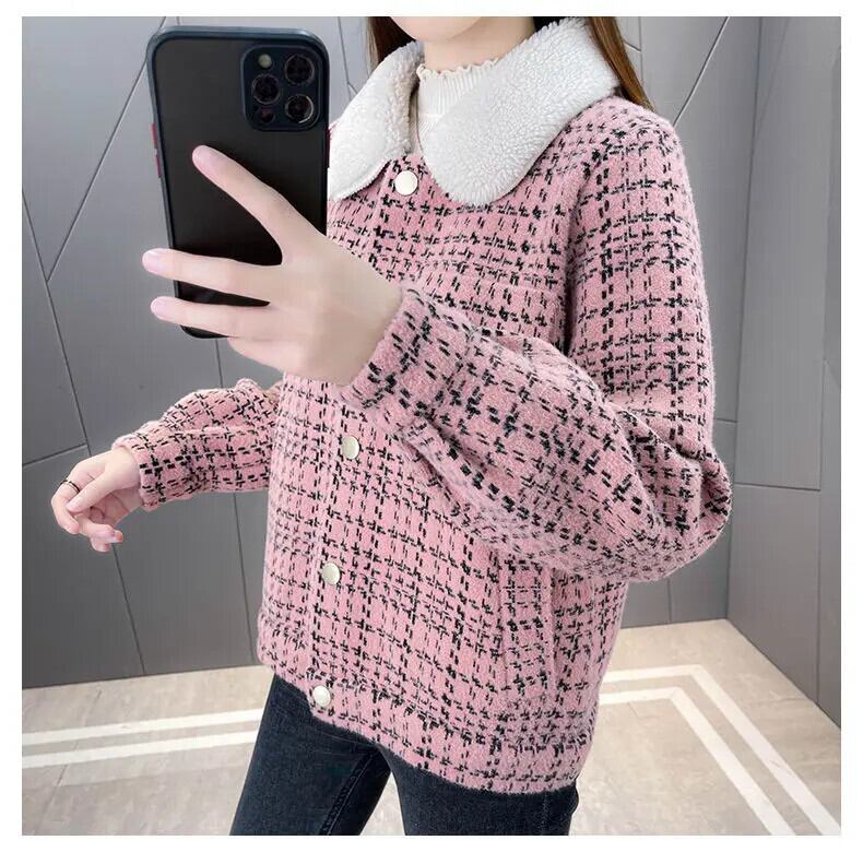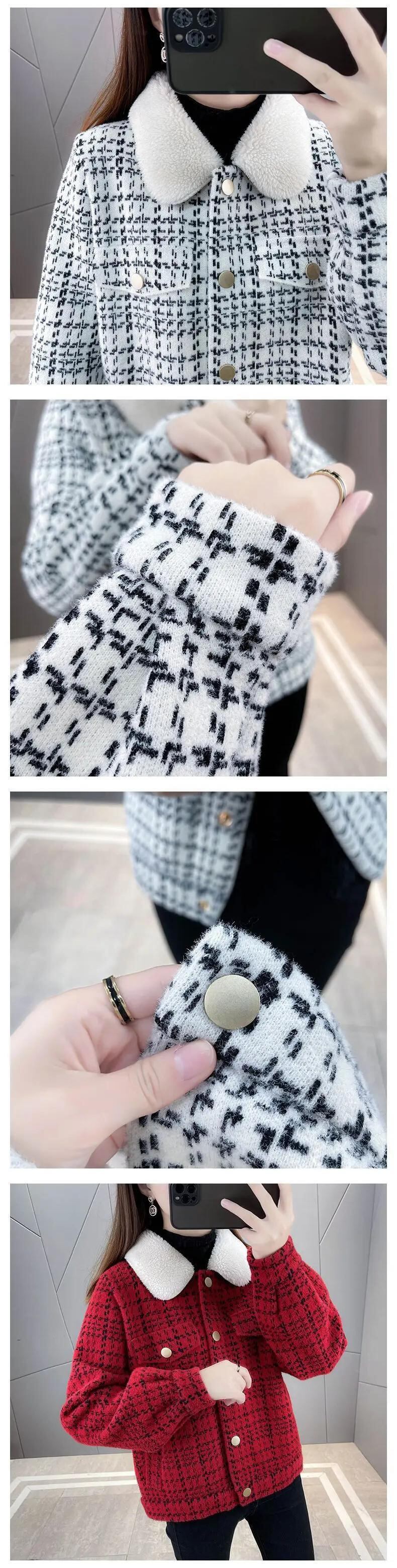 冬チェック柄パッチワークラムコートレディースイミテーションミンクニットカーディガンジャケット ウィンター 冬物
