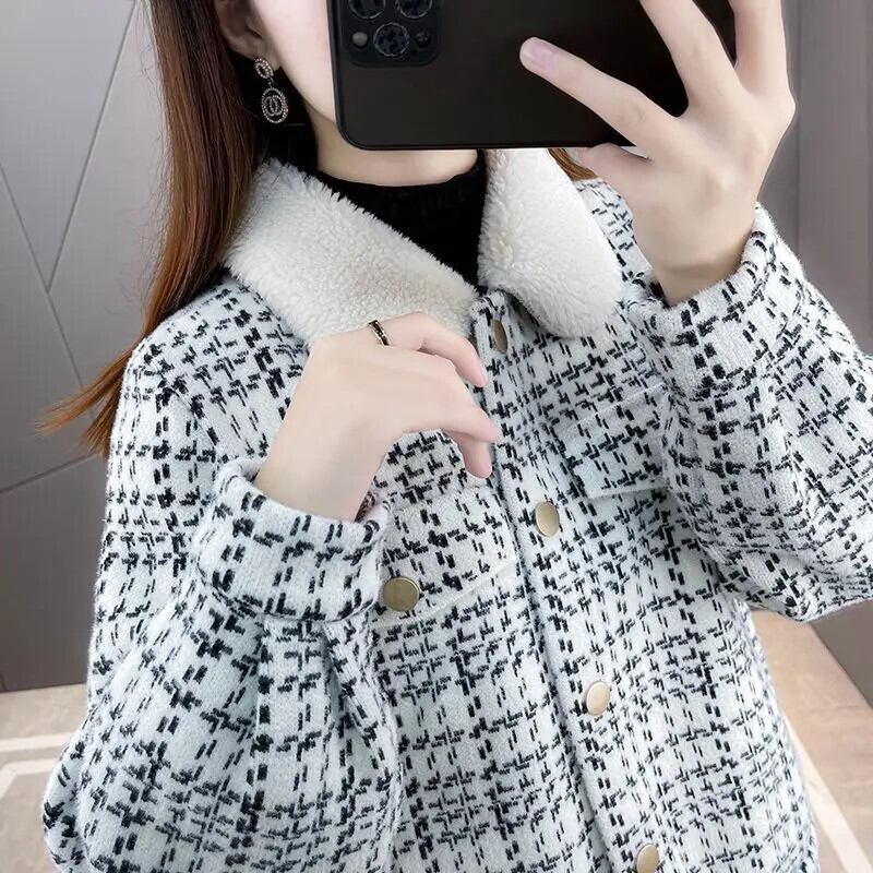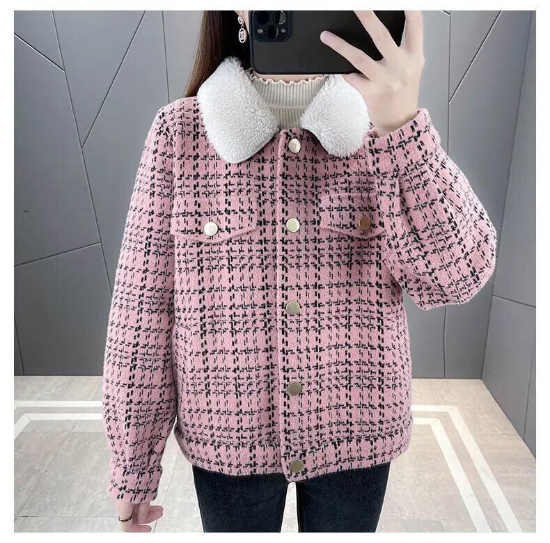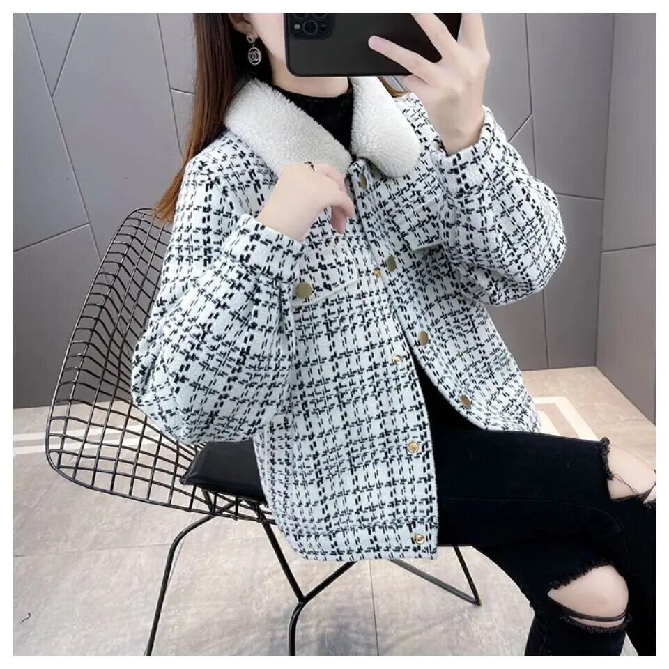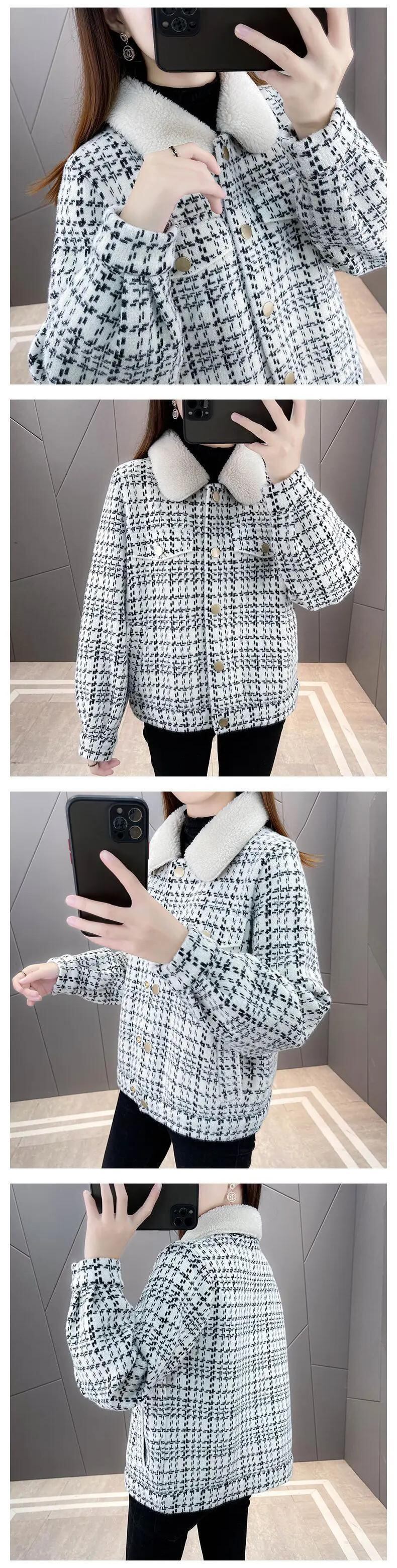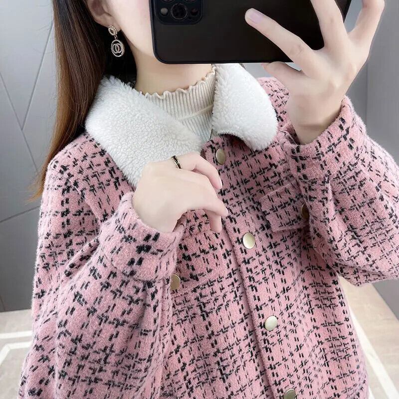 冬チェック柄パッチワークラムコートレディースイミテーションミンクニットカーディガンジャケット ウィンター 冬物