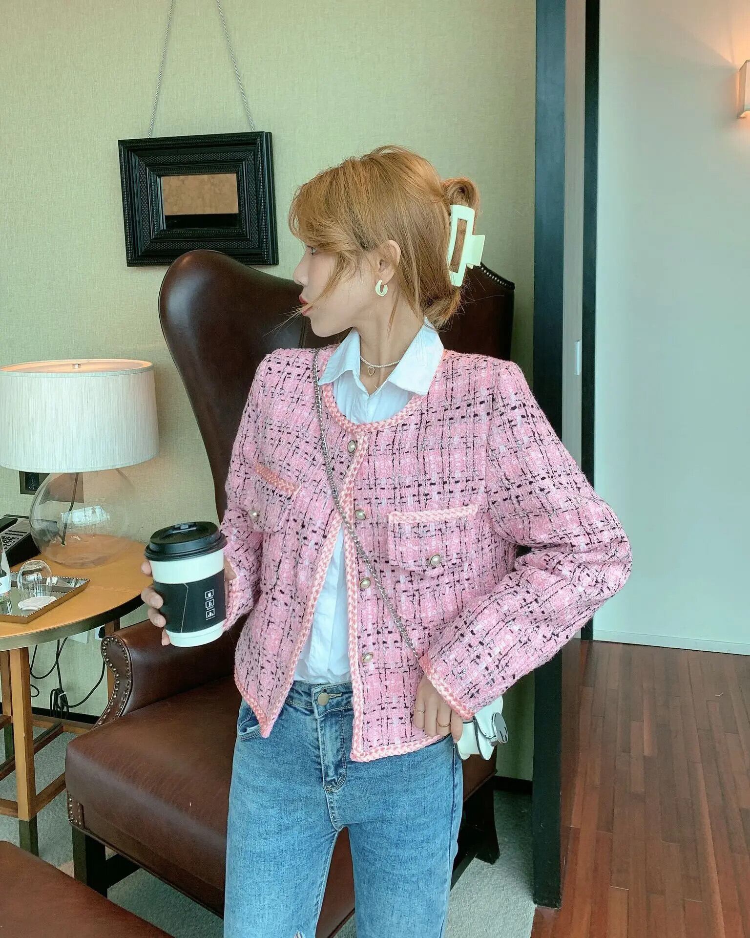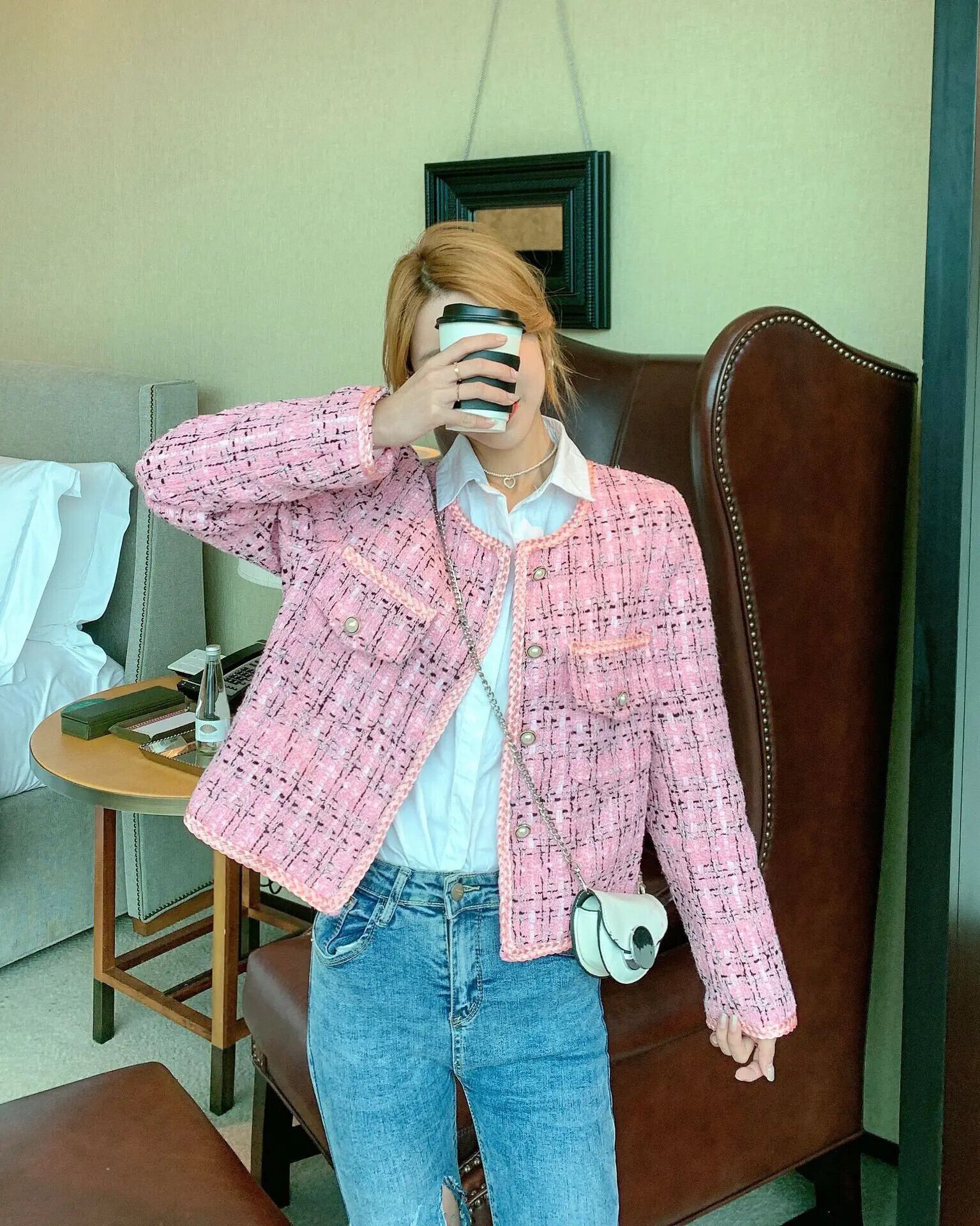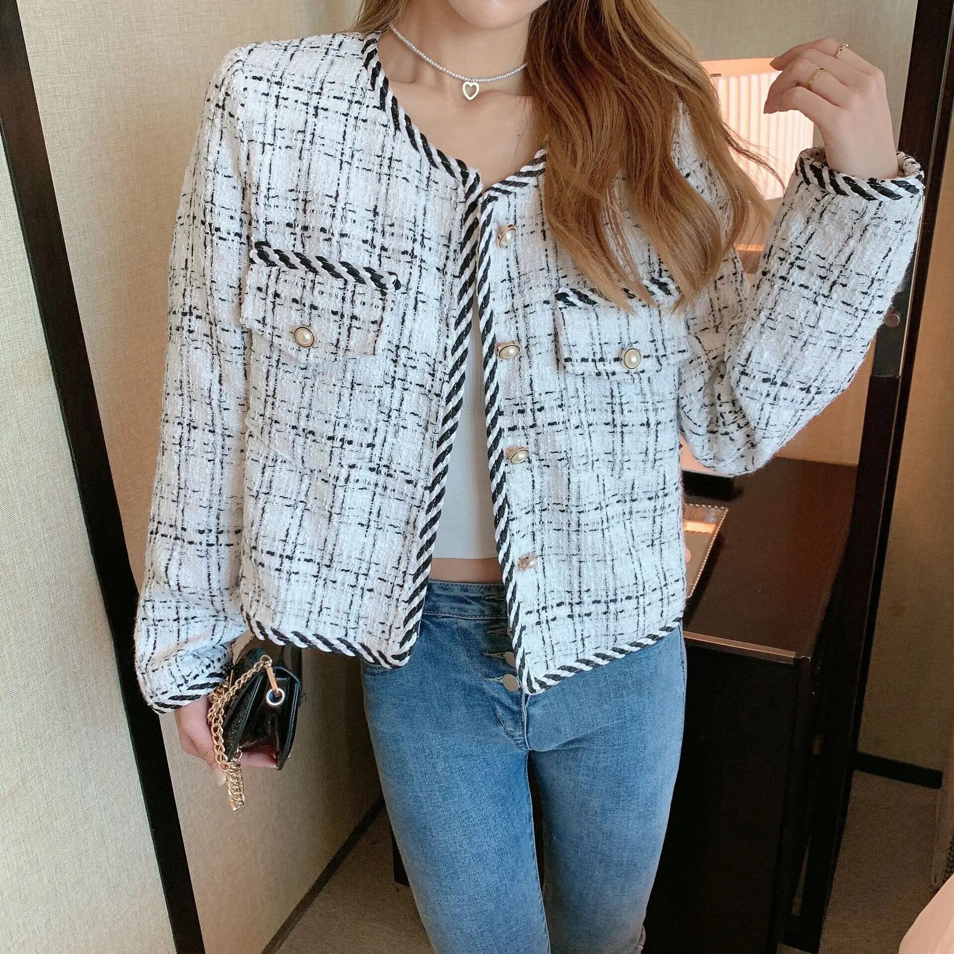 春秋レジャーインコートレディースホワイトピンクラウンドネックツイードジャケットルーズ スプリング 春物 オータム 秋物 Oネック