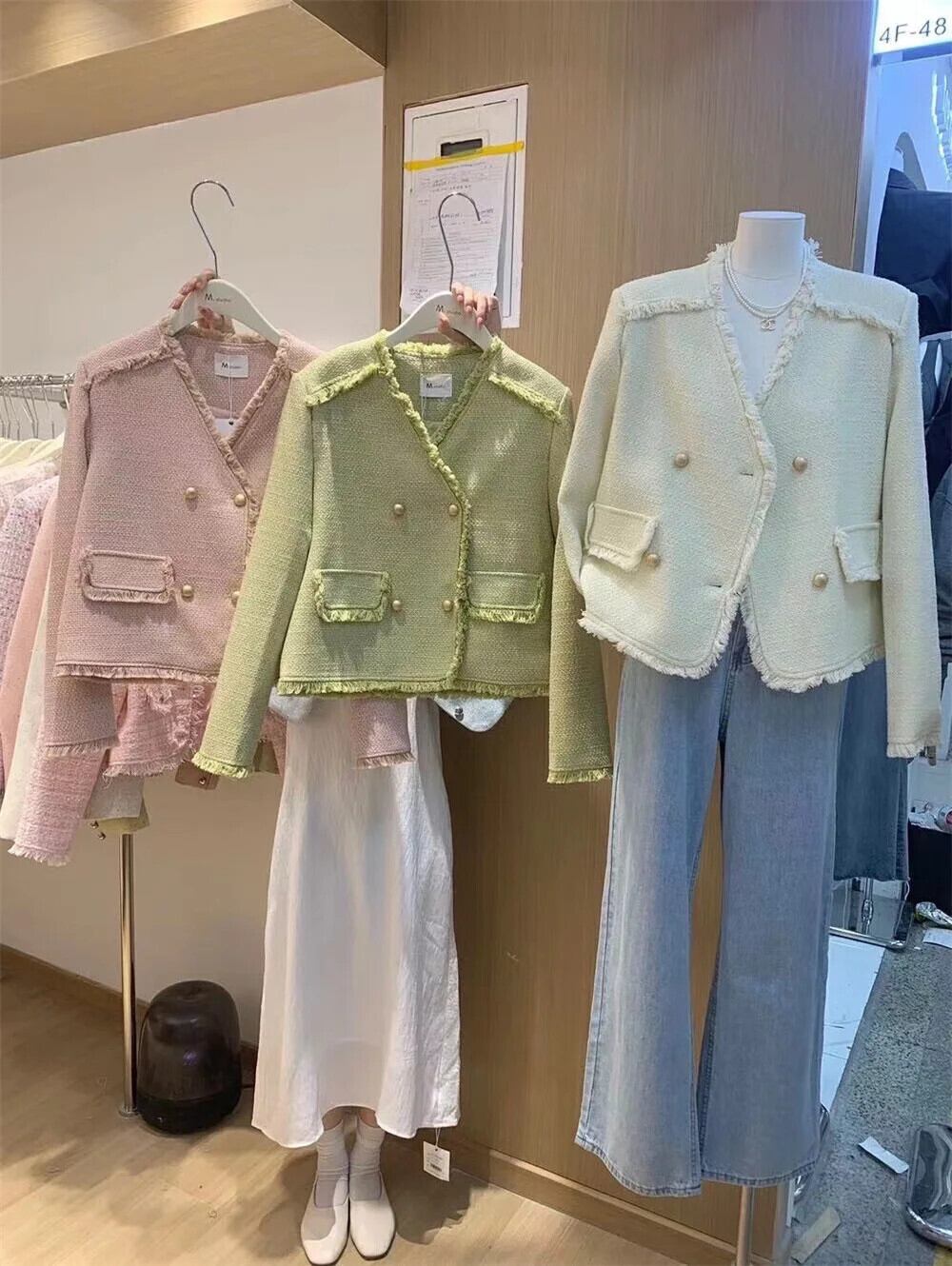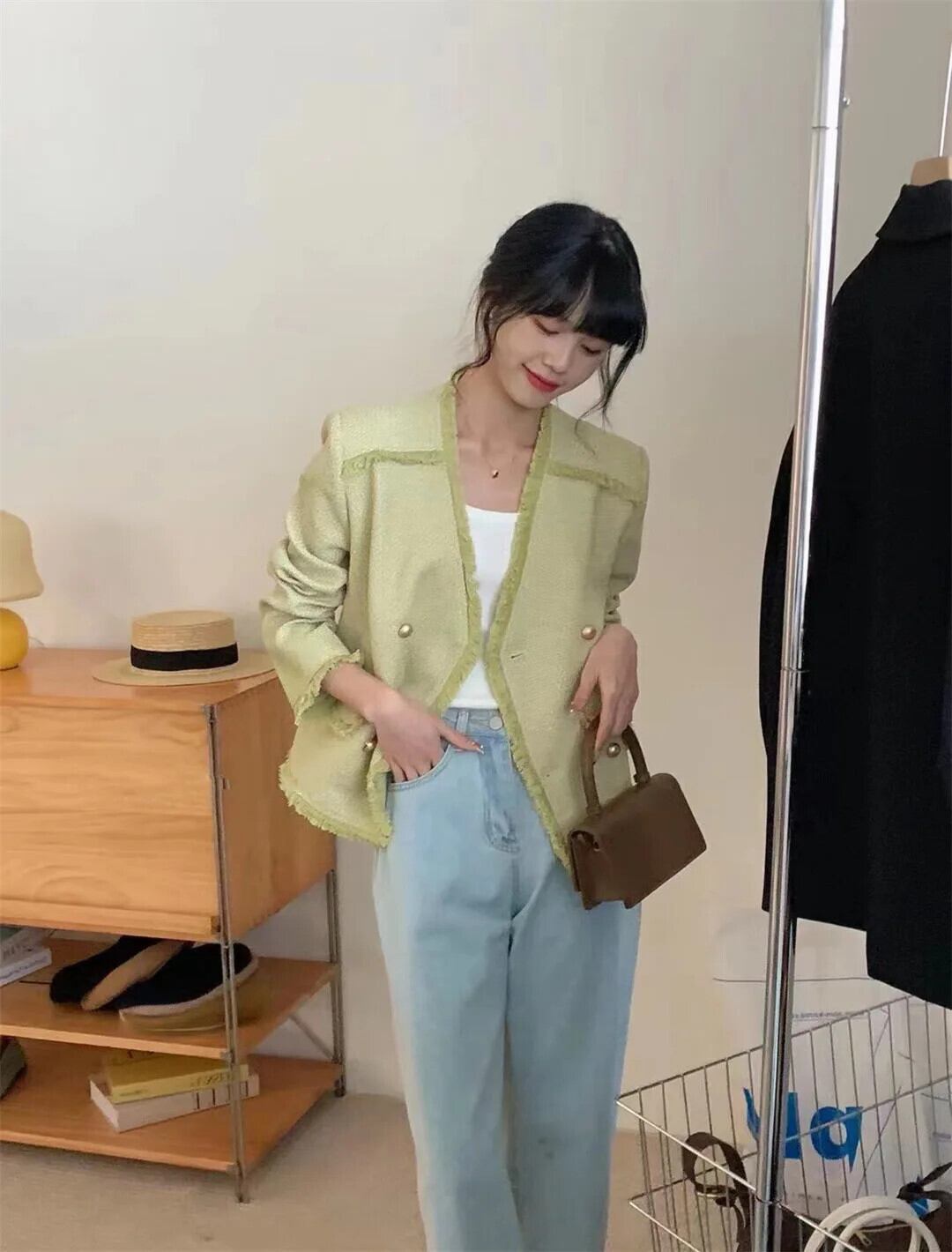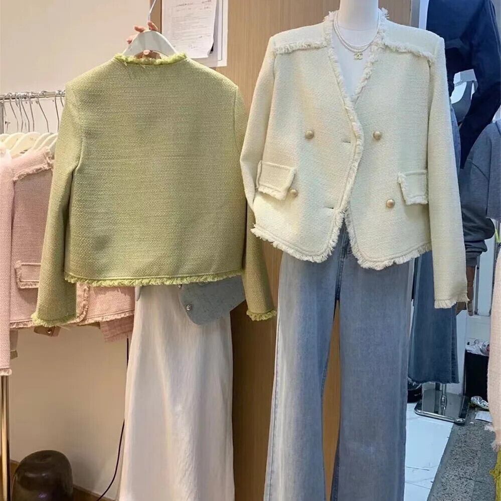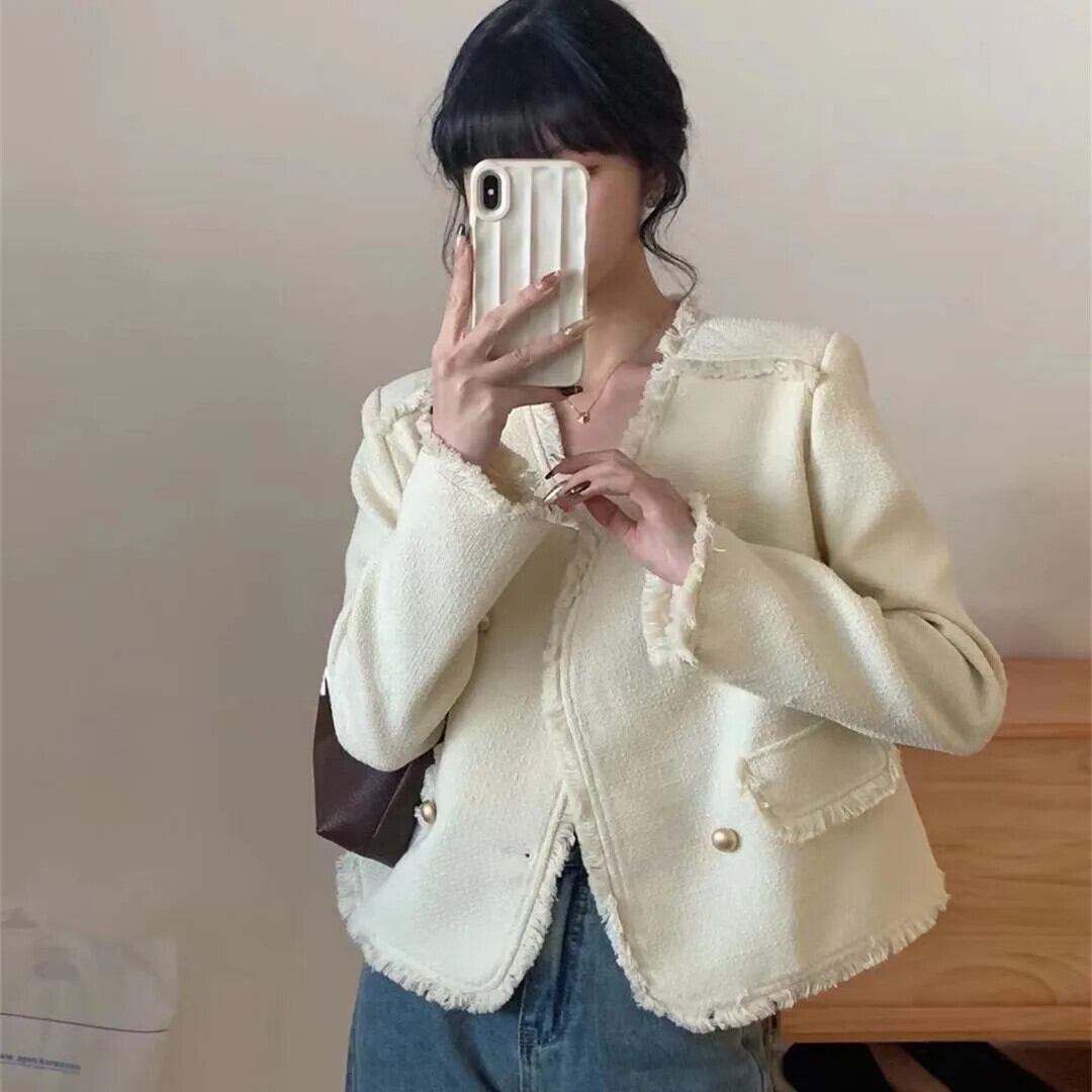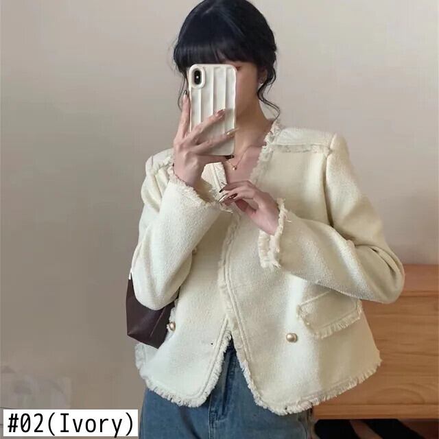春秋 - ツイード コート ジャケット レディース V ネック ピンク アプリコット アウト Casacos Chaqueta スプリング 春物 オータム 秋物 Vネック