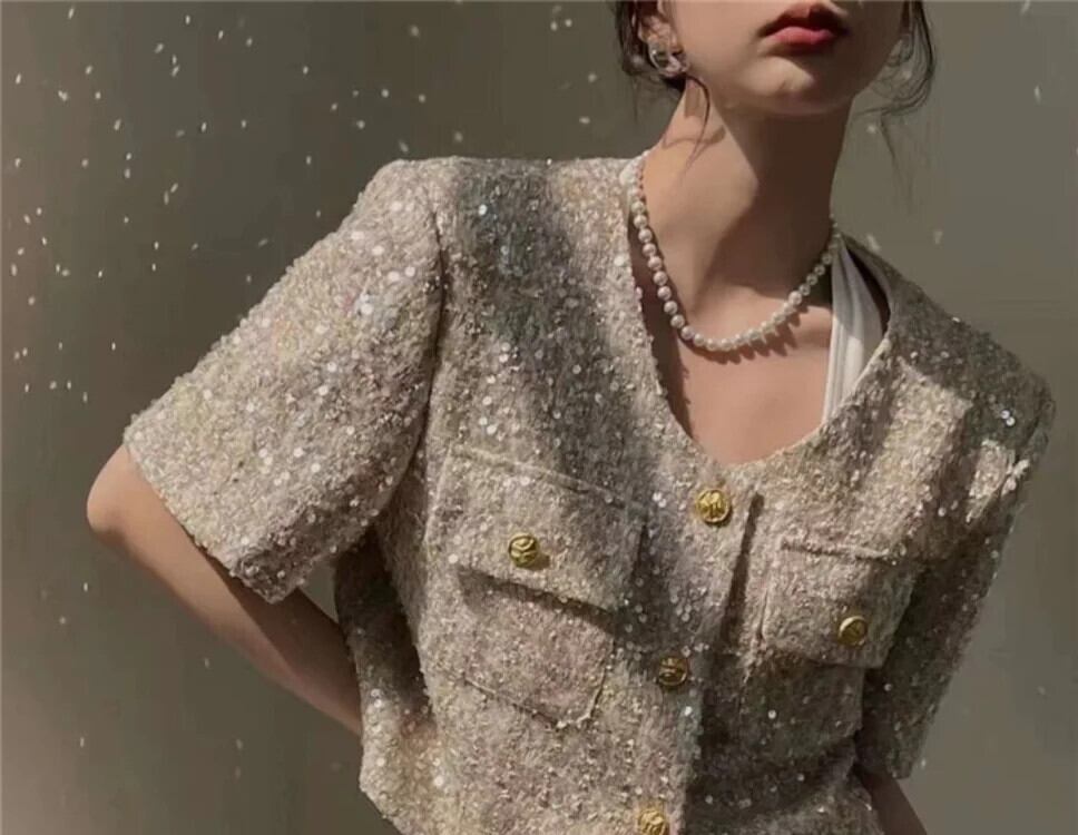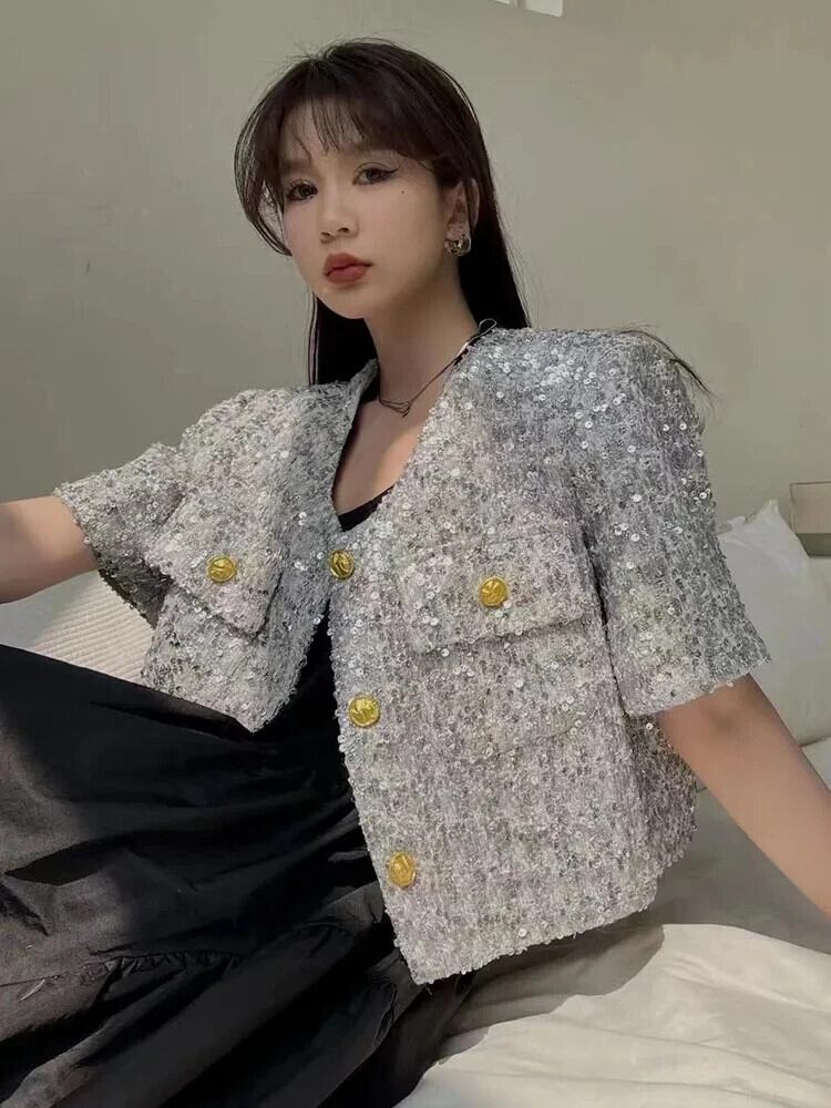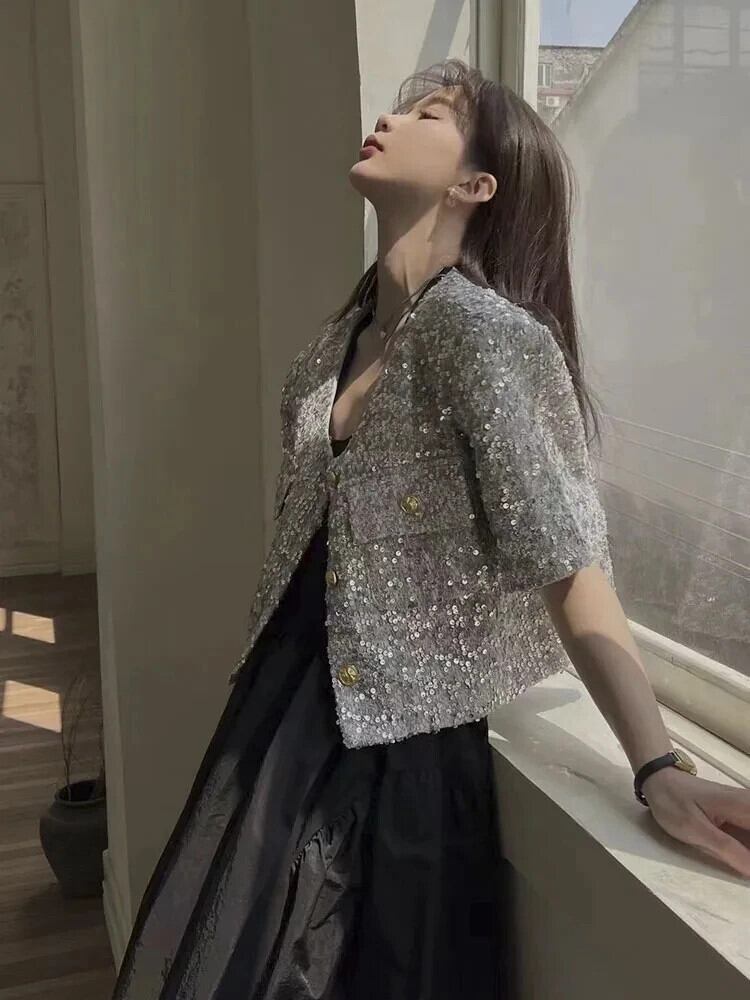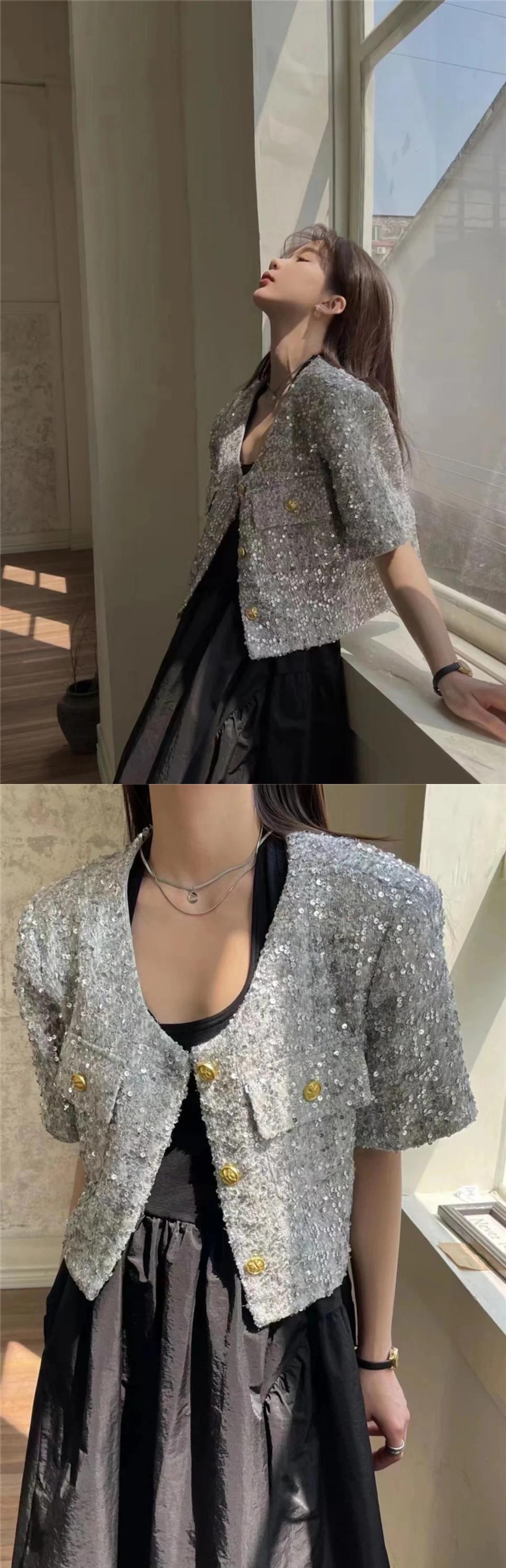 夏ルーズフィット V ネックシングルブレスト半袖スパンコールニット半袖コートジャケット ショート ハーフスリーブ サマー 夏物 Vネック