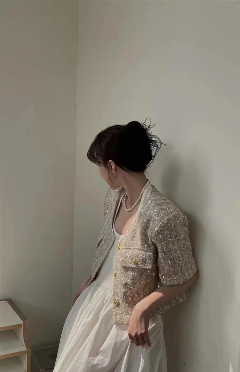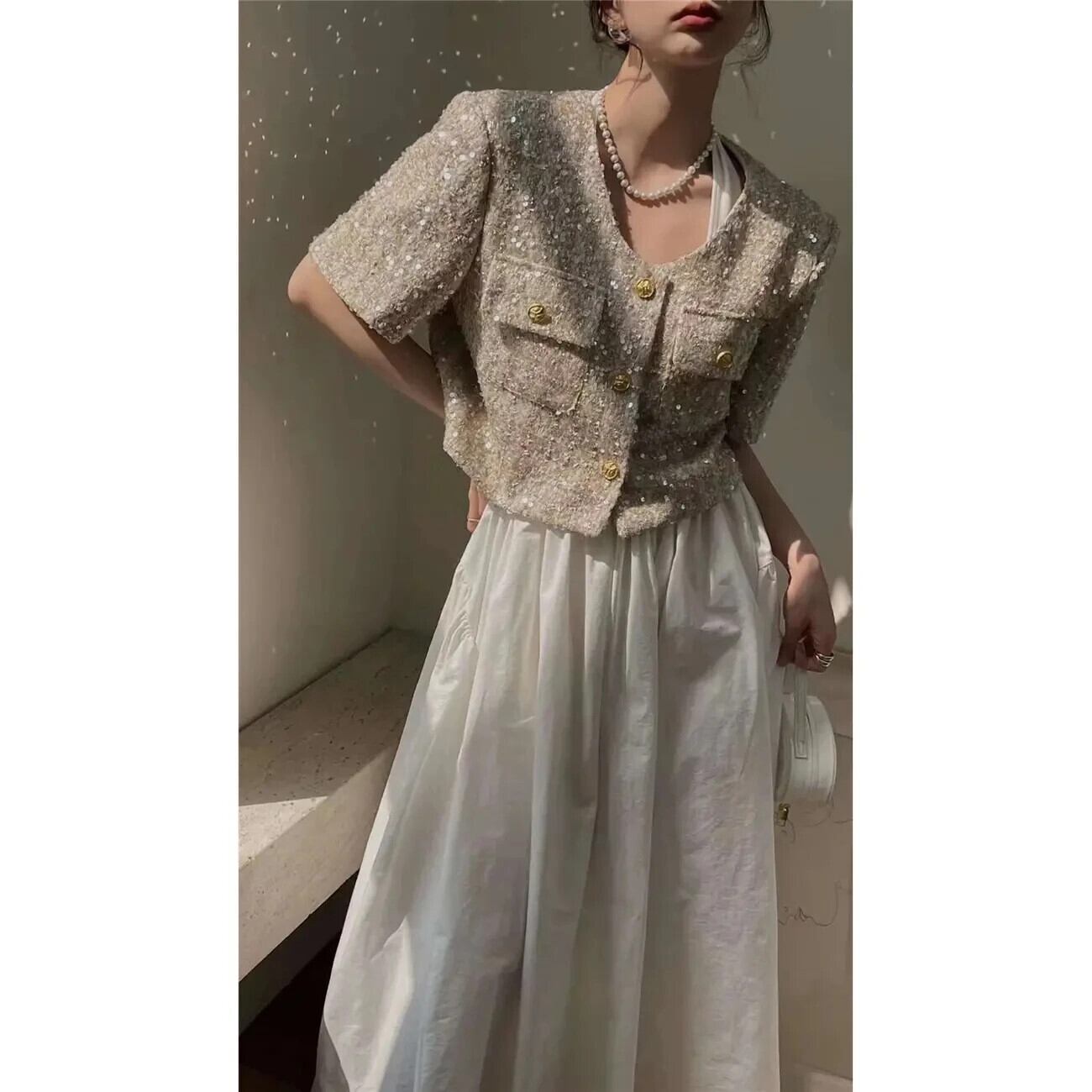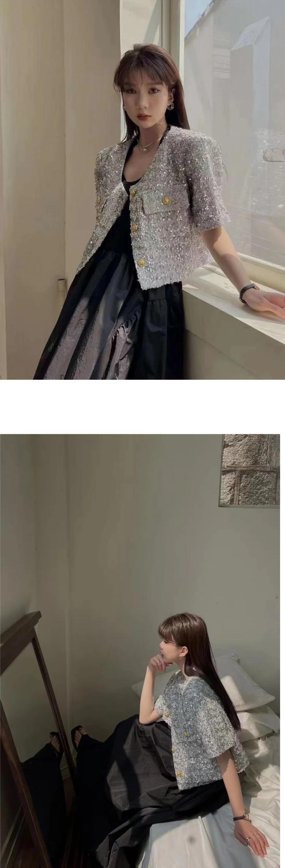 夏ルーズフィット V ネックシングルブレスト半袖スパンコールニット半袖コートジャケット ショート ハーフスリーブ サマー 夏物 Vネック