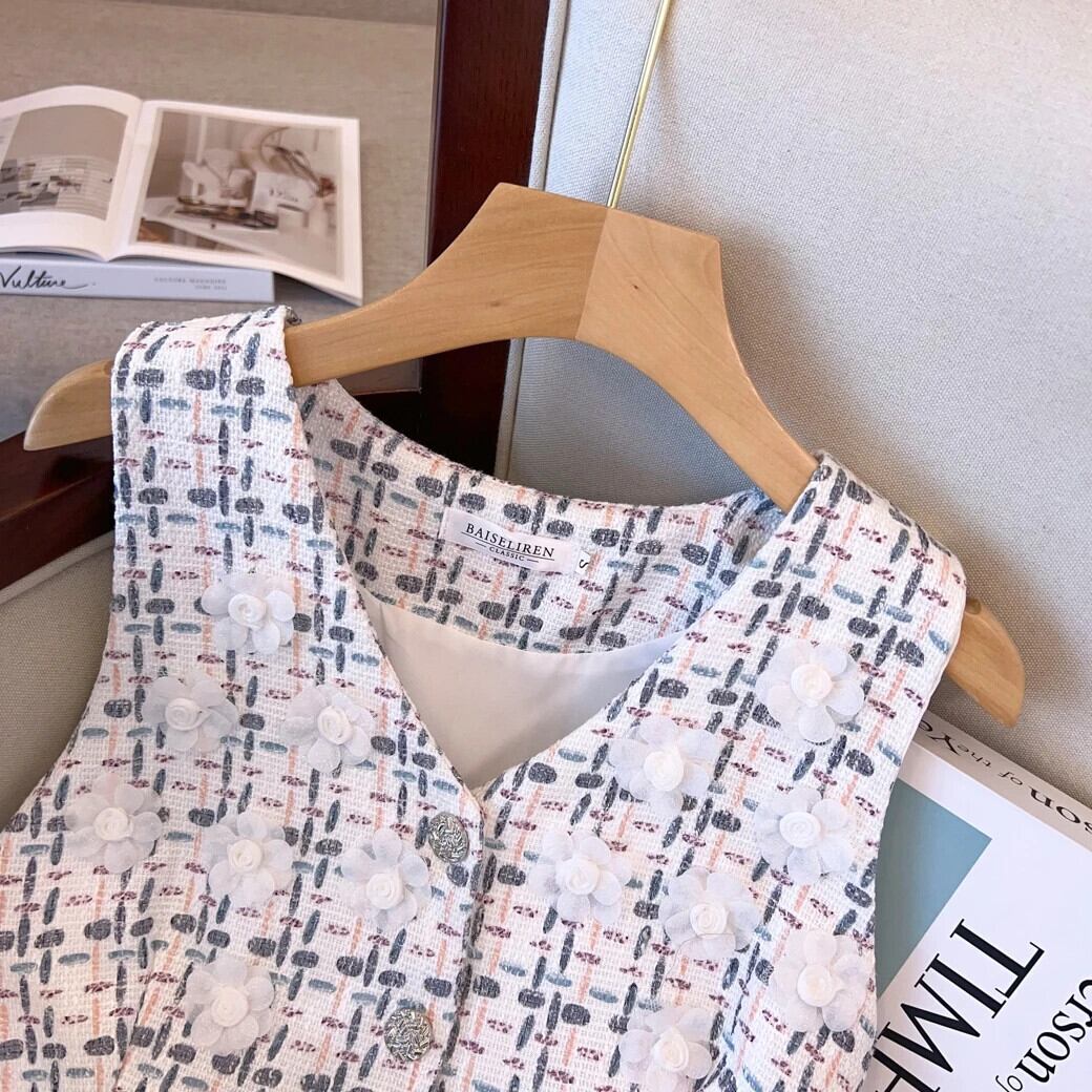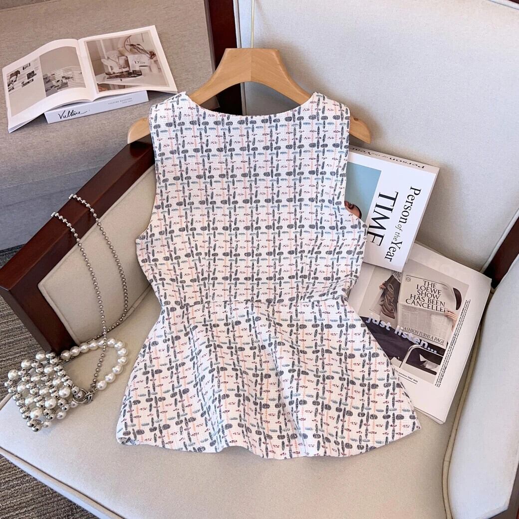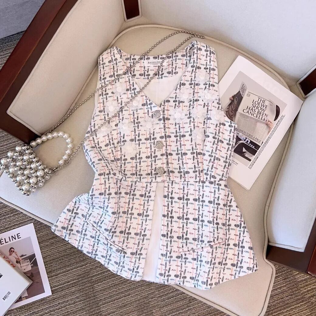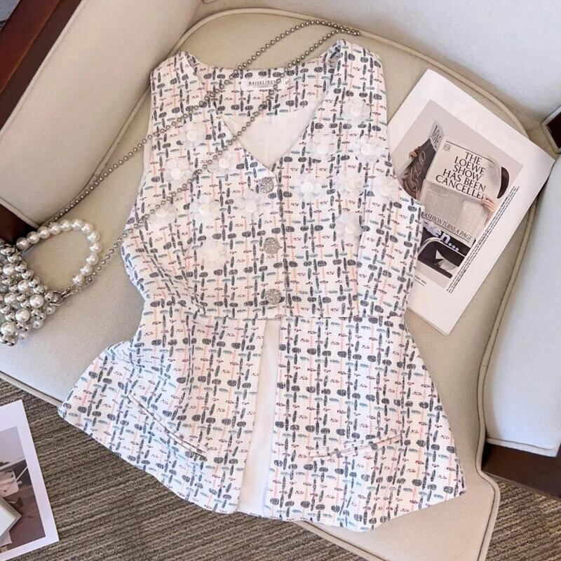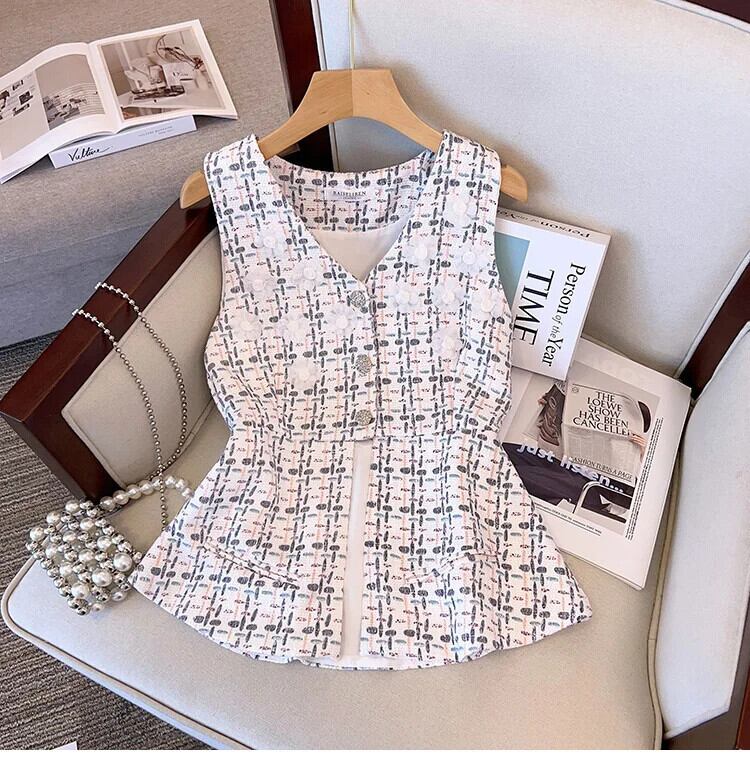 夏香り V ネック Uumbilical ベストコートウエストストリートチェック柄ツイードトップス サマー 夏物 Vネック