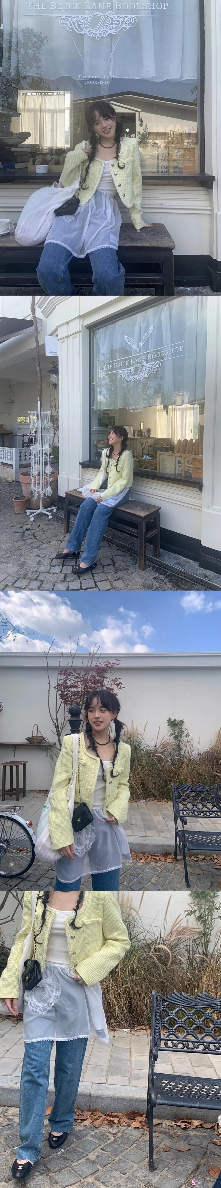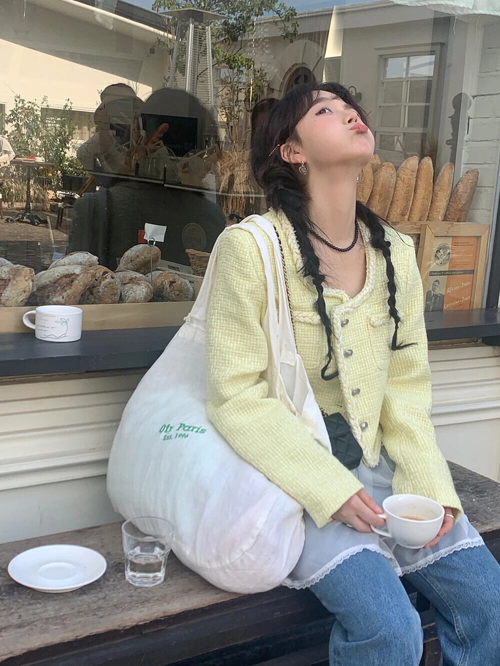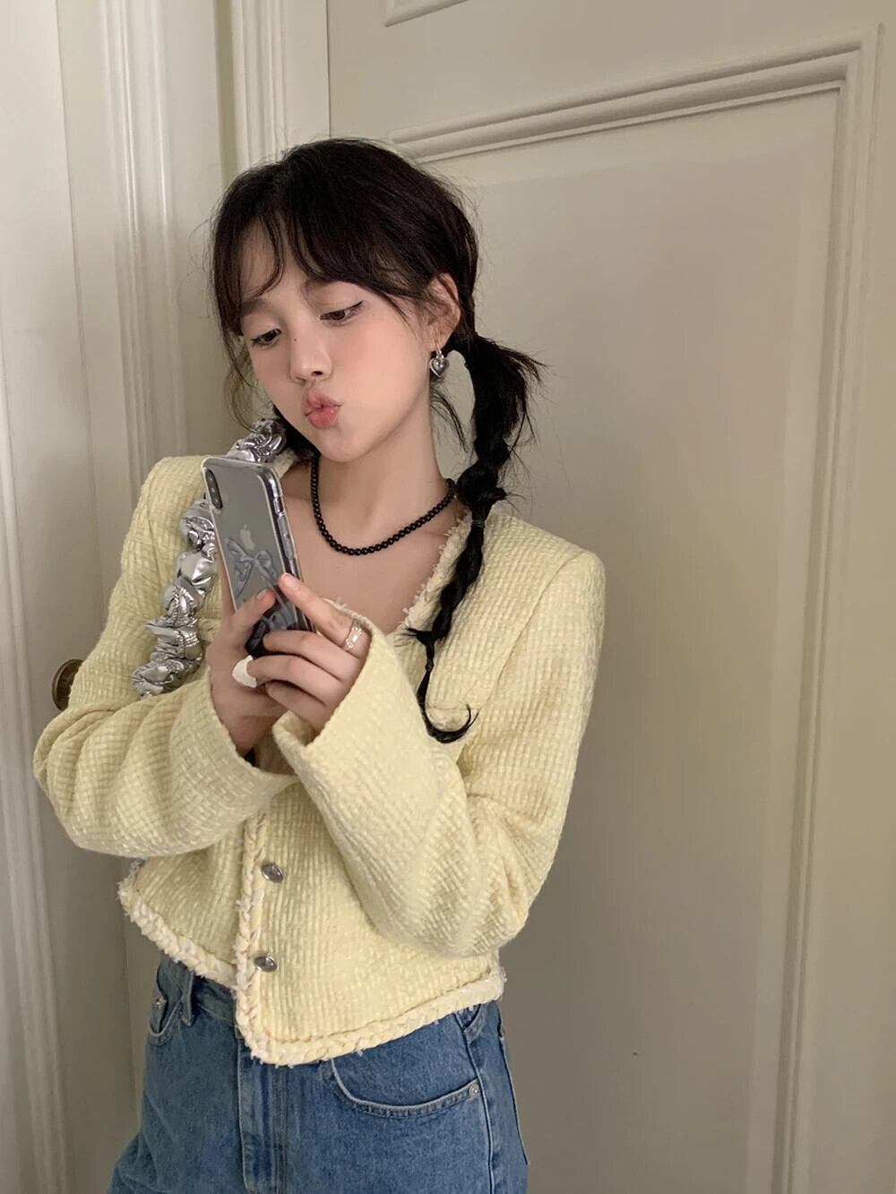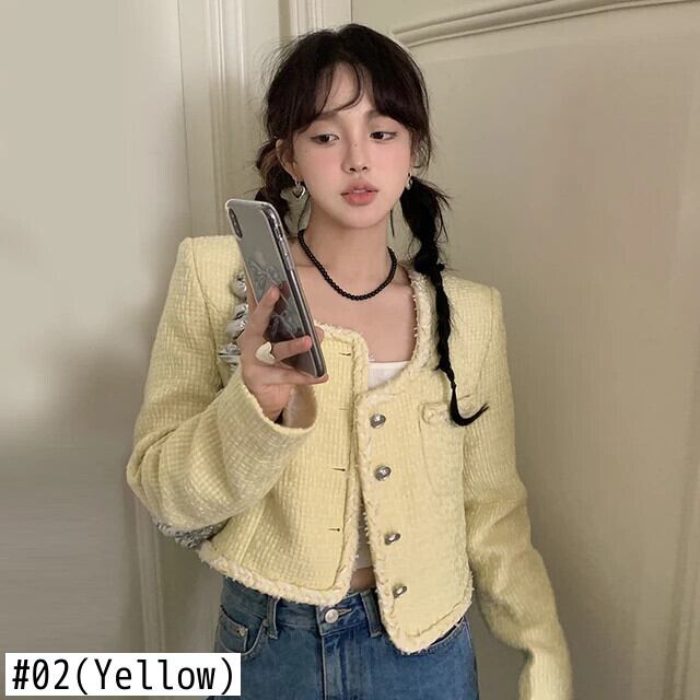 シック秋フランス香り U ネックメタルボタンルーズ長袖ショートパターンツイードコートジャケット ロング オータム 秋物