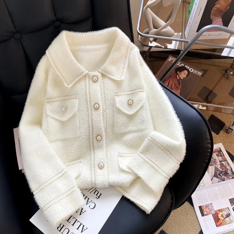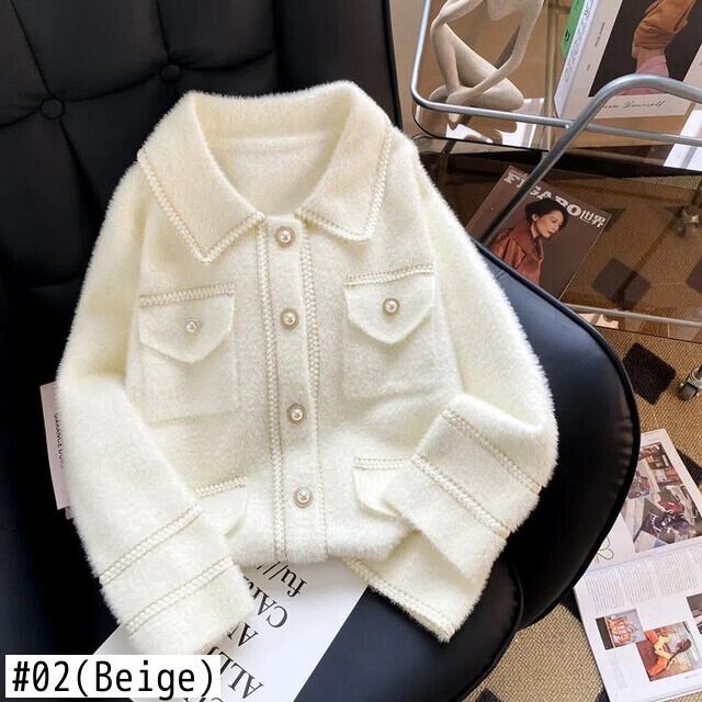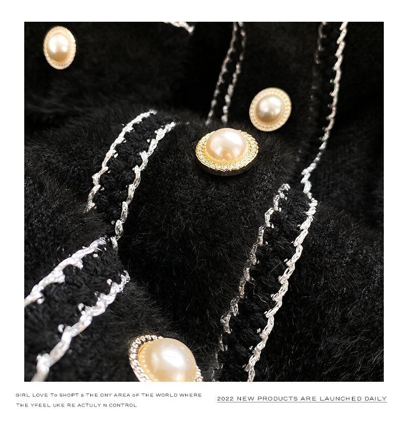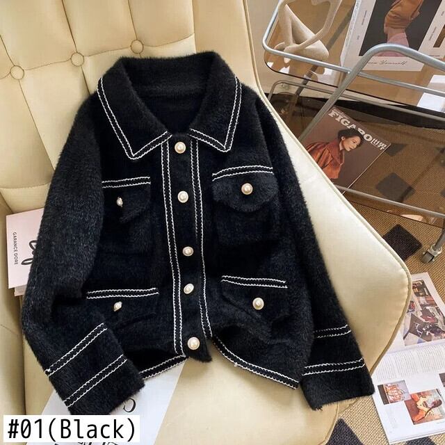白黒ラペルパールボタン秋冬ショートニットカーディガンコート ホワイト ブラック オータム 秋物 ウィンター 冬物 真珠