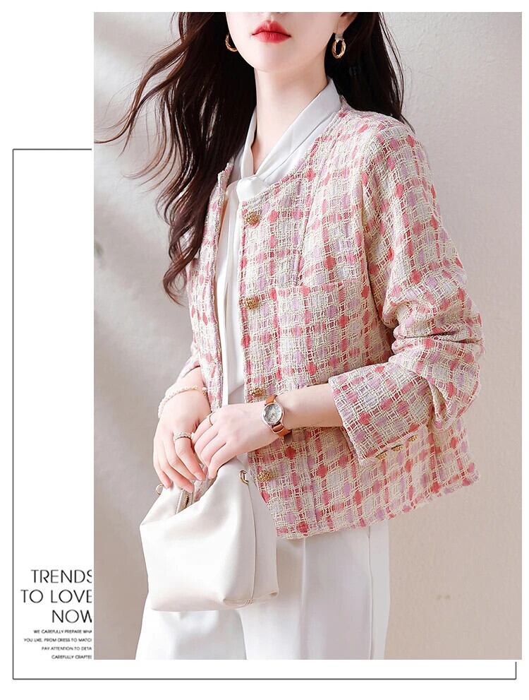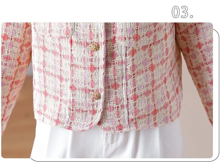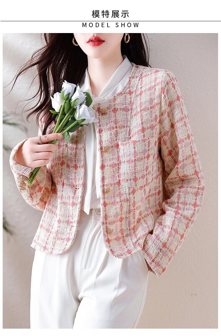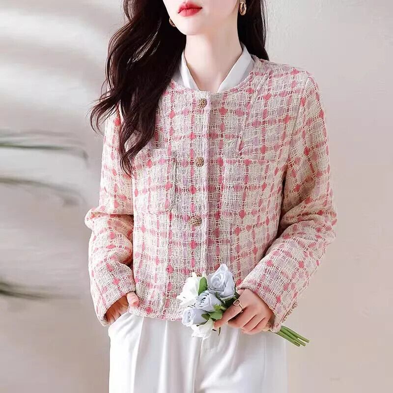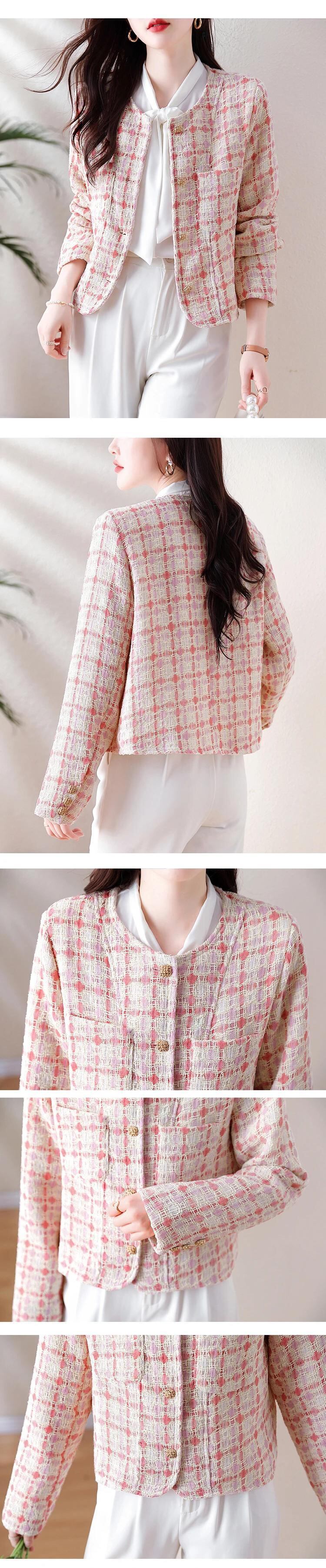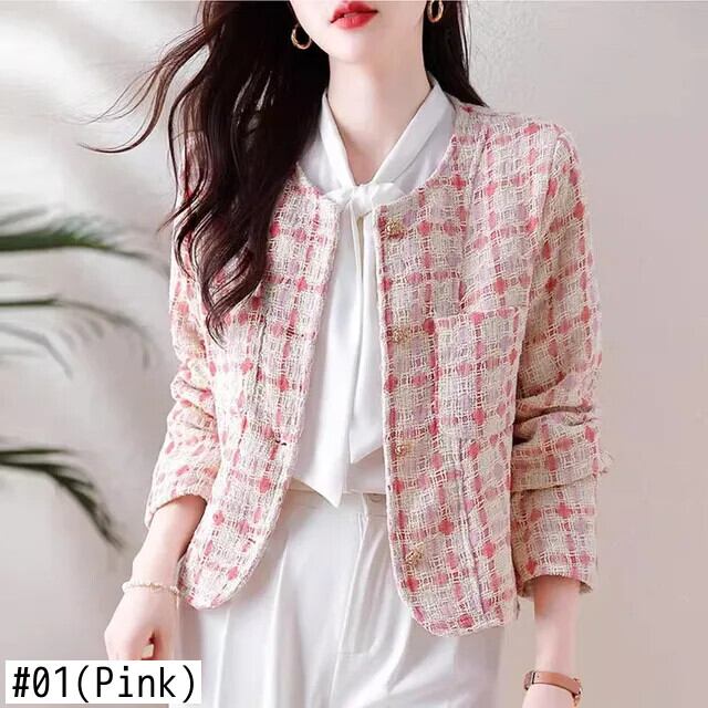 ピンクチェック柄香りよいラフツイードコート秋/冬気質ショートウールジャケット オータム 秋物 ウィンター 冬物