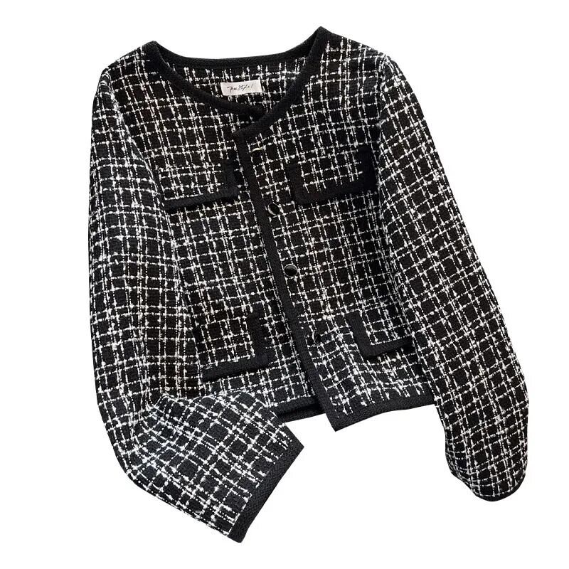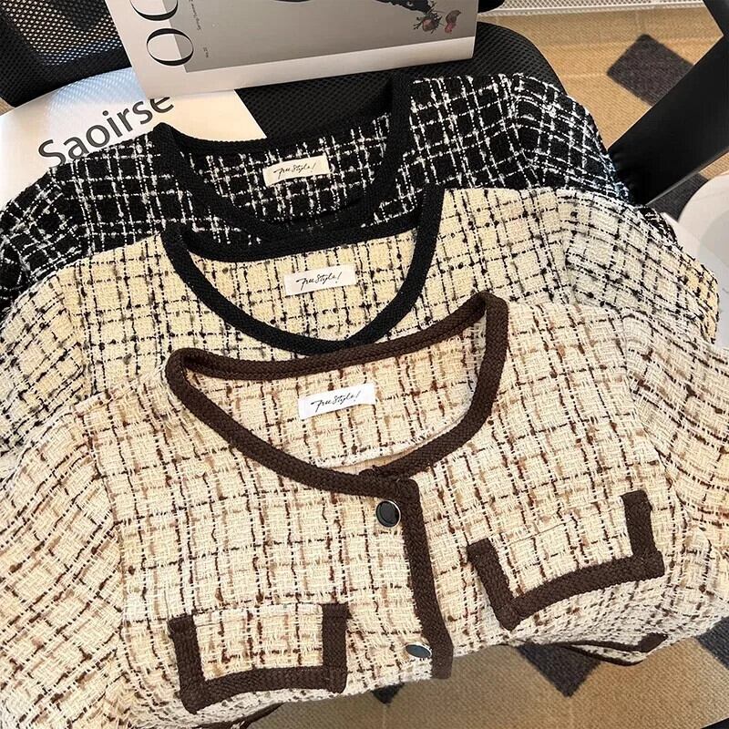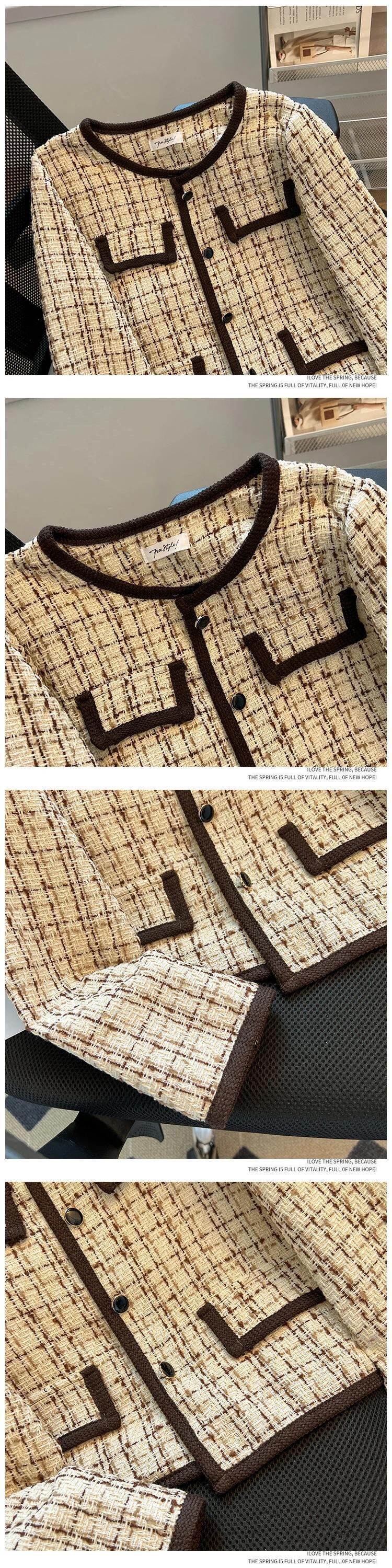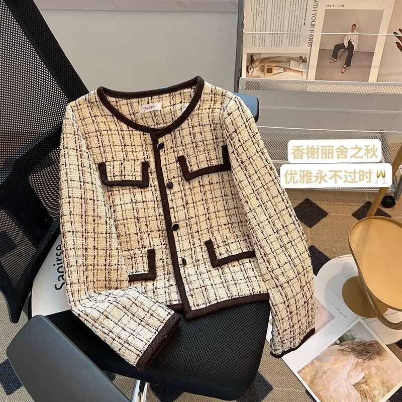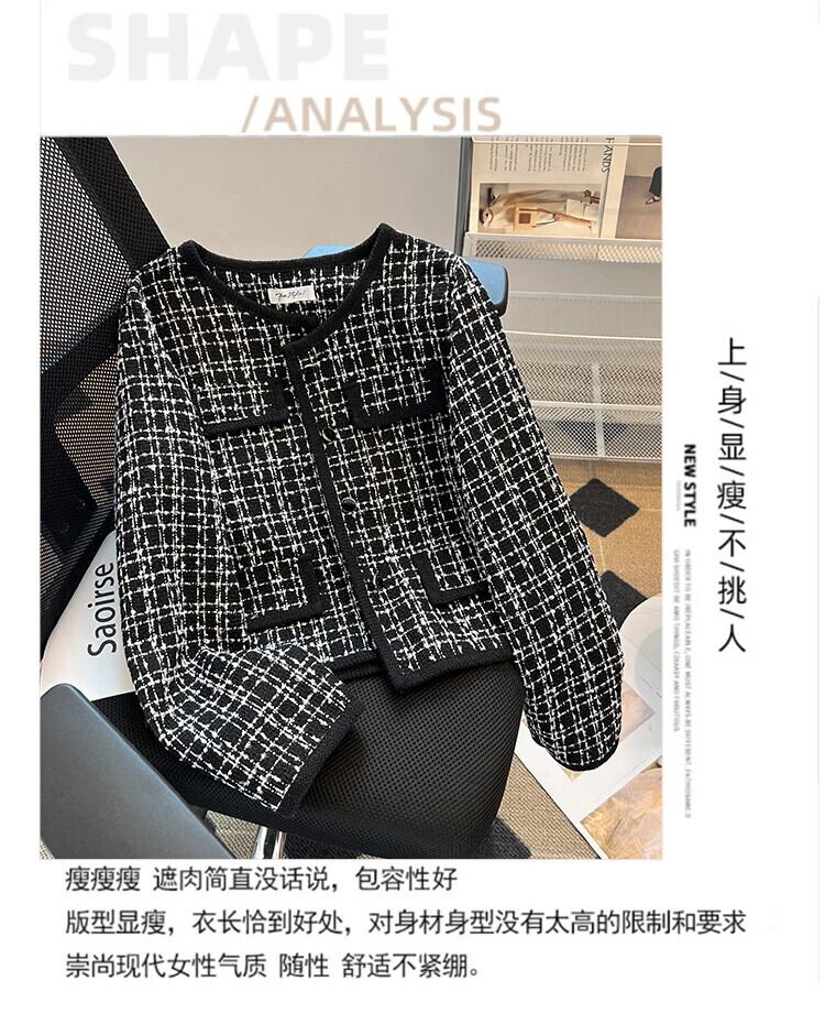 粗いウールチェック柄ショートジャケット春秋シングルブレストコート スプリング 春物 オータム 秋物