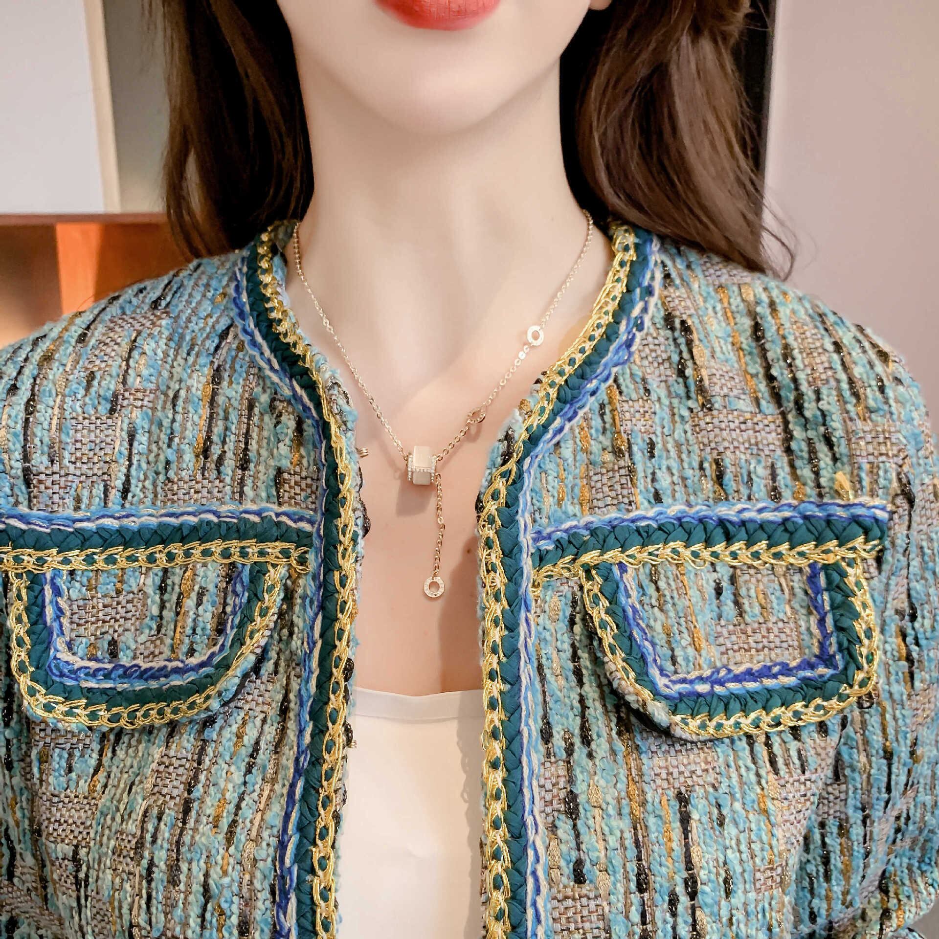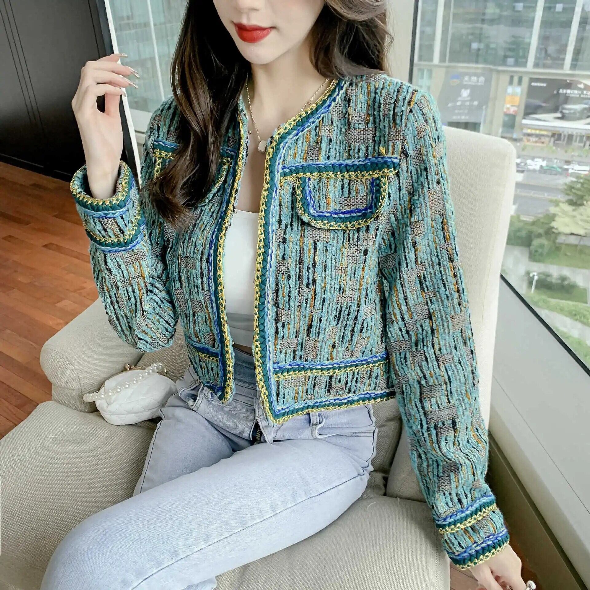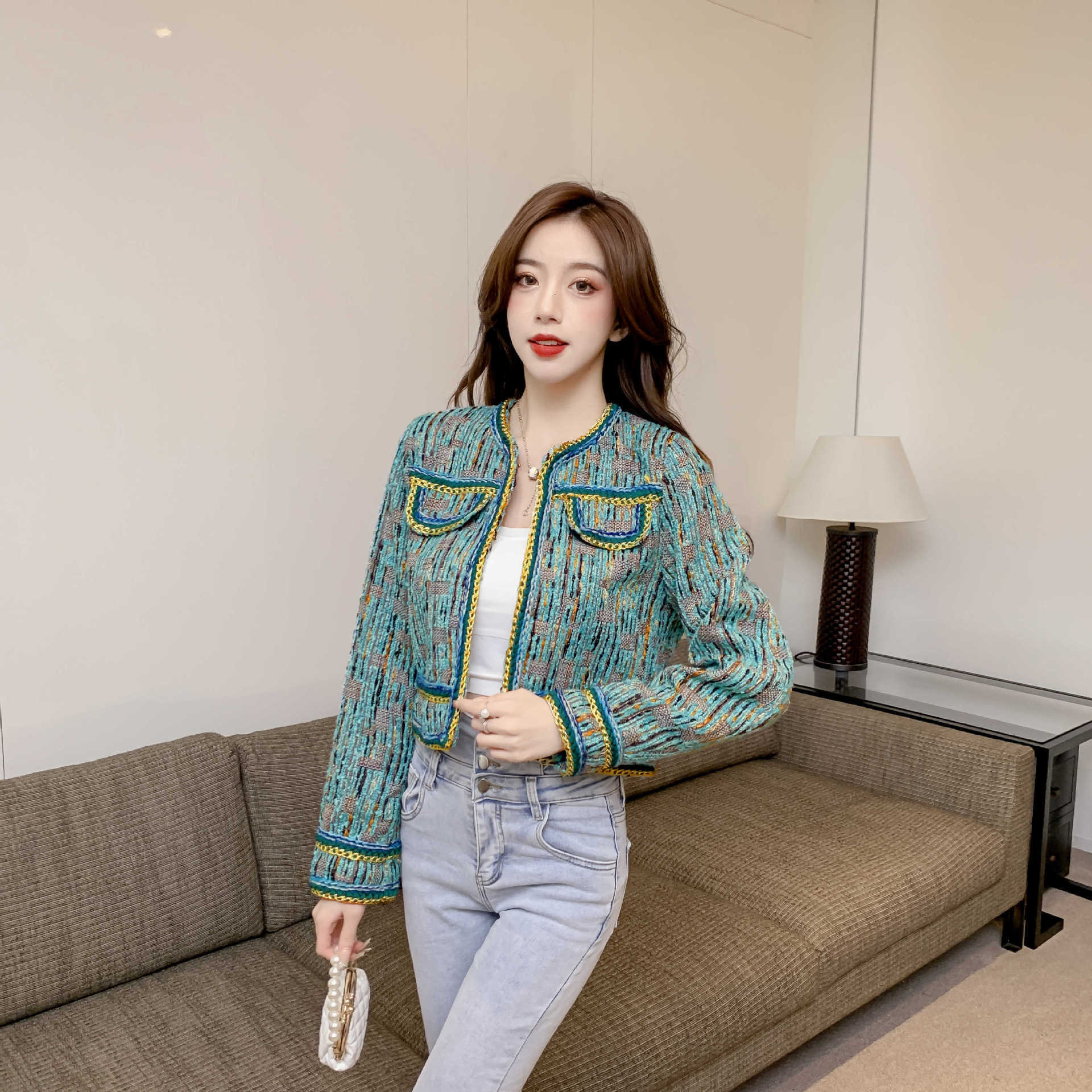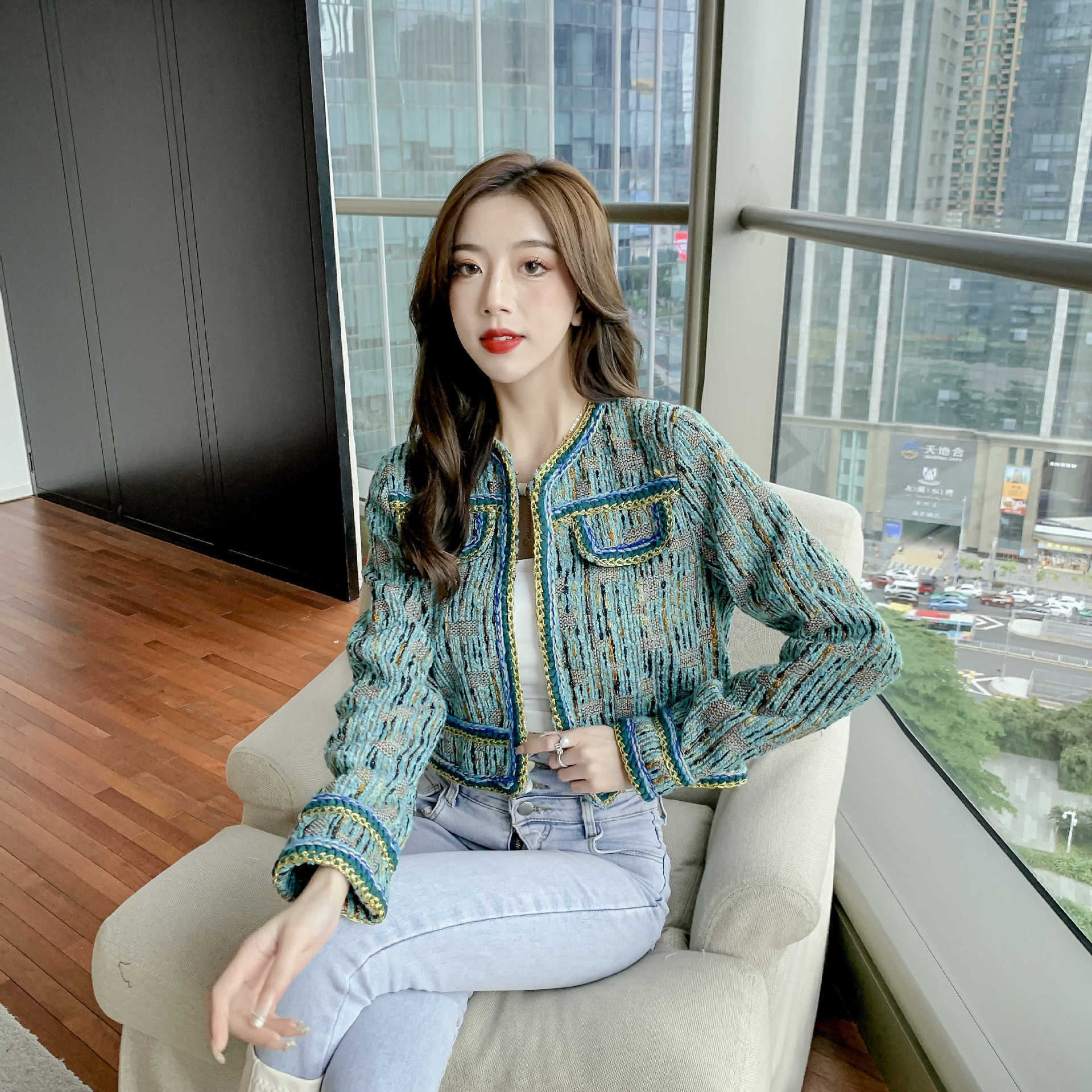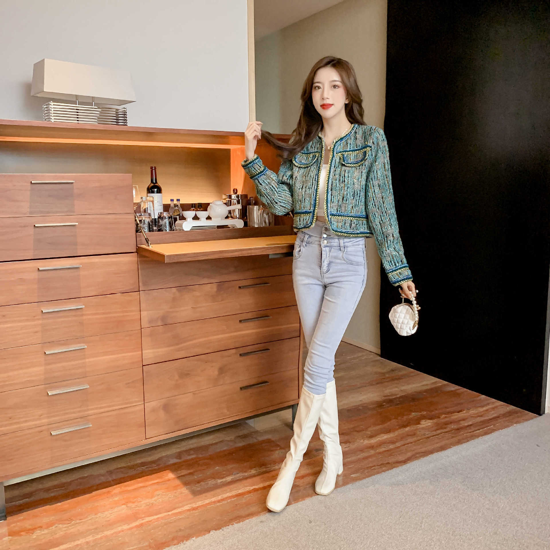 ショートシック秋レトロセレブウエストツイードジャケットラウンドネックニット長袖コート ロング オータム 秋物 Oネック