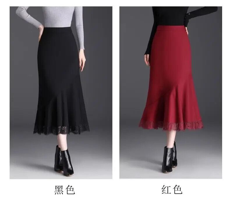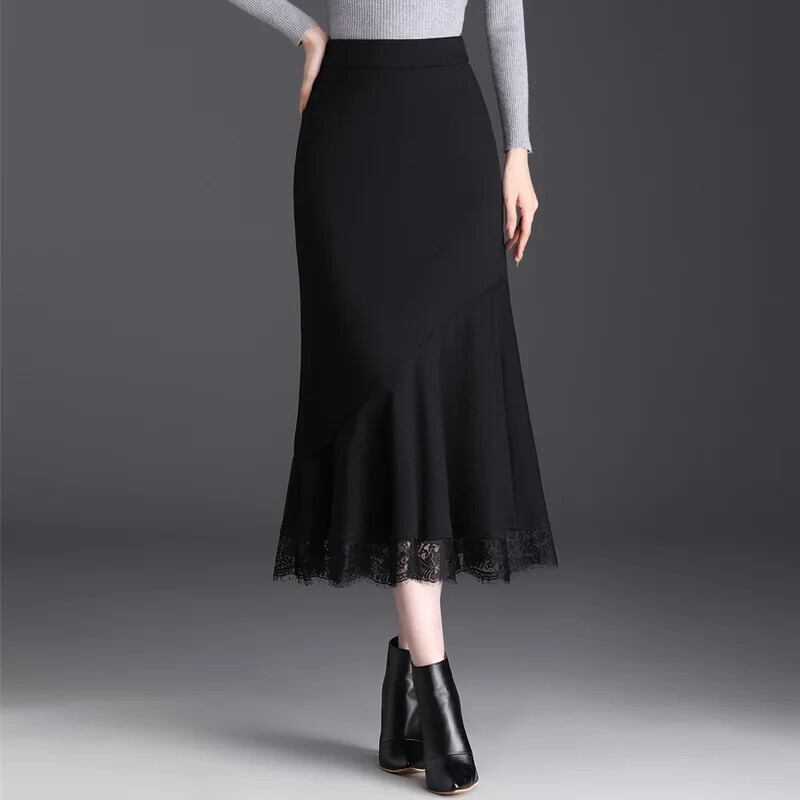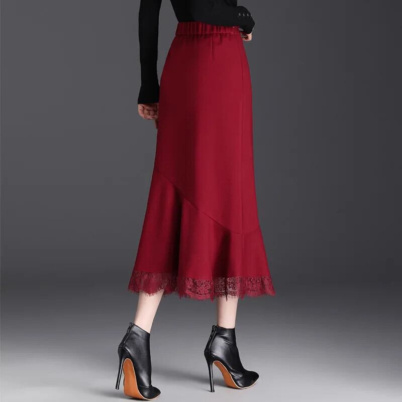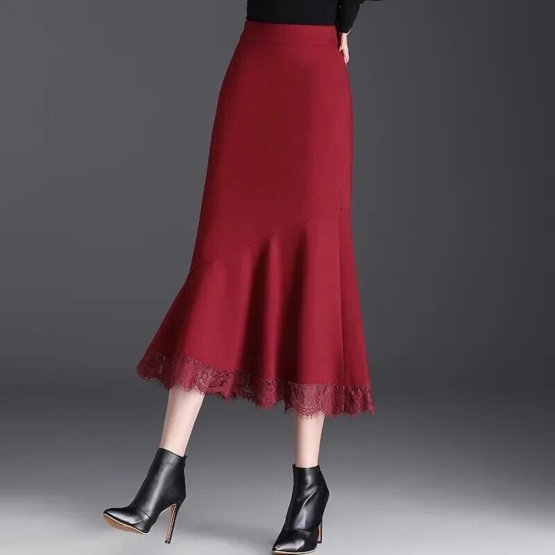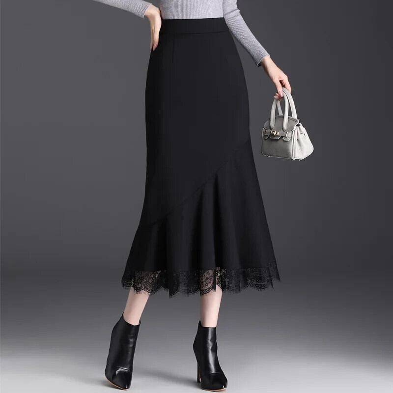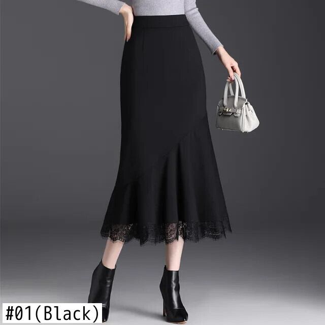 レディース春秋ミドル丈ウエストAラインレースフィッシュテールスカート スプリング 春物 オータム 秋物