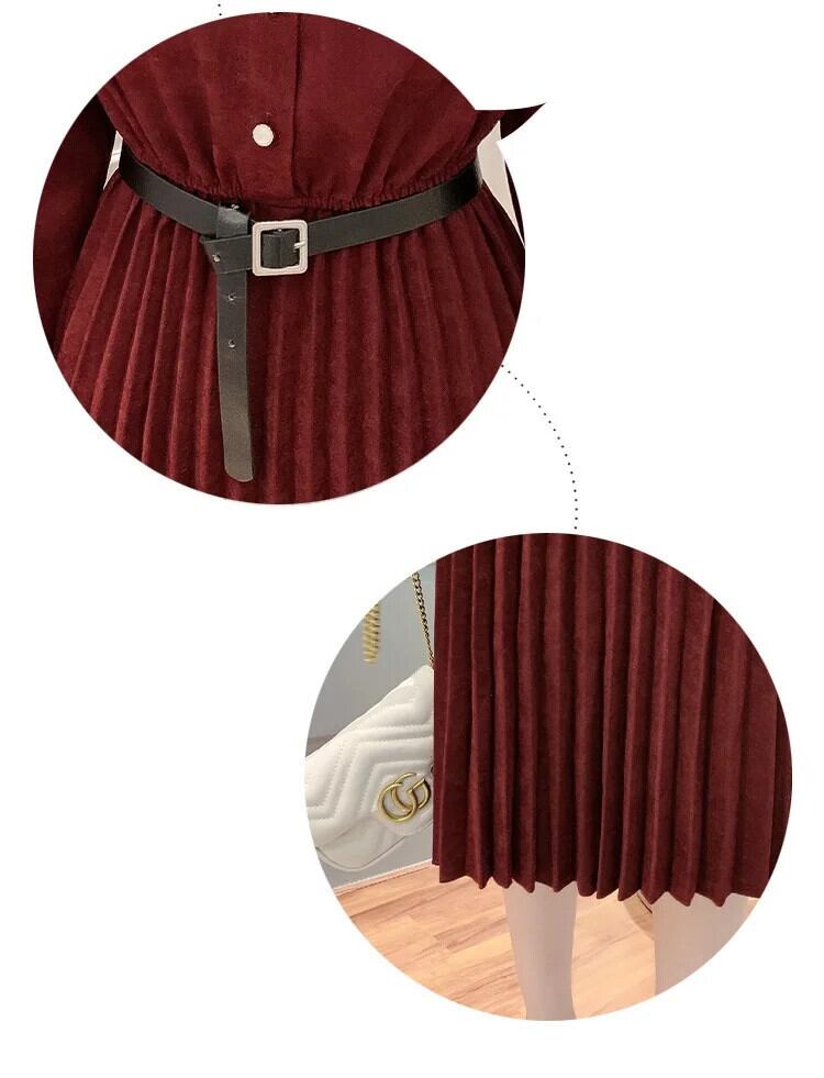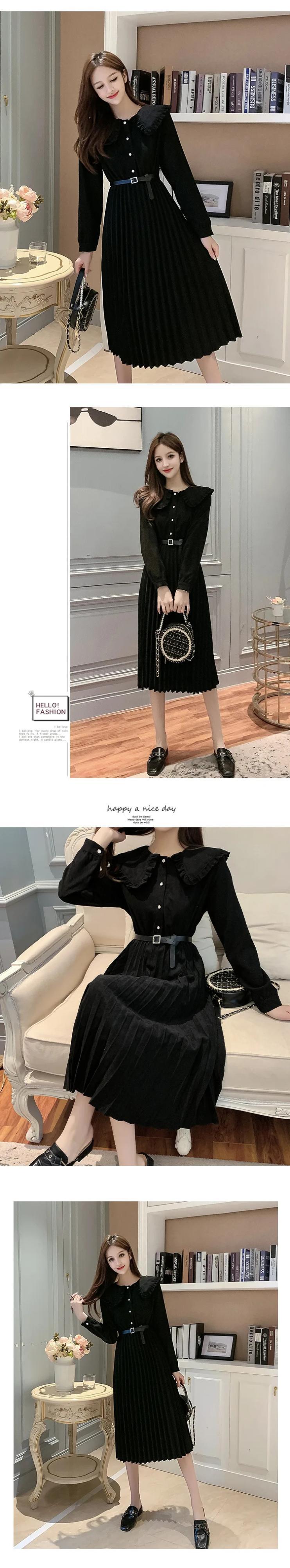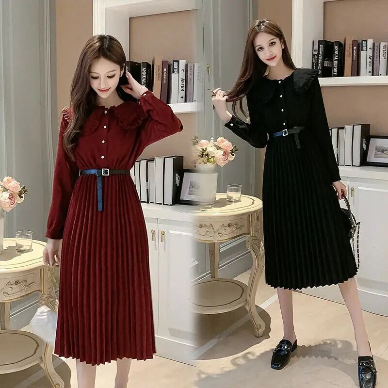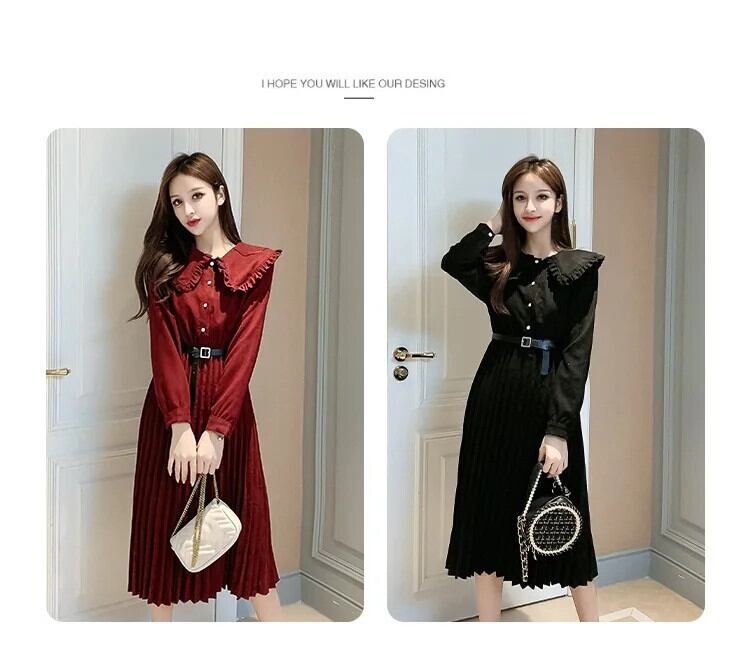 人形襟春と秋レトロプリーツ長袖ミッドレングスドレス ロング スプリング 春物 オータム 秋物