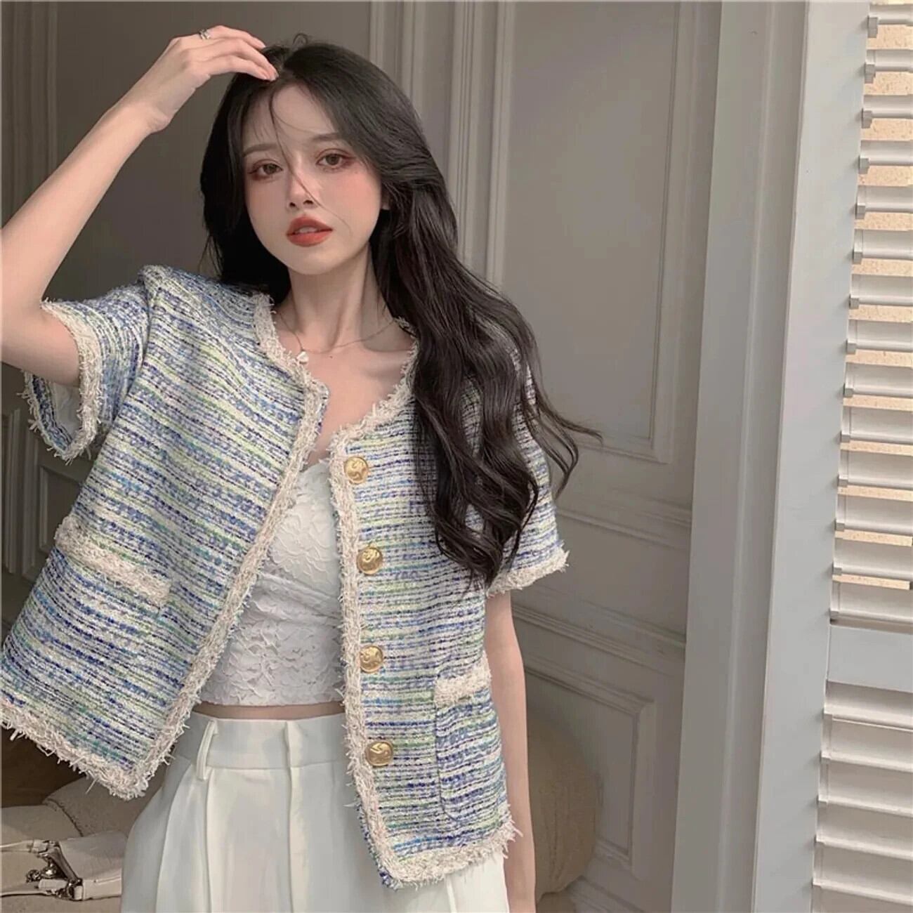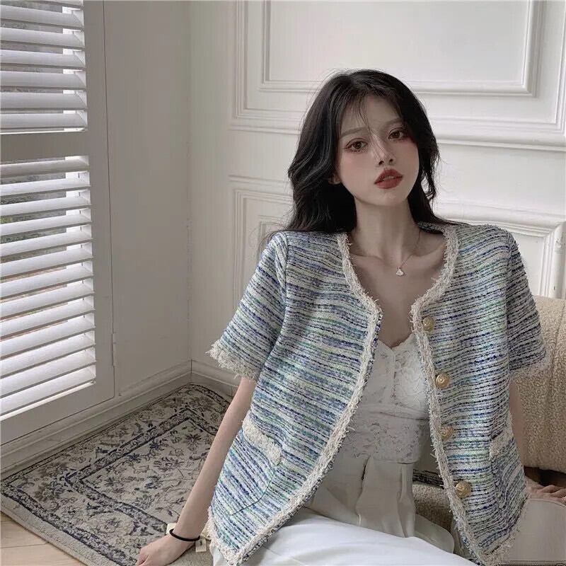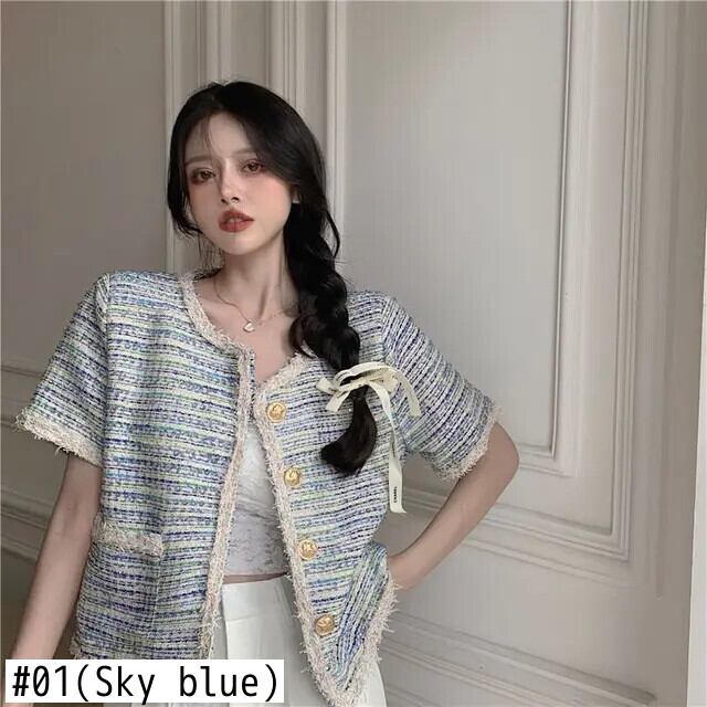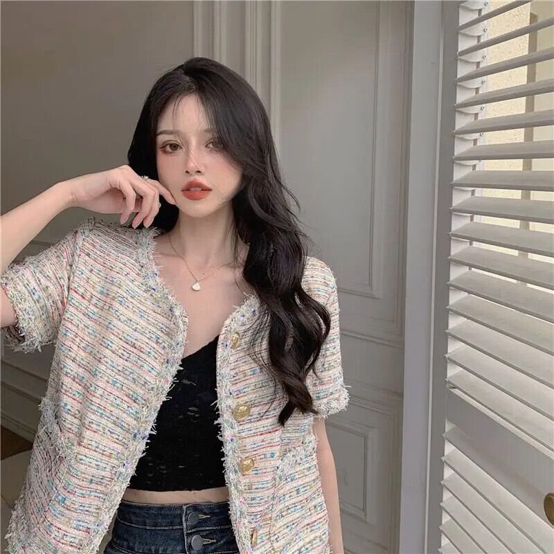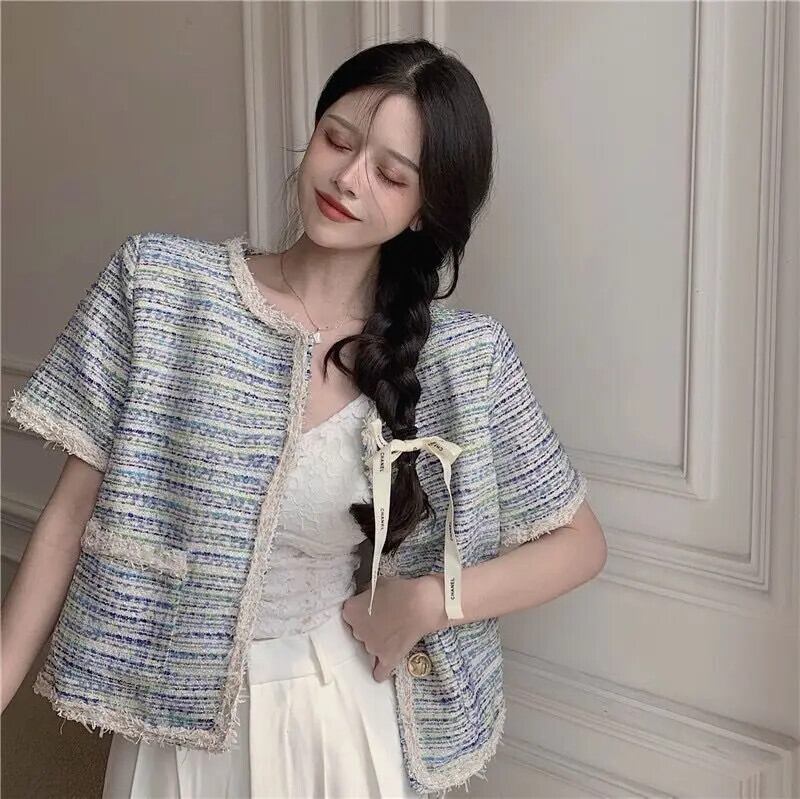 フレグランスコート夏多用途半袖スリムフィットセレブスタイルラウンドネックツイードジャケット ショート ハーフスリーブ サマー 夏物 Oネック