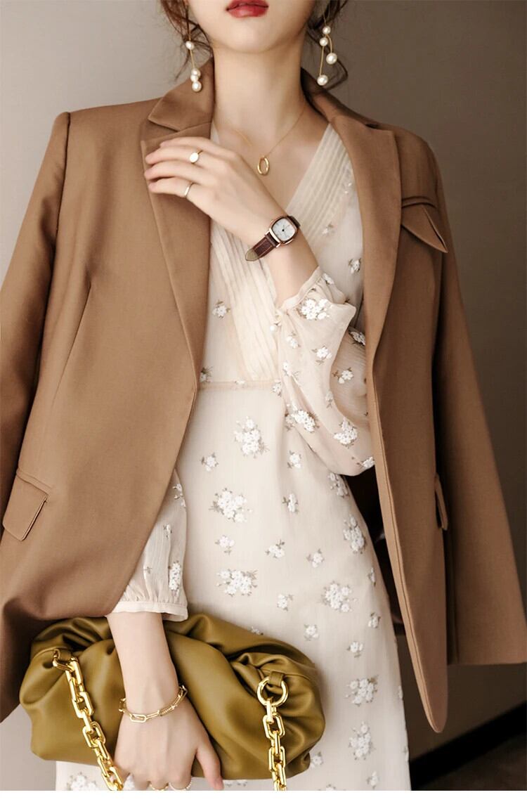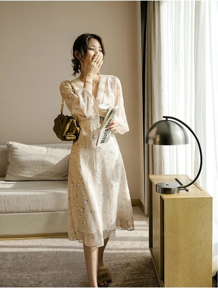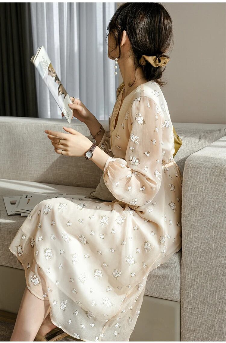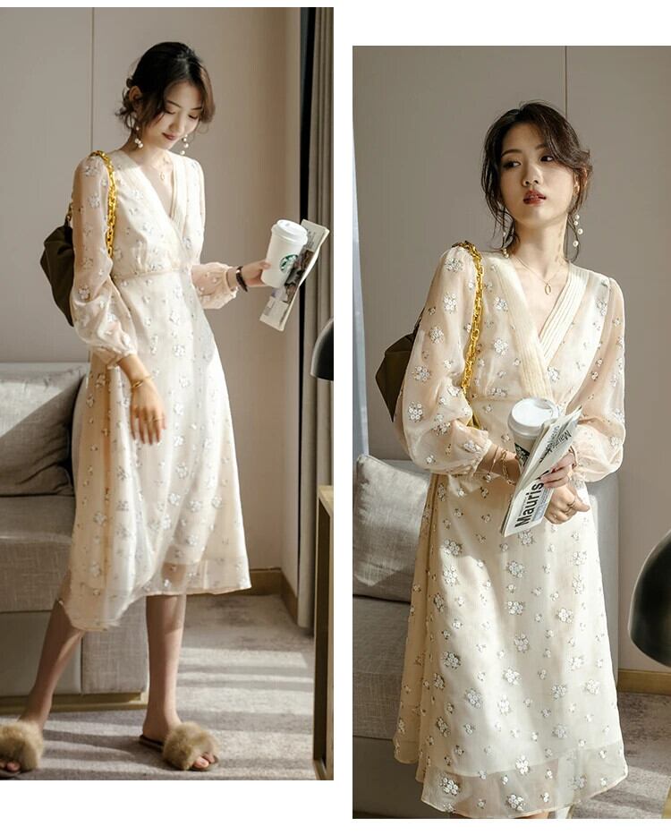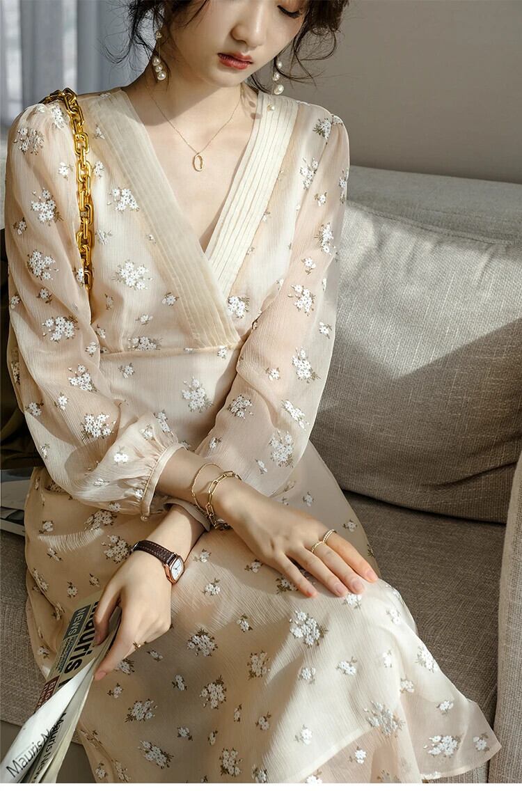 長袖膝丈 V ネック気質秋花シフォンドレス ロング オータム 秋物 花柄 Vネック