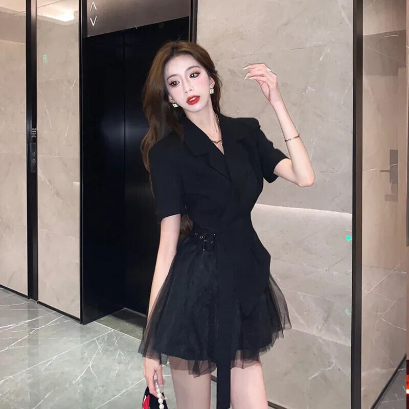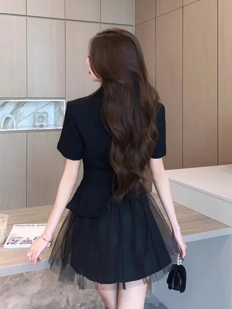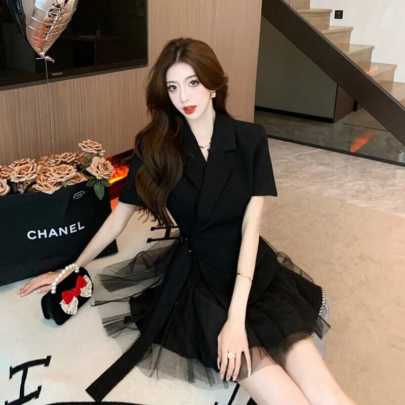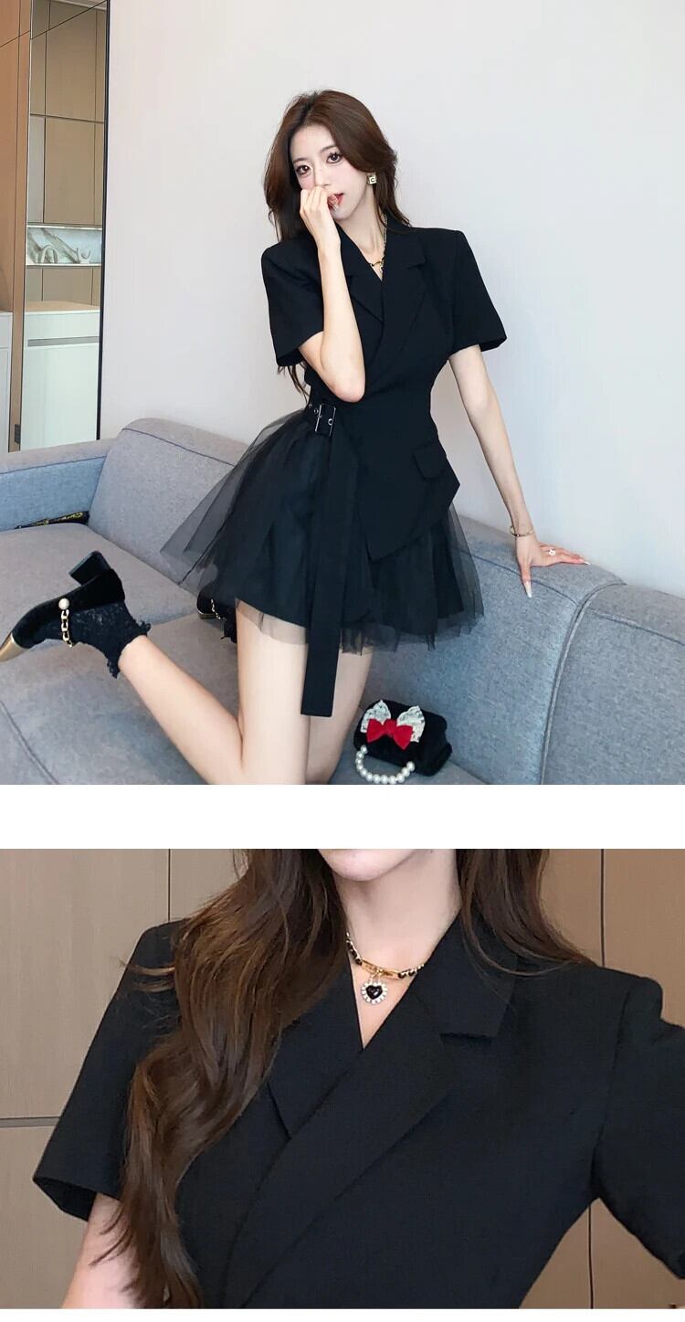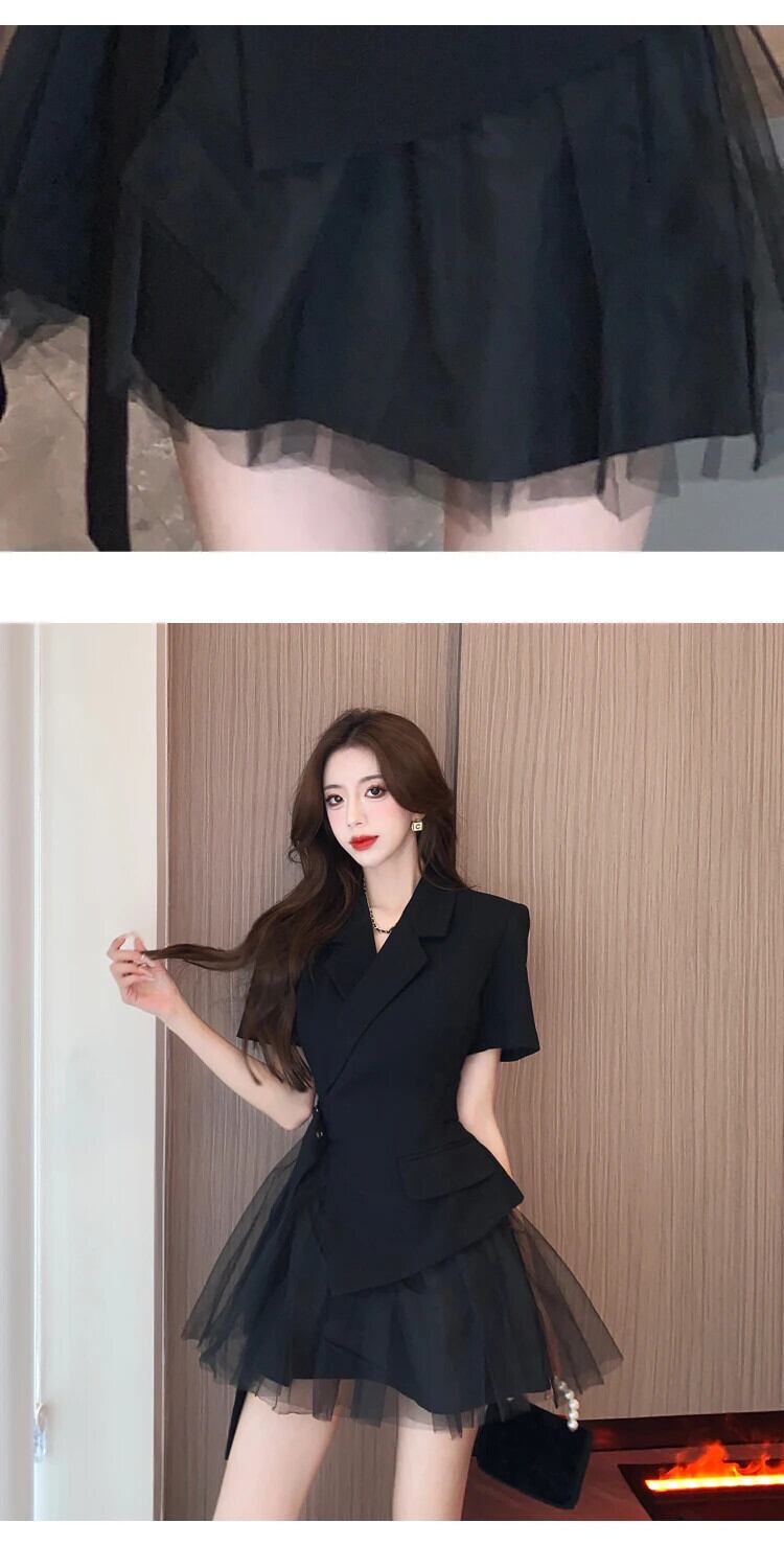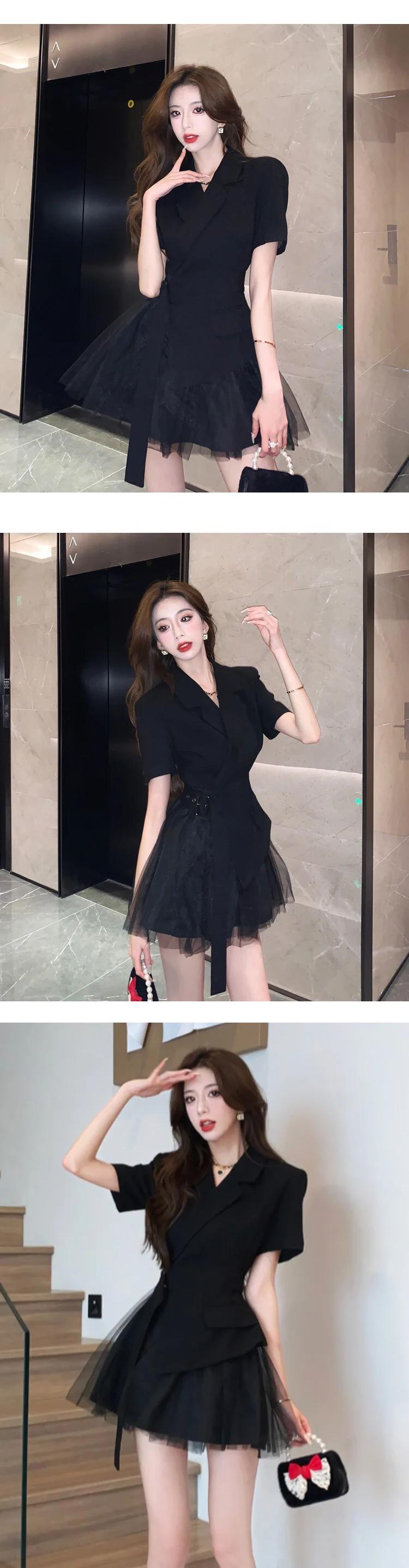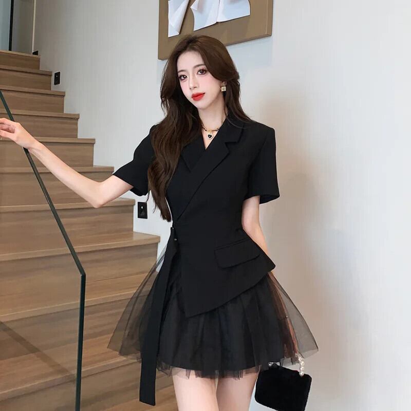 夏ふわふわメッシュパッチワーク不規則フェイクツーピースフレグランススーツドレス サマー 夏物