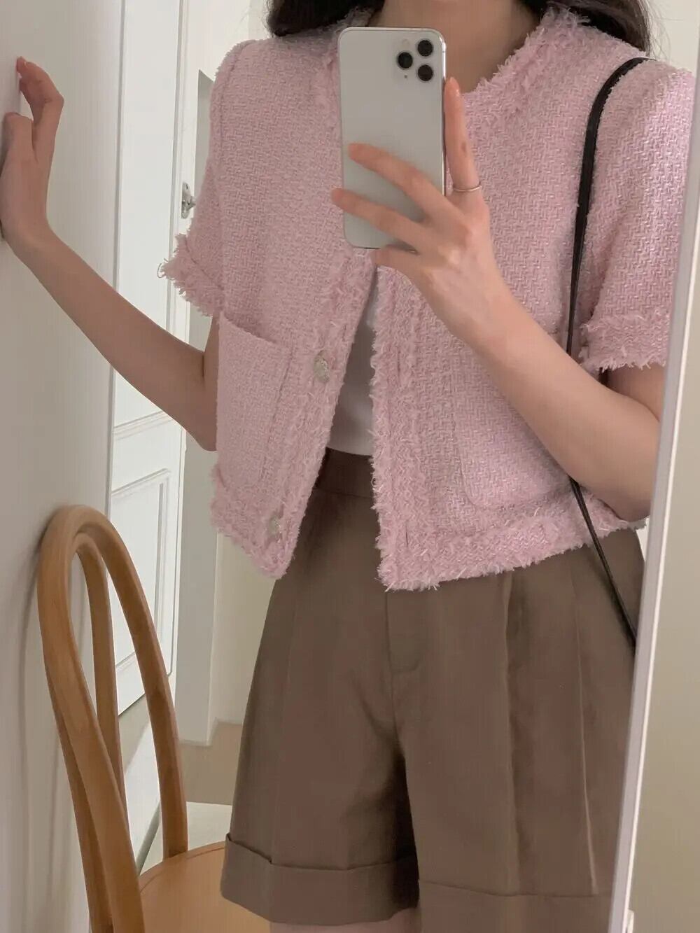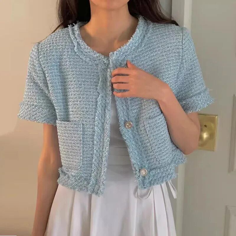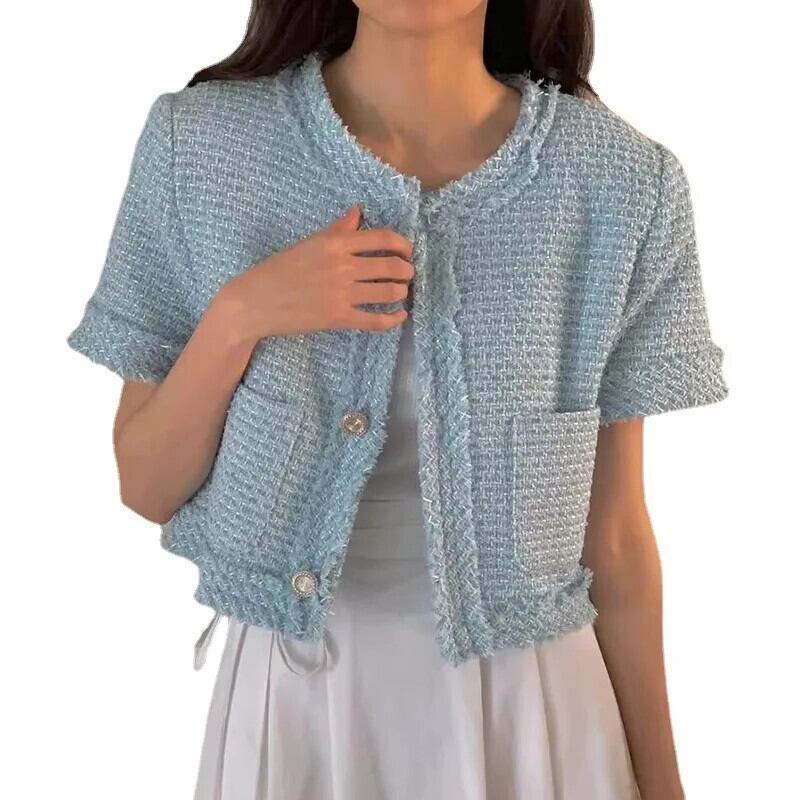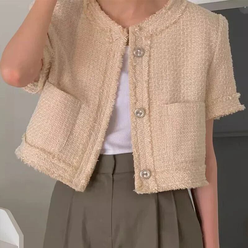 サマーコレクションオンライン滑走路コートラウンドネックパッチワークフリンジラフエッジルーズ半袖ツイードジャケット ショート ハーフスリーブ 夏物 Oネック