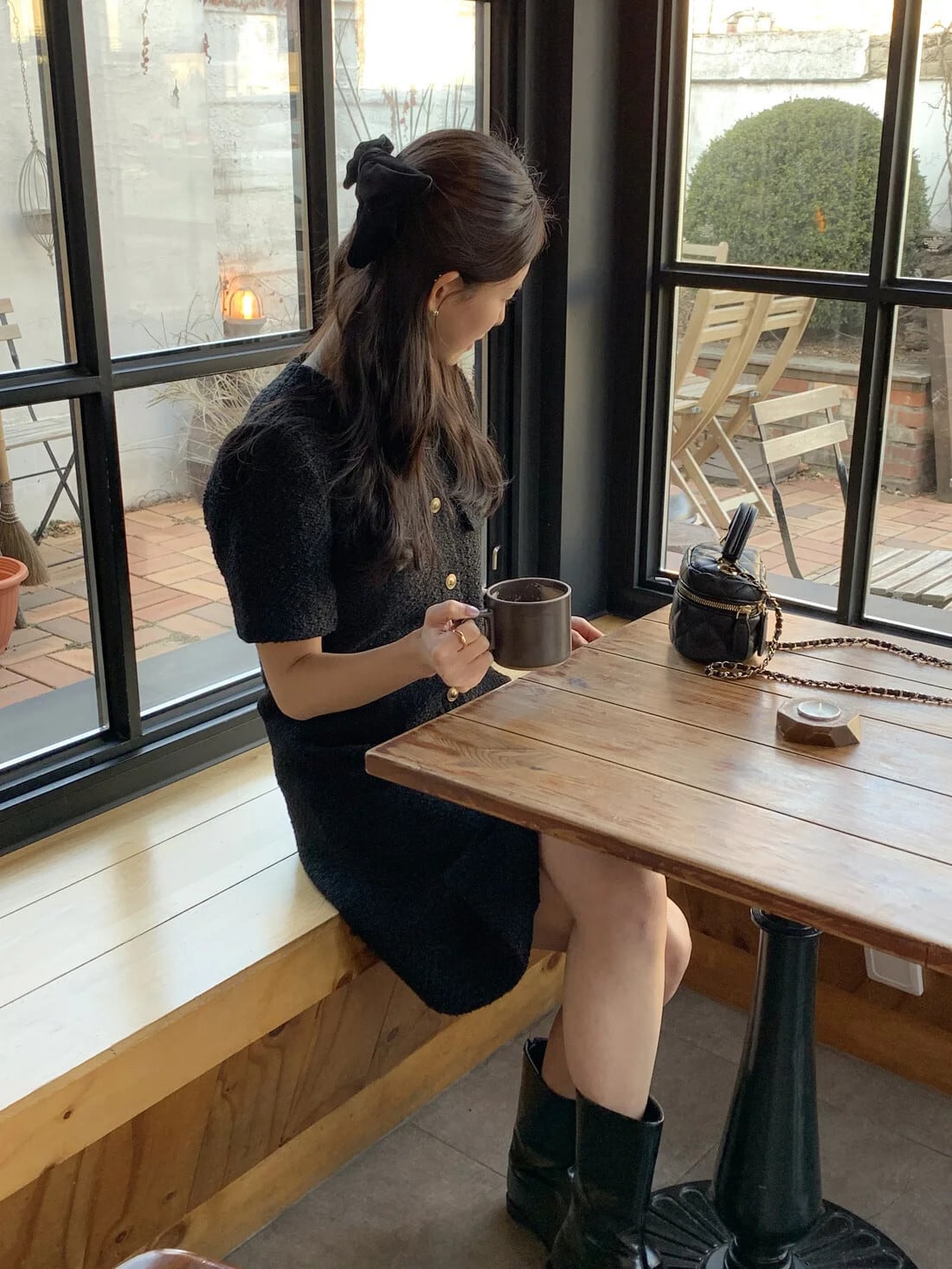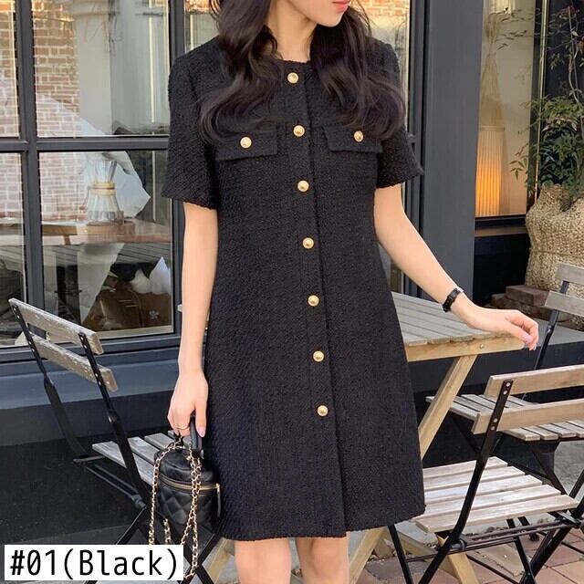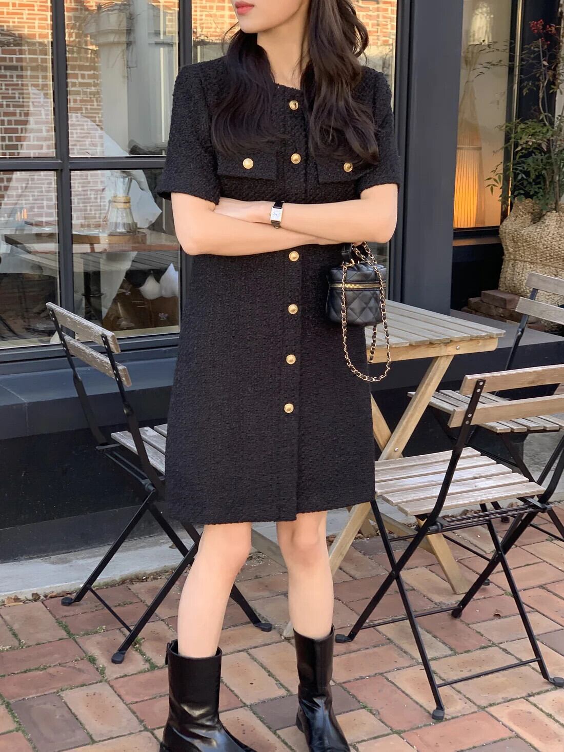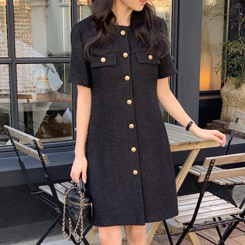 夏黒レトロ香りラウンドネックパールボタン厚いツイードドレス ブラック サマー 夏物 Oネック 真珠
